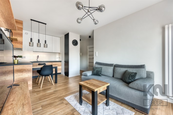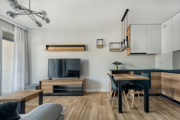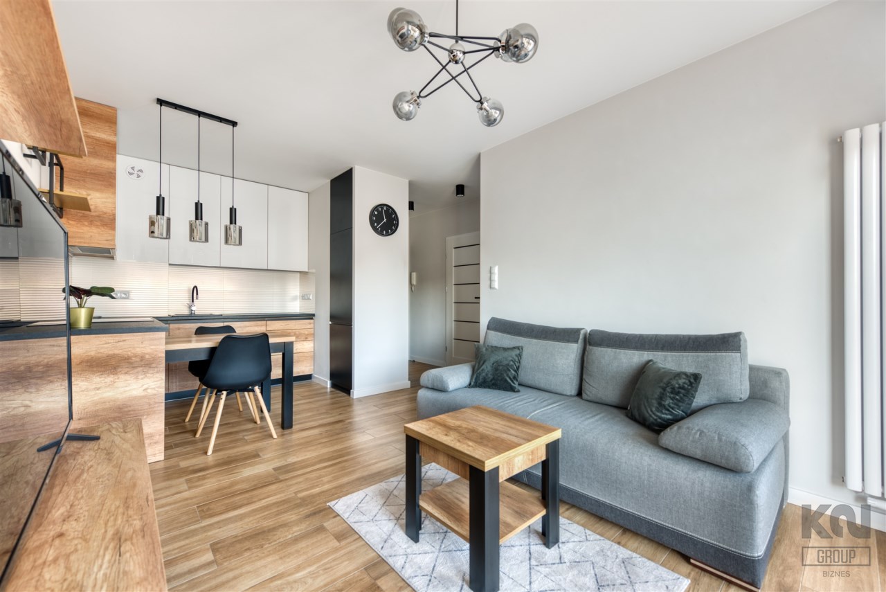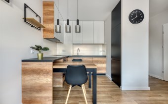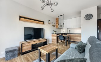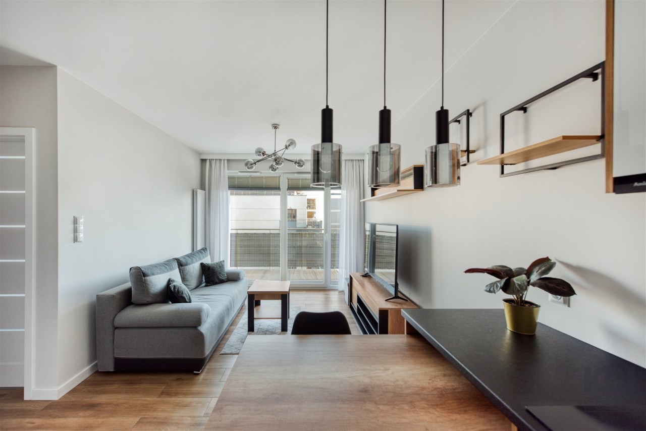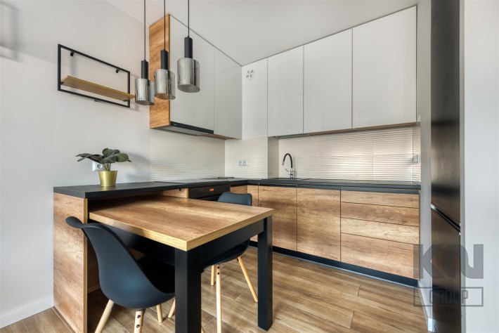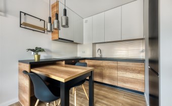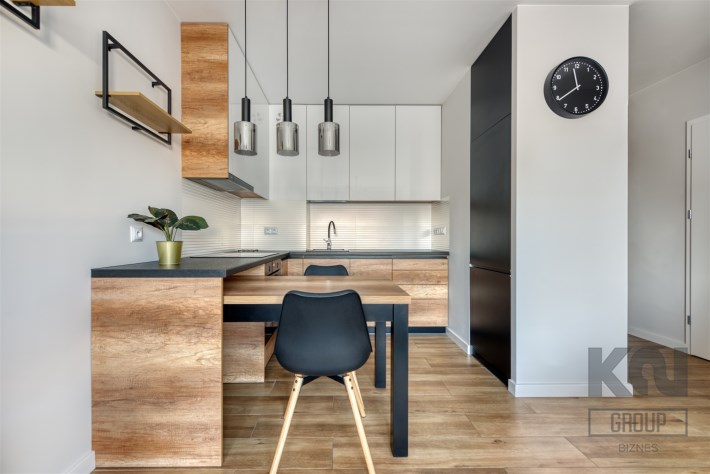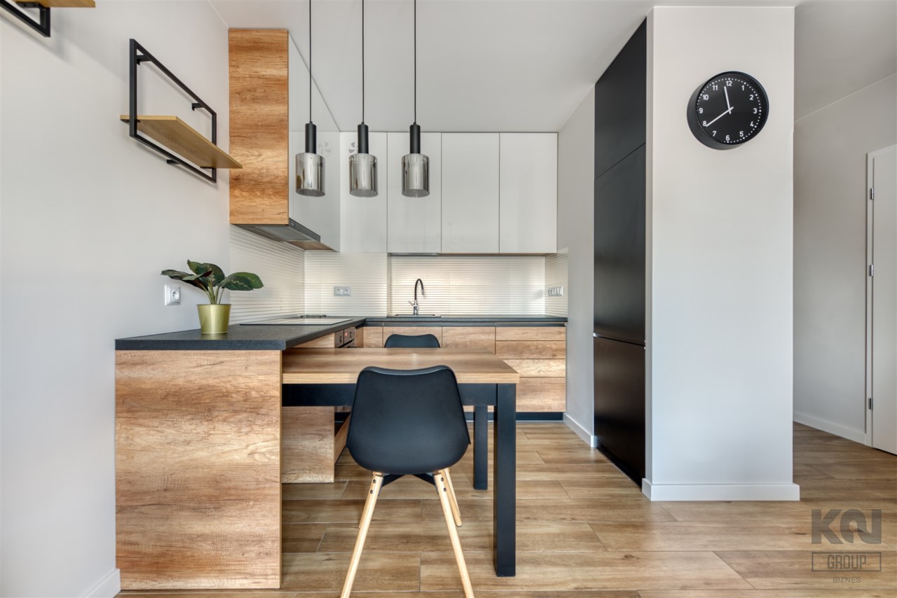 - funkcjonalny aneks kuchenny z płytą indukcyjną, okapem, piekarnikiem, lodówką z zamrażarką oraz zmywarką;