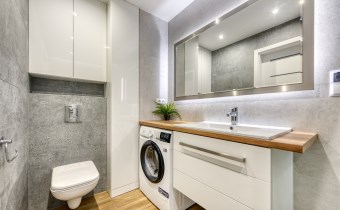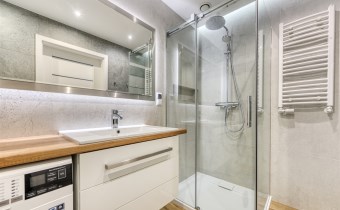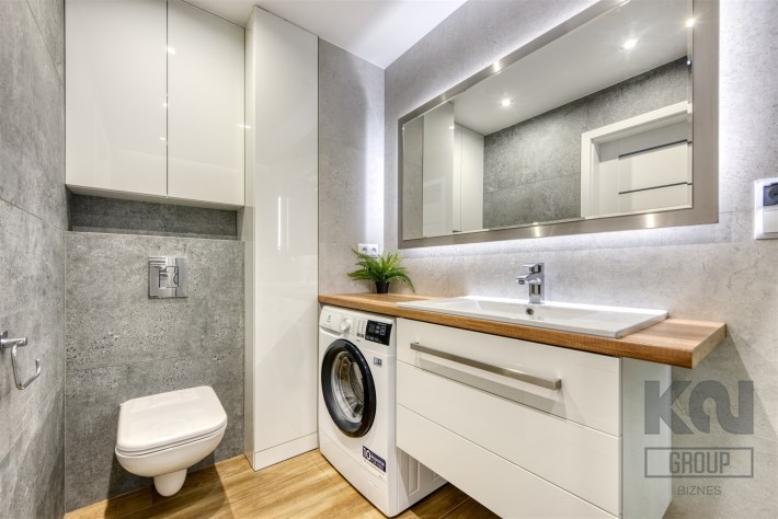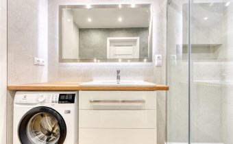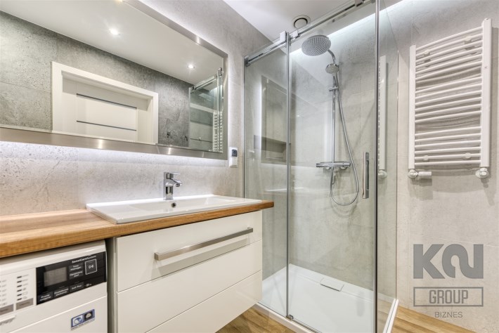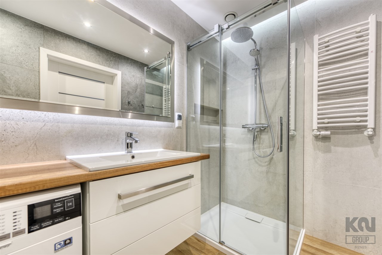 - elegancką łazienkę z kabiną prysznicową i pralką;