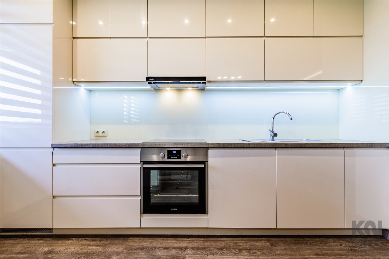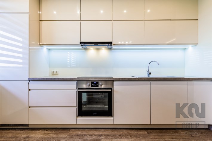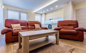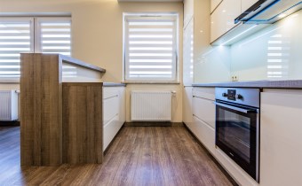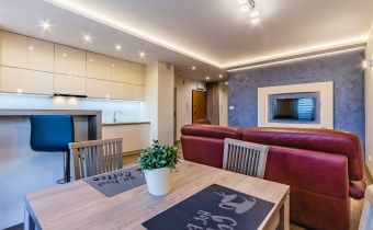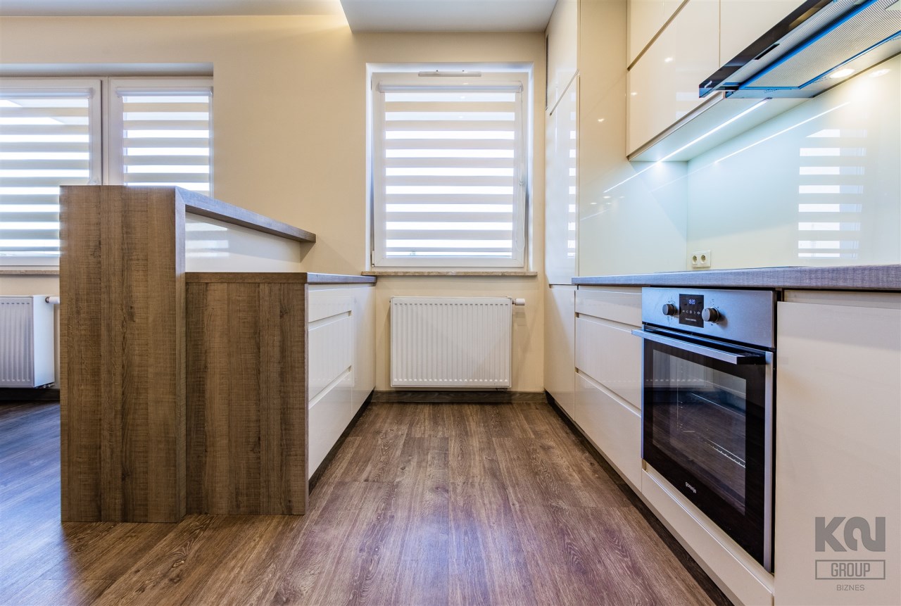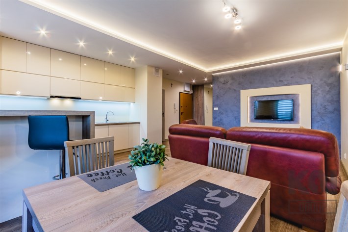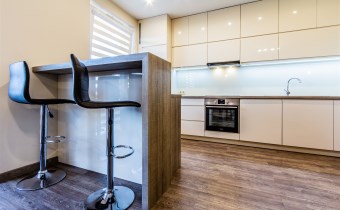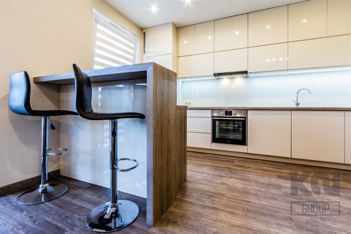 - nowoczesny aneks kuchenny wyposażony w płytę indukcyjną, okap, piekarnik, lodówkę z zamrażarką i zmywarkę;