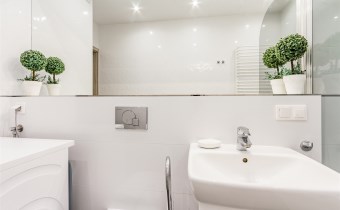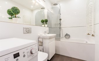 - nowoczesną łazienkę wyposażoną w wannę z funkcją prysznica oraz pralkę;