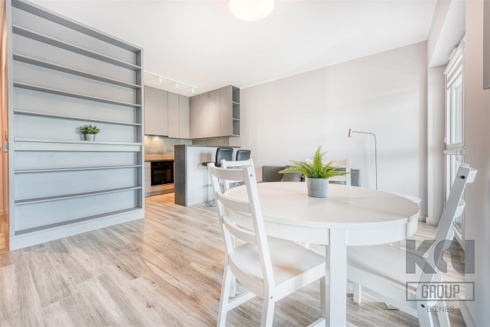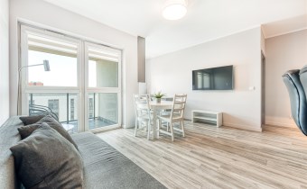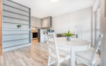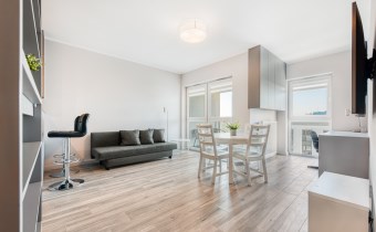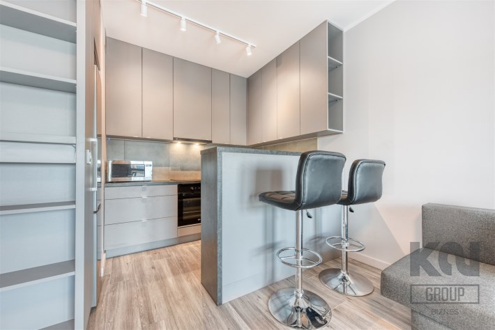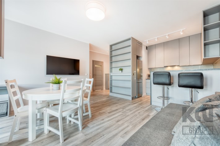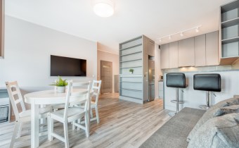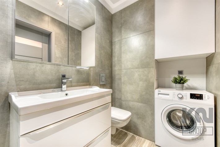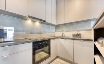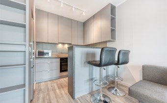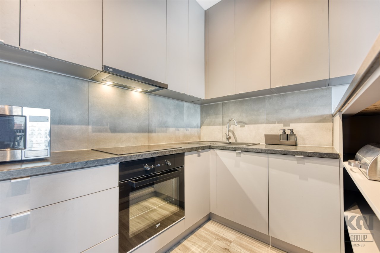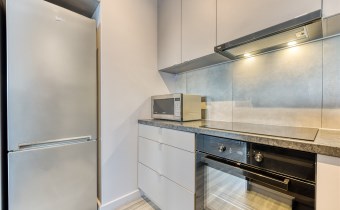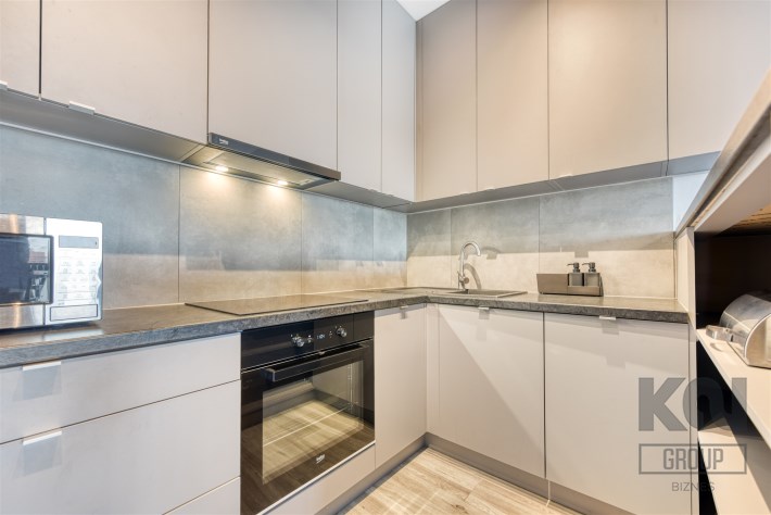 - kompletnie wyposażony aneks kuchenny (płyta indukcyjna, okap, piekarnik, zmywarka, lodówko-zamrażarka, kuchenka mikrofalowa, drobne wyposażenie kuchenne);