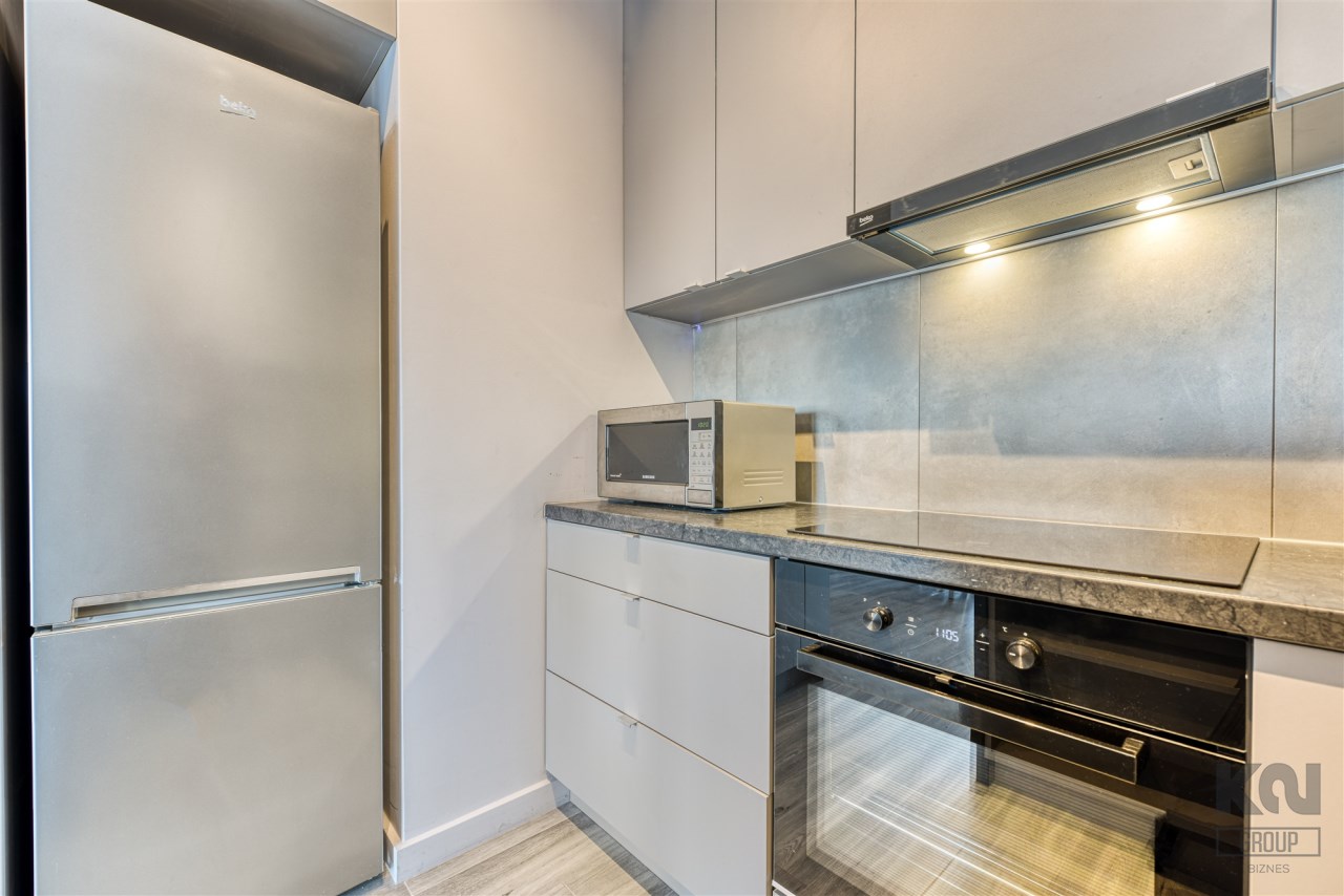 - kompletnie wyposażony aneks kuchenny (płyta indukcyjna, okap, piekarnik, zmywarka, lodówko-zamrażarka, kuchenka mikrofalowa, drobne wyposażenie kuchenne);