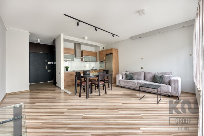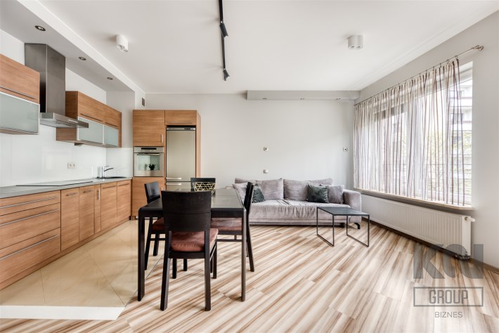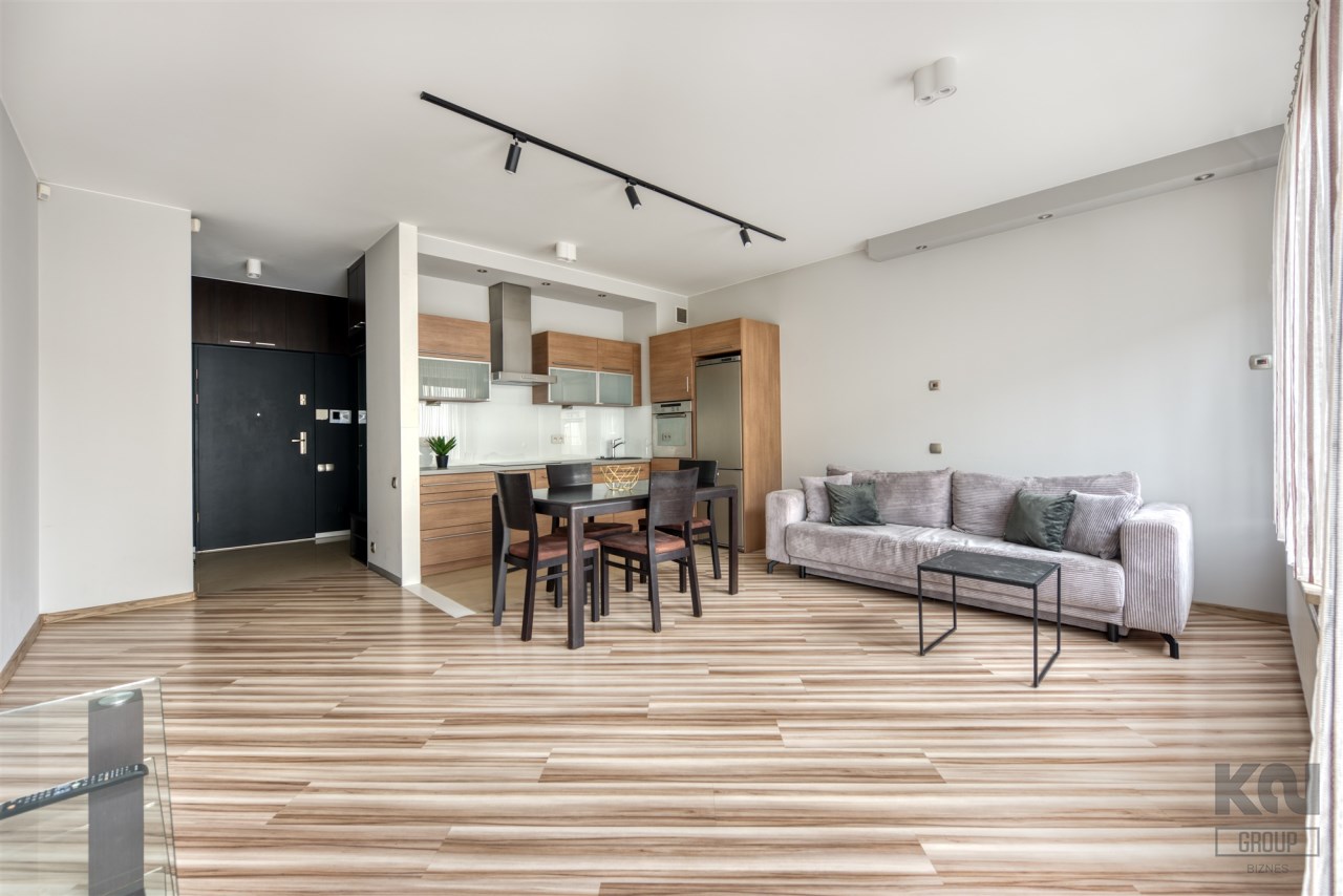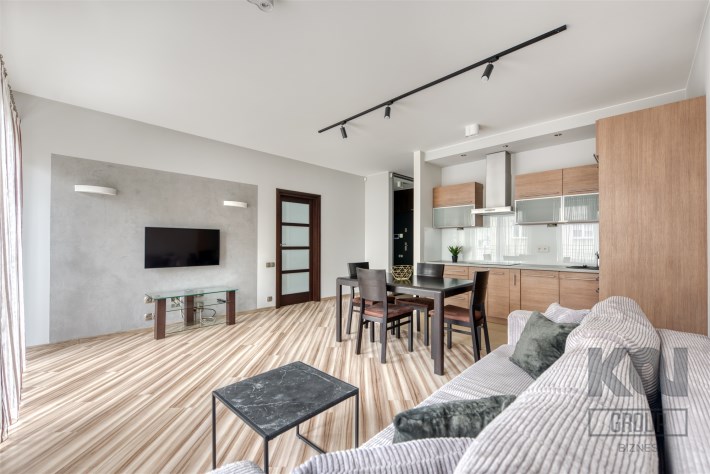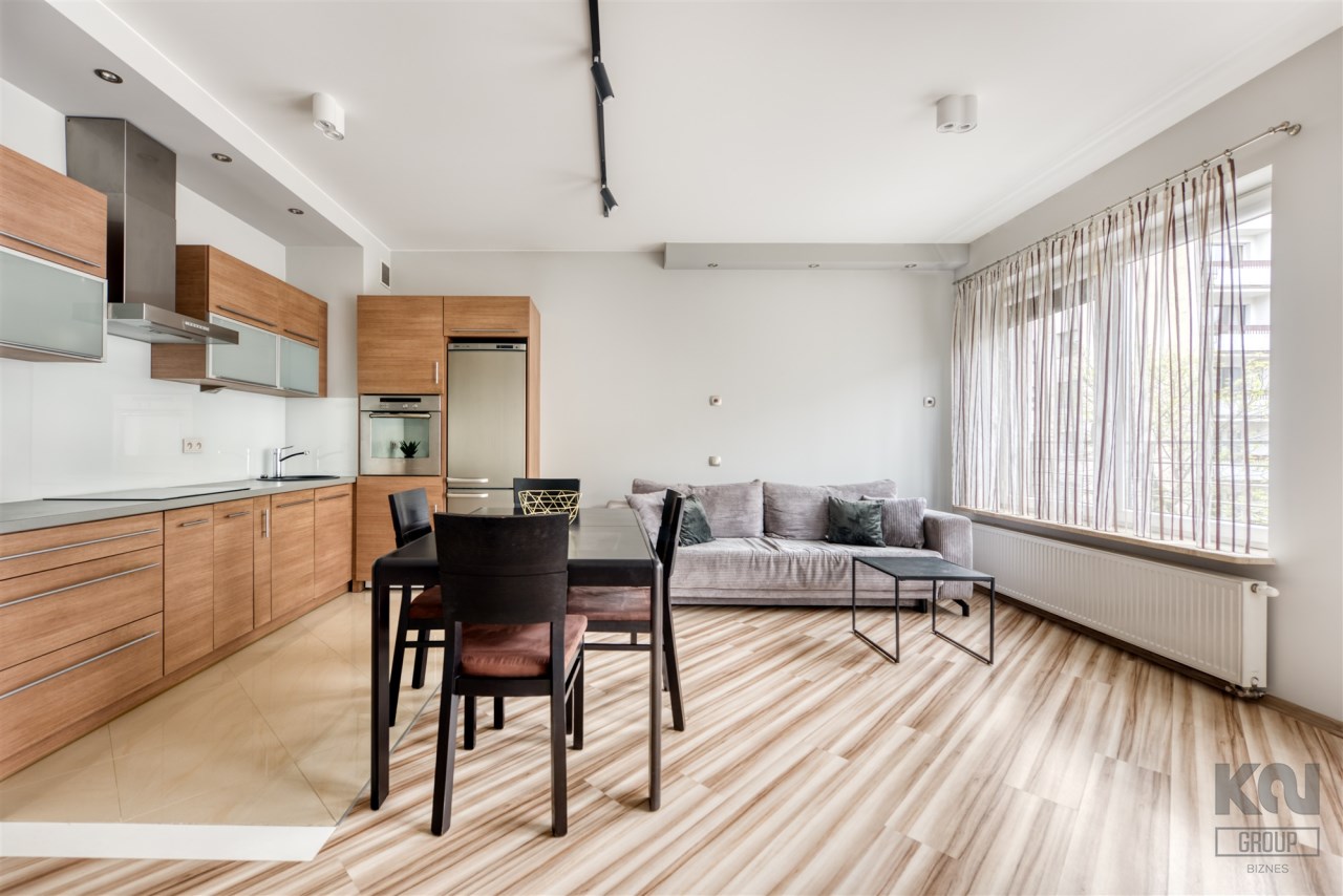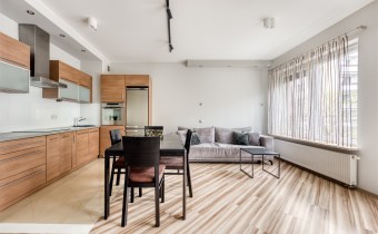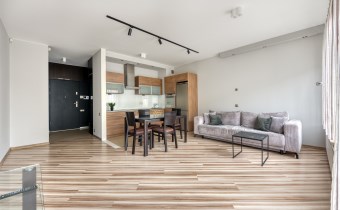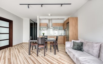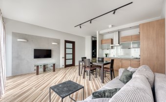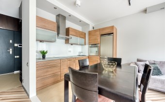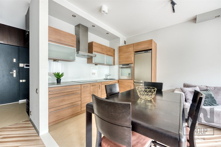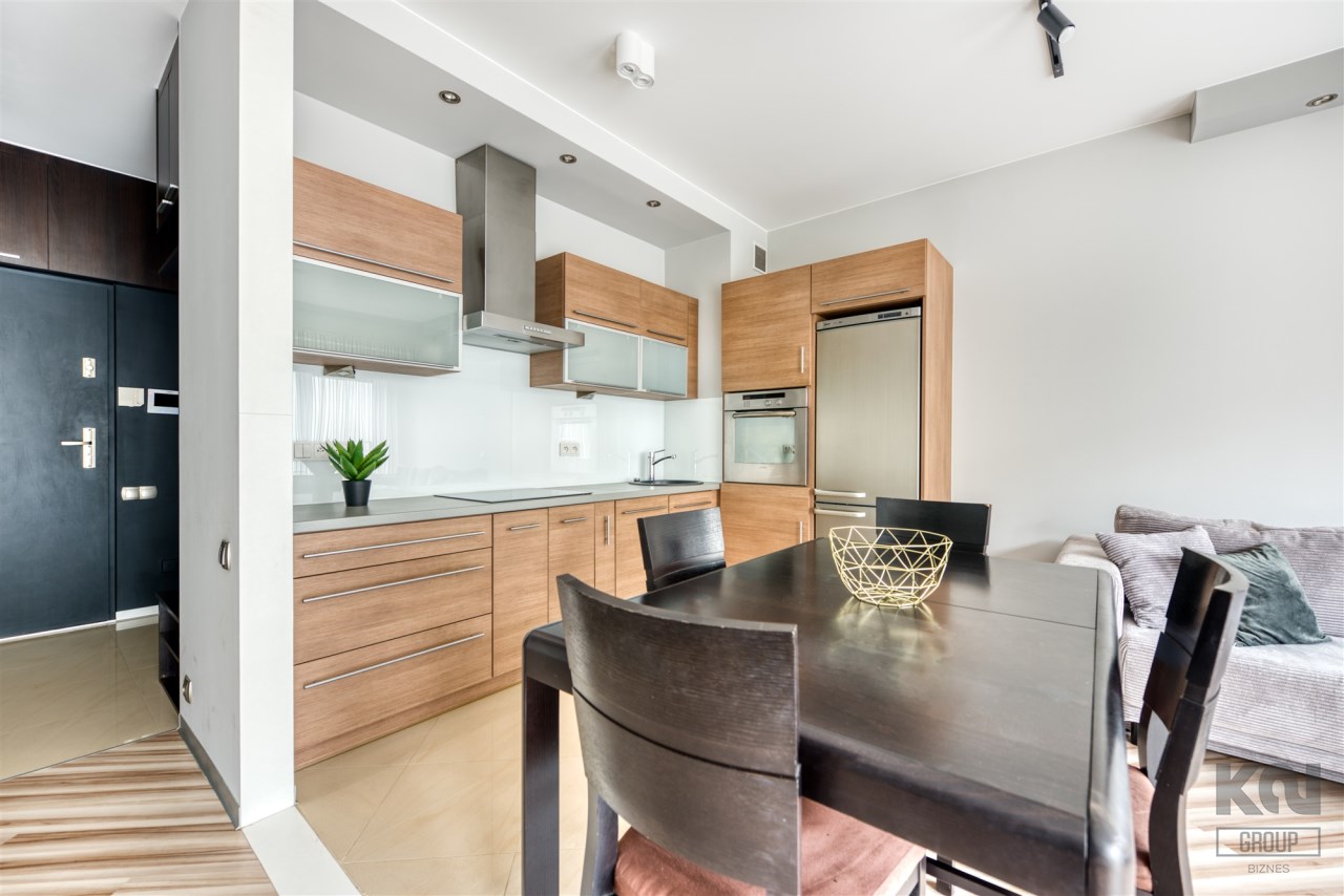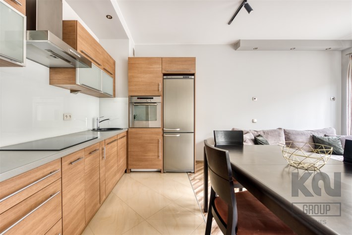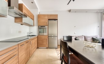 - kompletnie wyposażony aneks kuchenny (płyta indukcyjna, piekarnik, zmywarka, lodówko-zamrażarka);