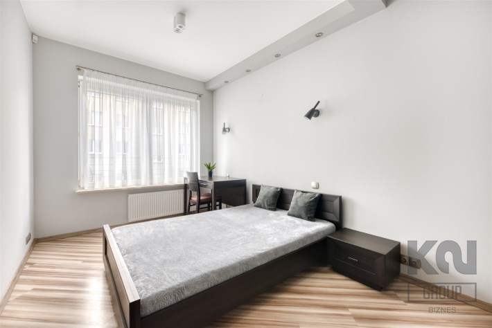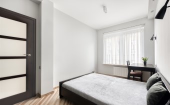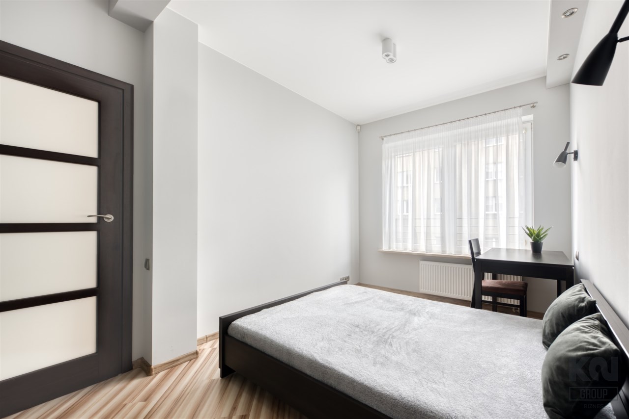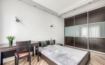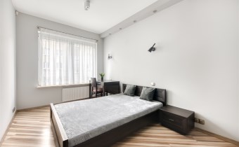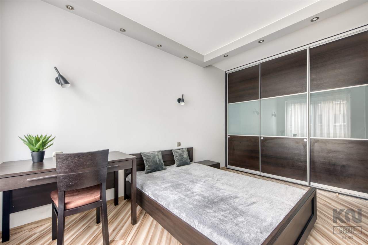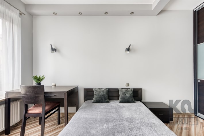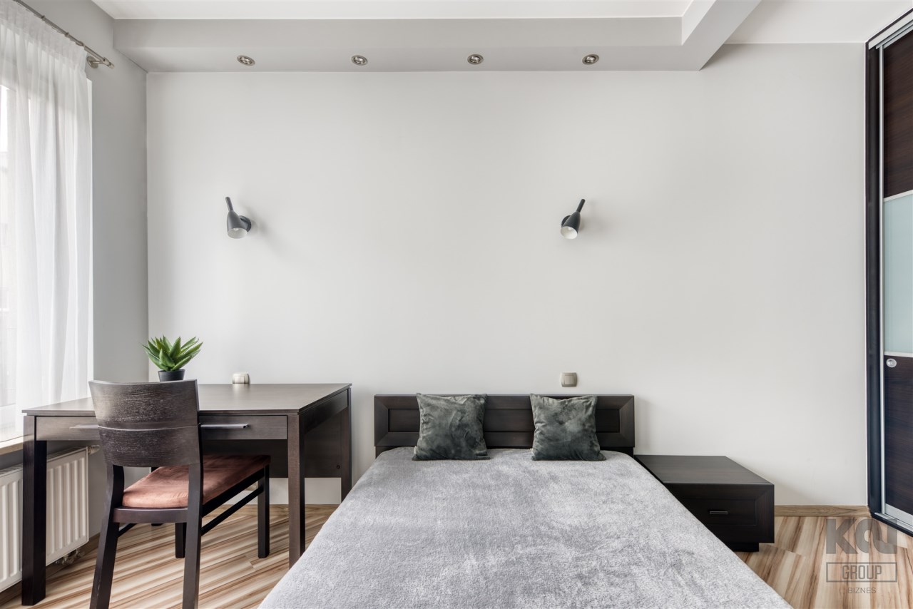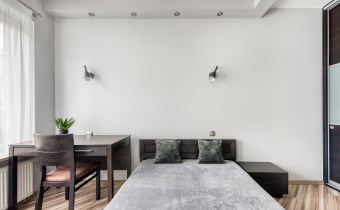 - przytulną sypialnię z dużym łóżkiem, zabudowaną szafą i miejscem do pracy;