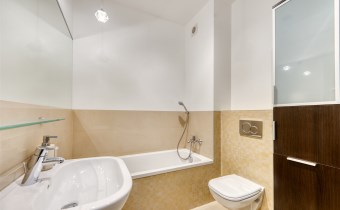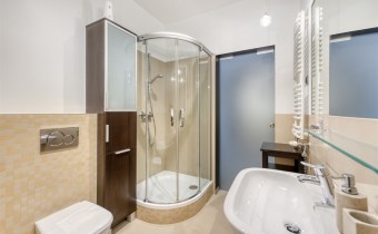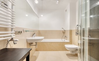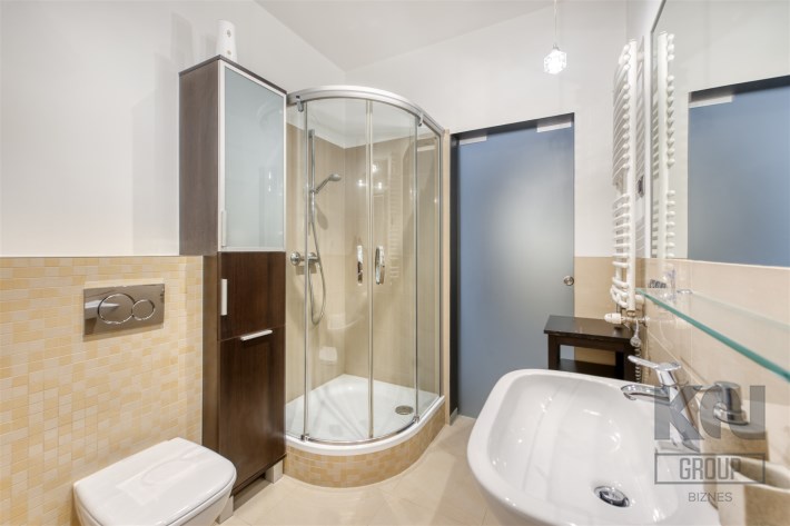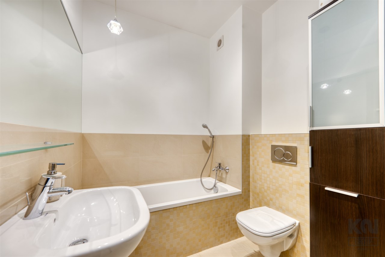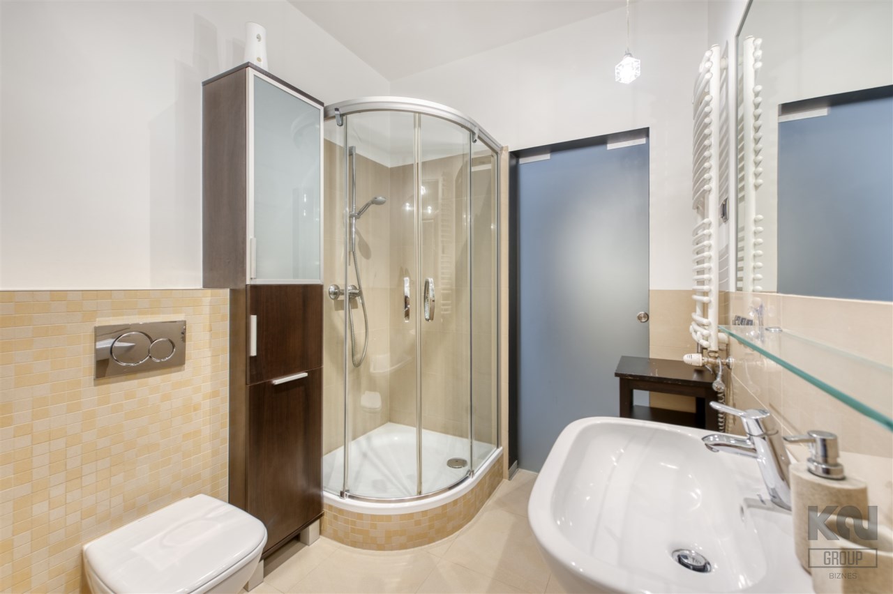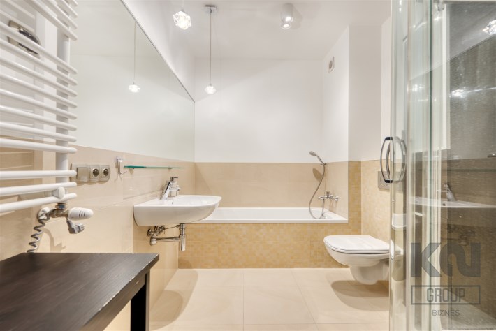 - świetnie zaprojektowaną łazienkę z WC wyposażoną w wannę, kabinę prysznicową oraz pralkę;