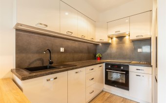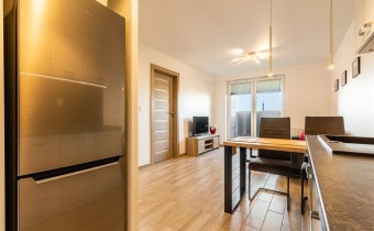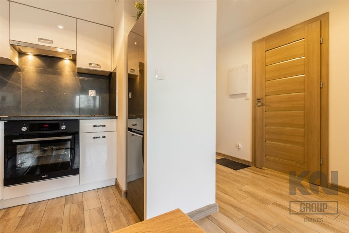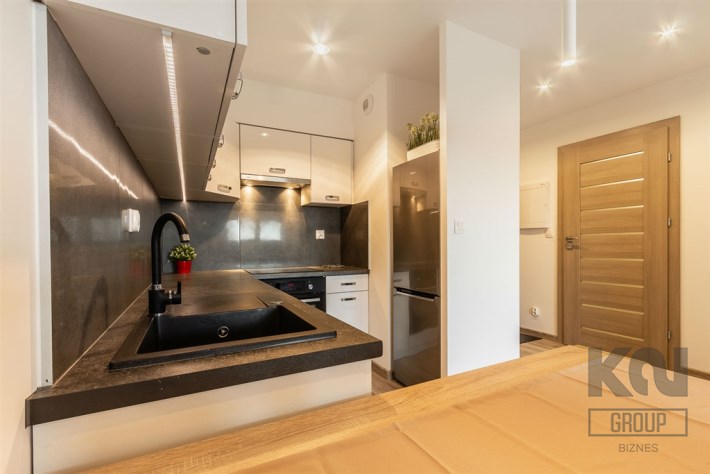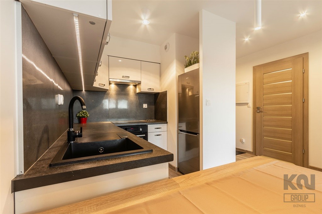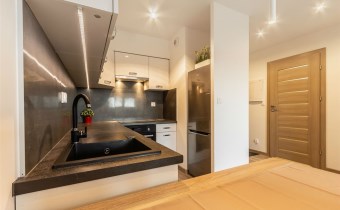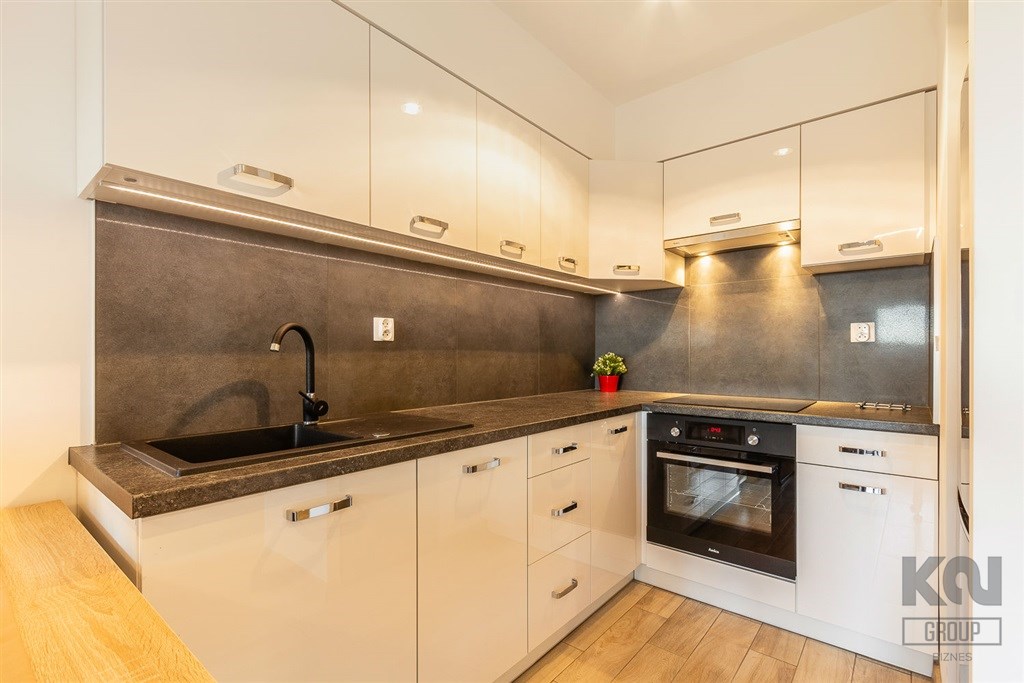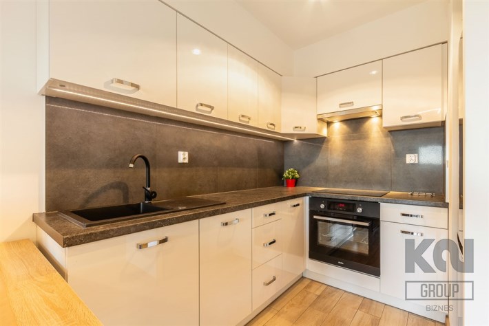 - aneks kuchenny wyposażony w w płytę indukcyjną, okap, piekarnik, lodówkę z zamrażarką, zmywarkę oraz drobne wyposażenie;