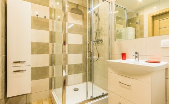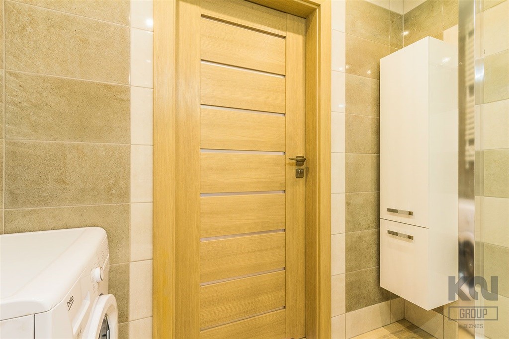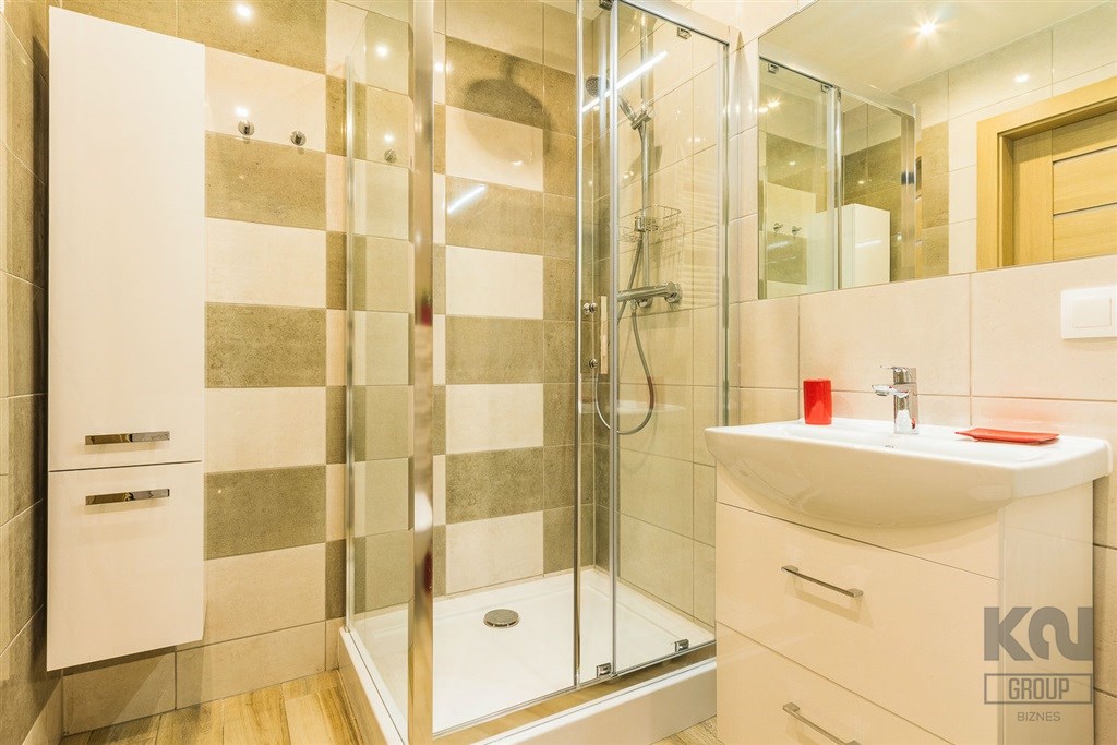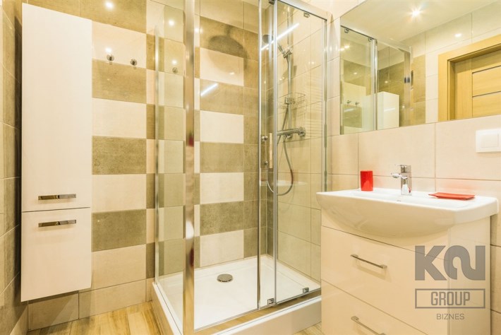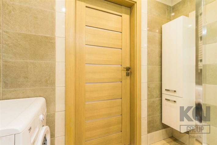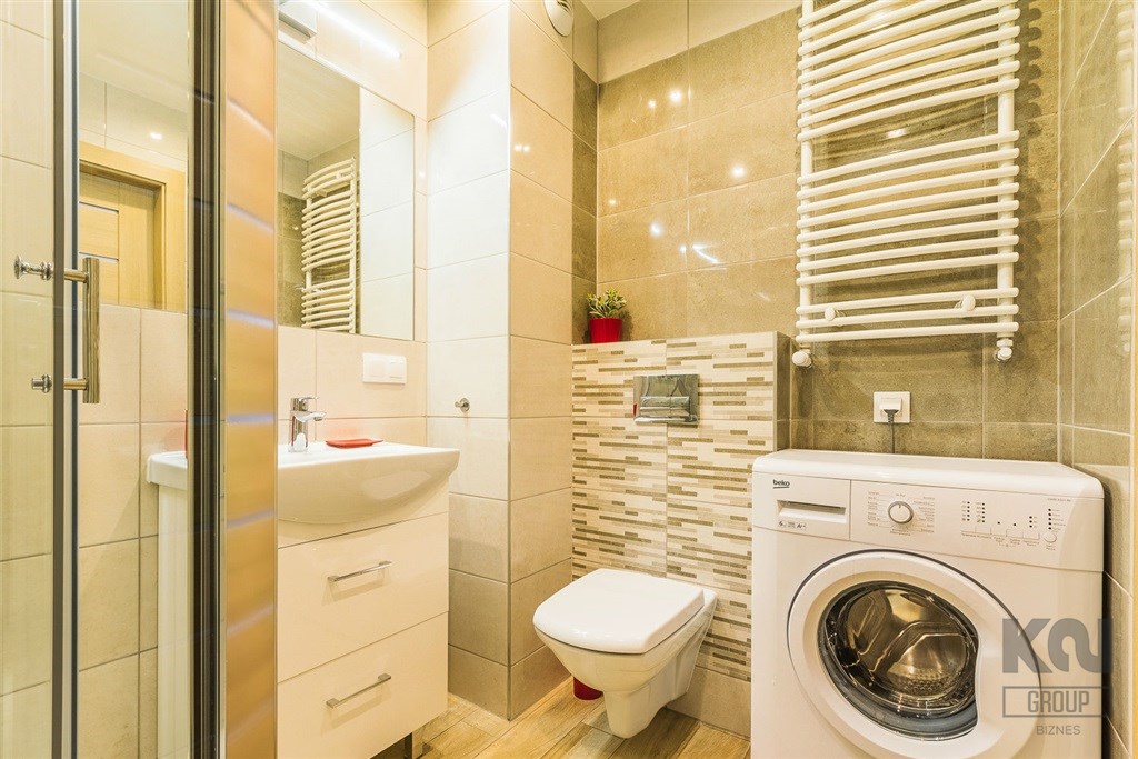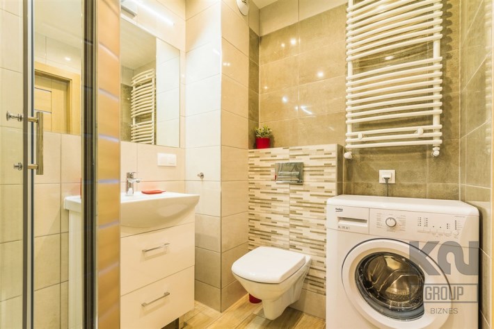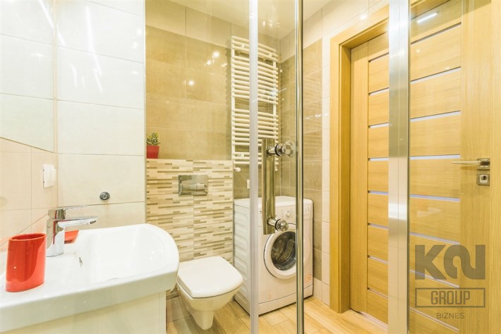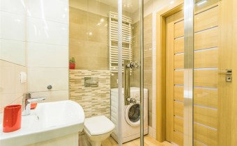 - nowoczesną łazienkę z WC wyposażoną w kabinę prysznicową oraz pralkę;