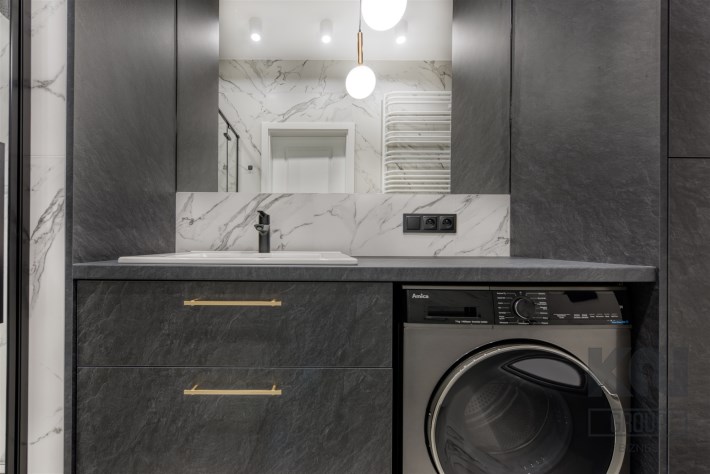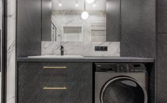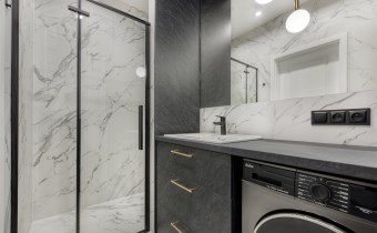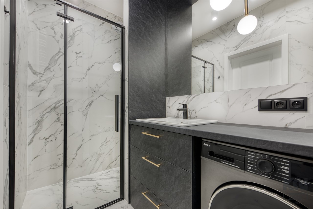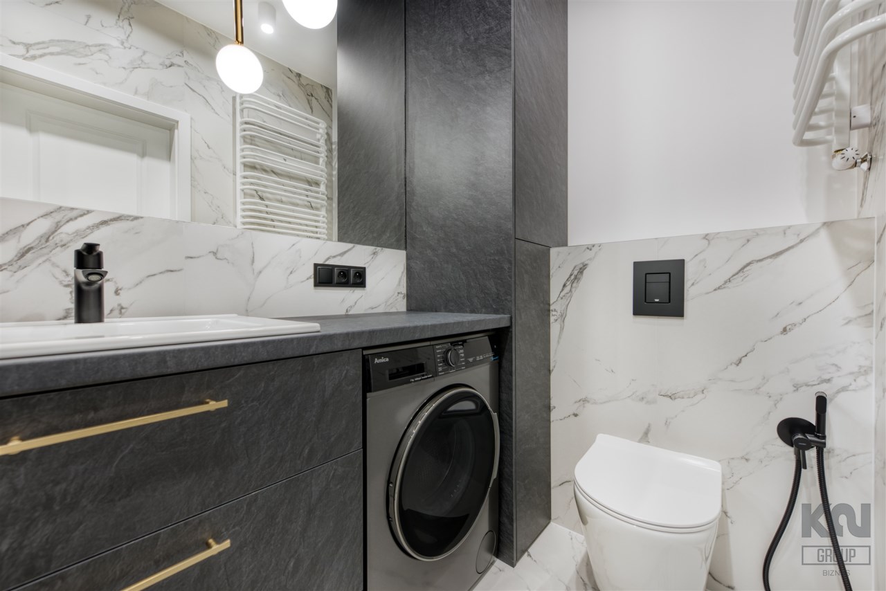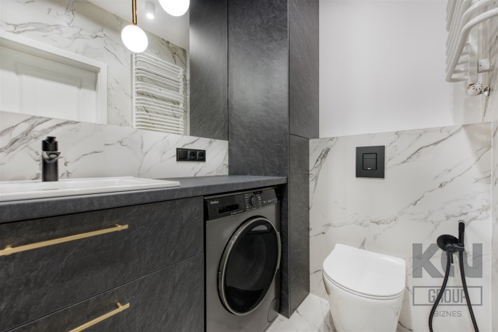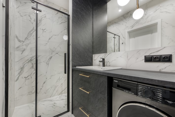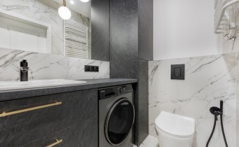 - nowoczesną łazienkę z WC wyposażoną w prysznic oraz pralkę;