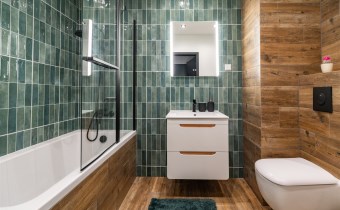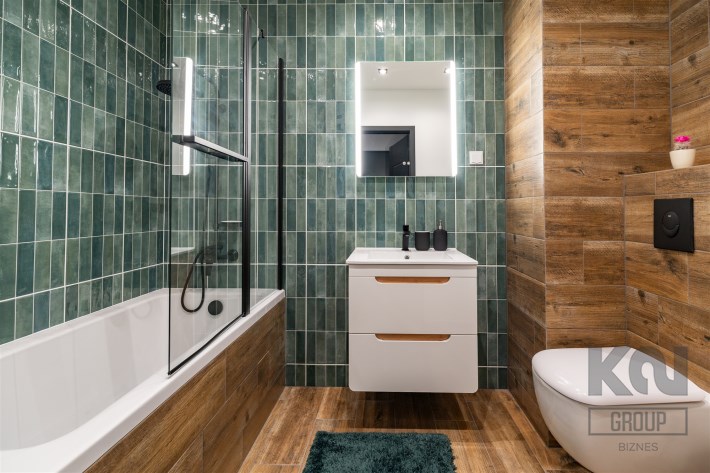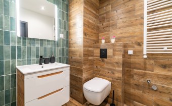 - nowoczesną łazienkę z WC wyposażoną w prysznic oraz pralkę;