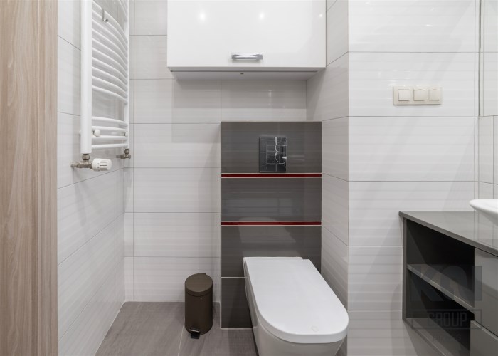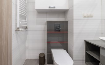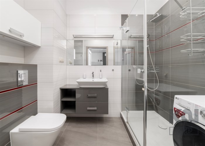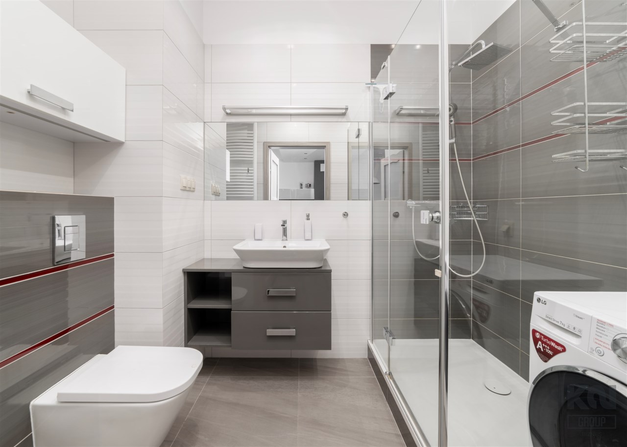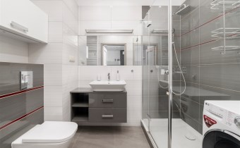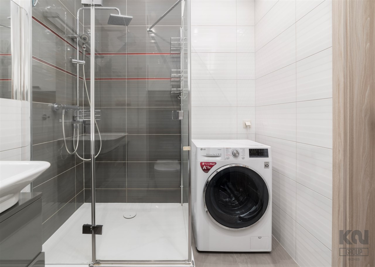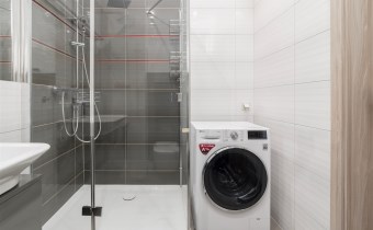 - nowoczesną łazienkę z WC wyposażoną w prysznic oraz pralkę;