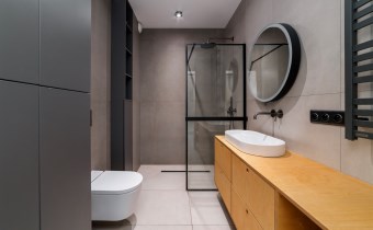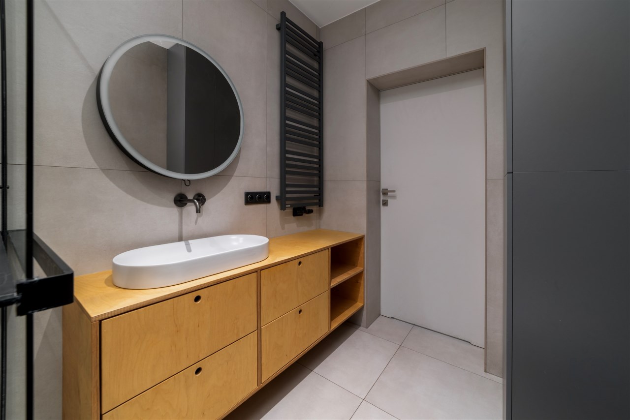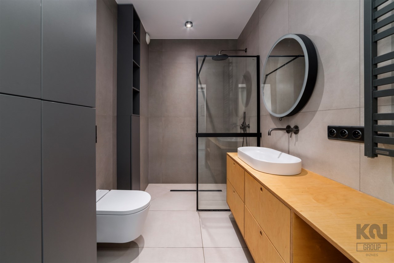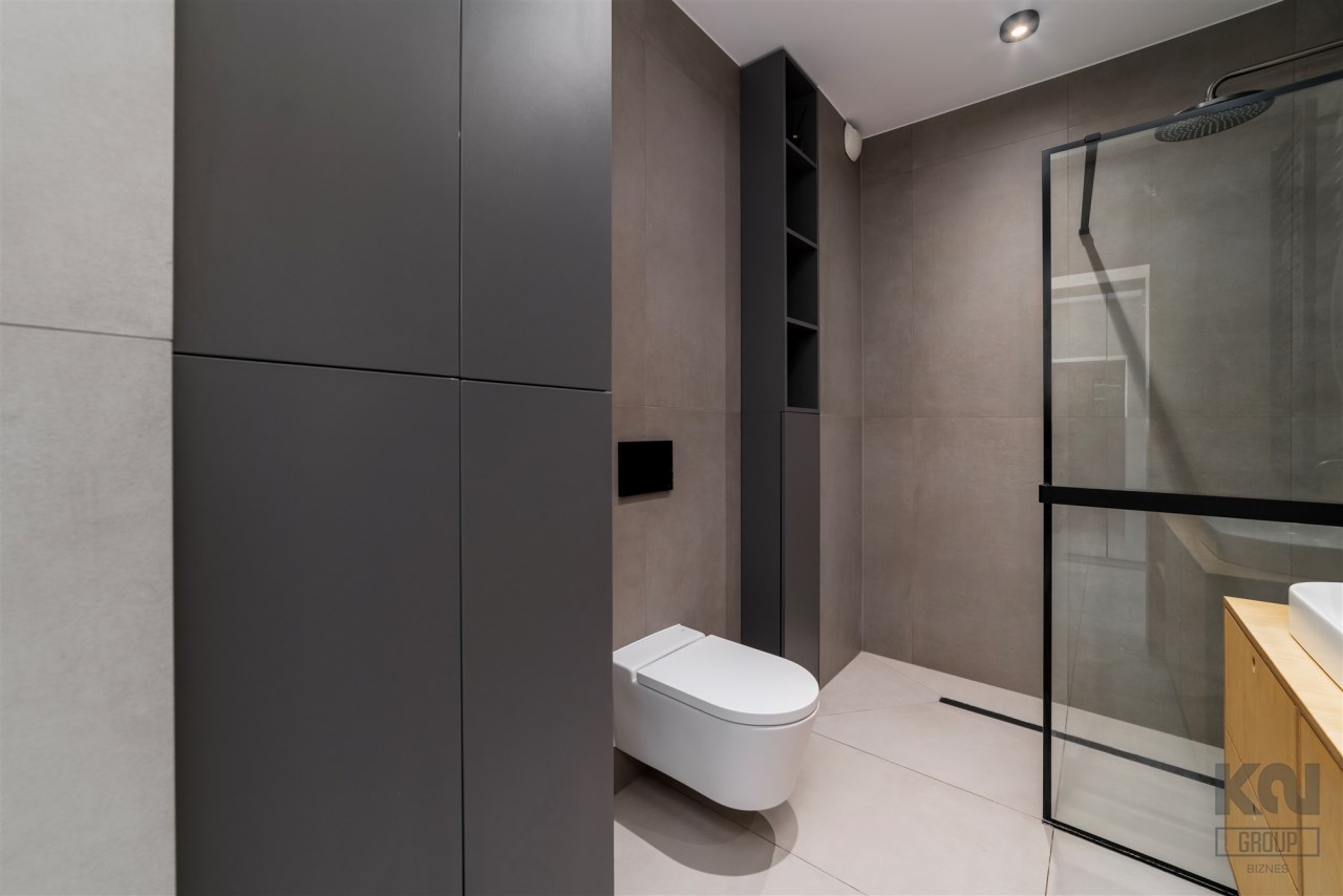 - nowoczesną łazienkę z WC wyposażoną w prysznic oraz pralkę;