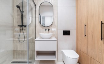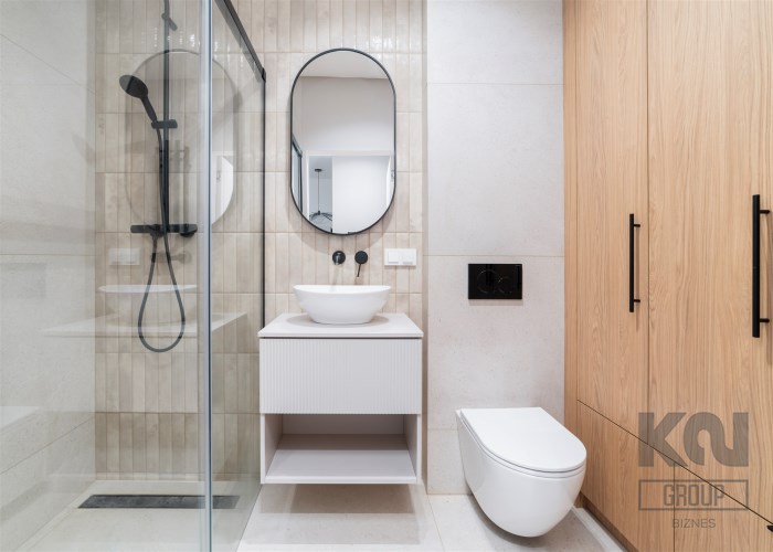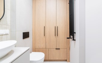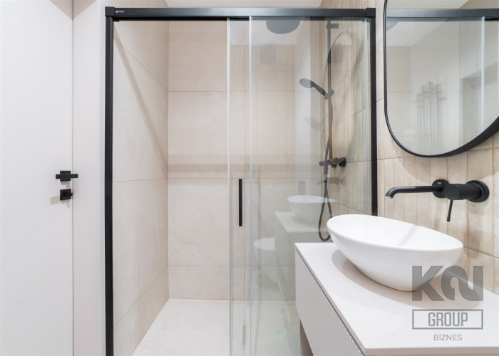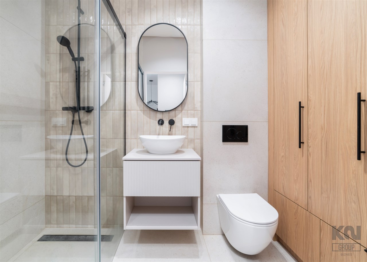 - nowoczesną łazienkę z WC wyposażoną w prysznic oraz pralkę;