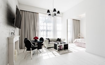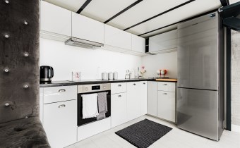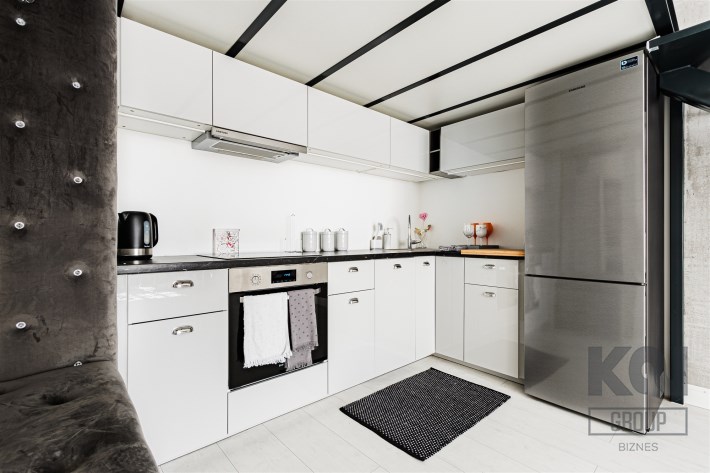 - w pełni wyposażony aneks kuchenny (płyta indukcyjna, piekarnik, zmywarka, lodówko-zamrażarka);
