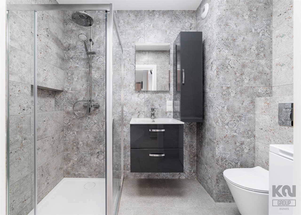 - łazienkę z WC wyposażoną w dużą kabinę prysznicową, umywalkę oraz pralkę;