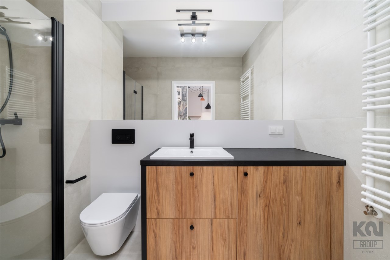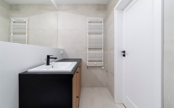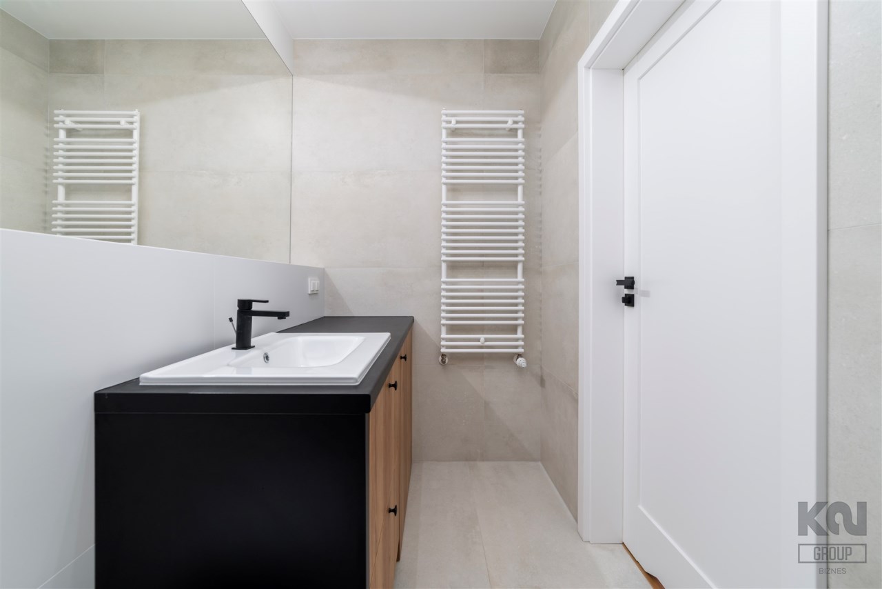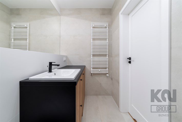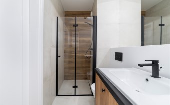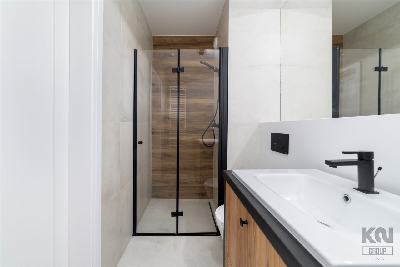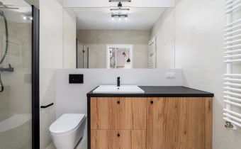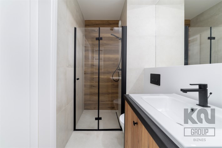 - nowoczesną łazienkę z WC wyposażoną w kabinę prysznicową oraz pralkę;
