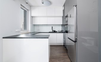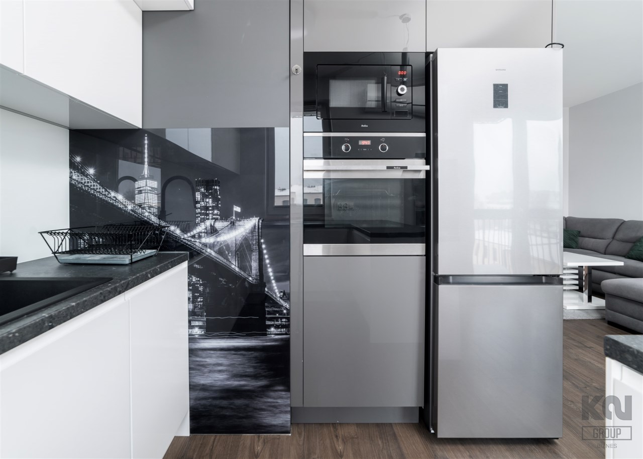 - funkcjonalny aneks kuchenny wyposażony m.in. w płytę indukcyjną, okap, piekarnik, mikrofalówkę, lodówkę z zamrażarką, zmywarkę;