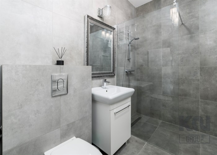 Wyposażenie łazienki lustro, pralka, prysznic, umywalka, WC