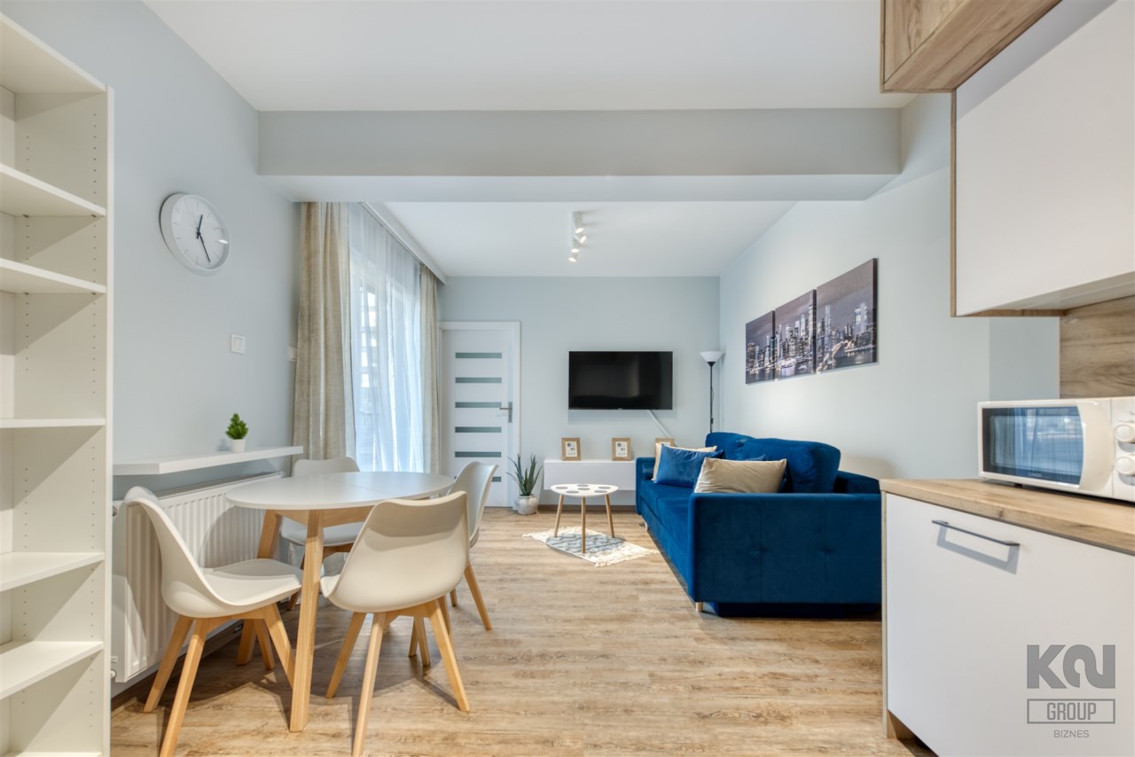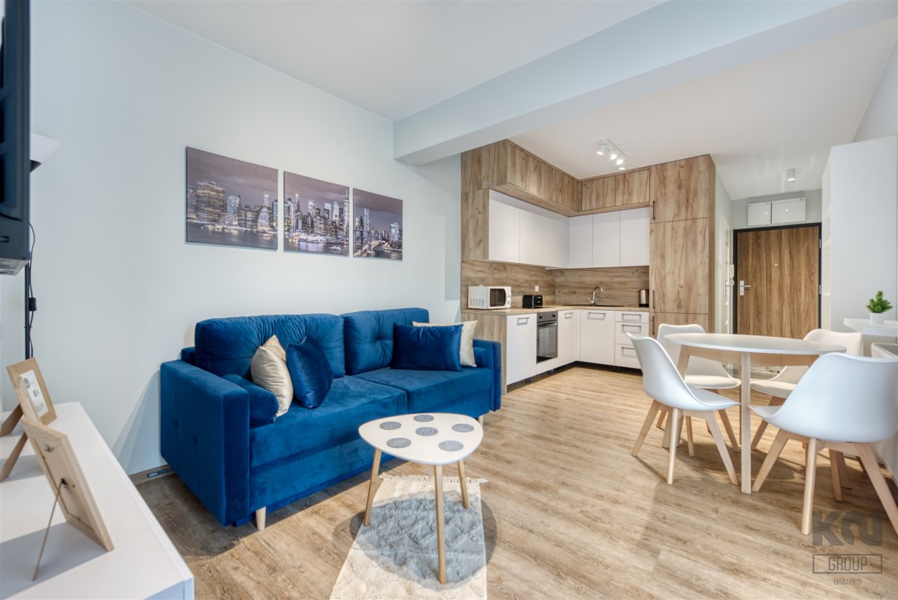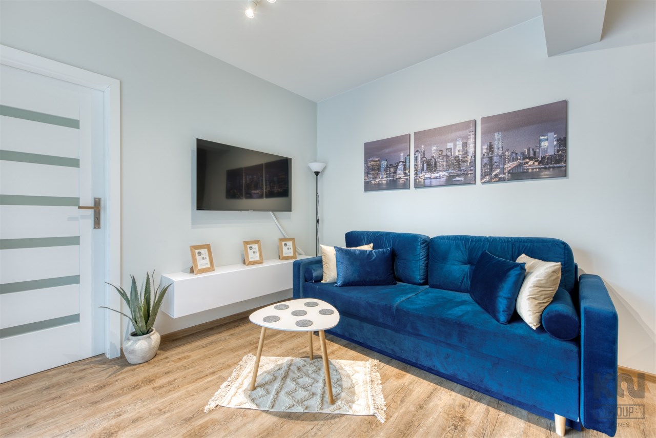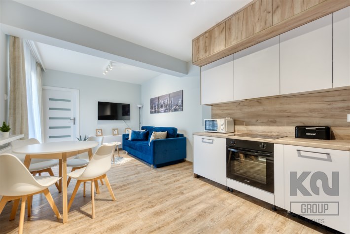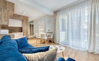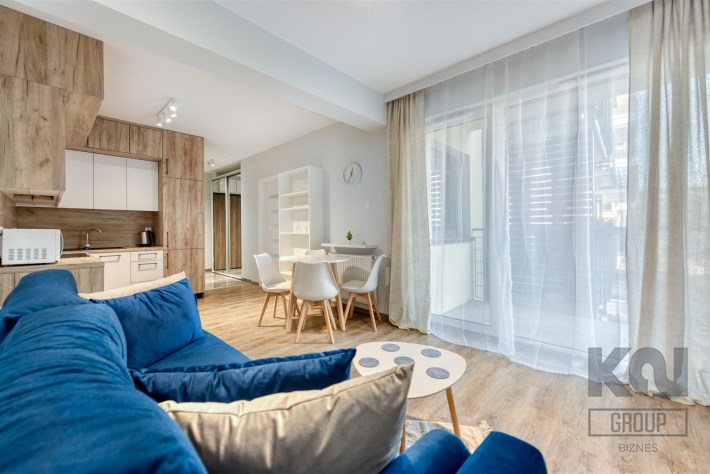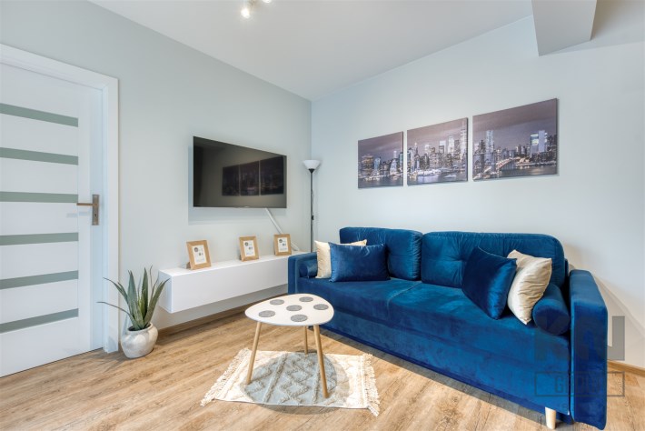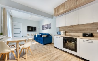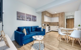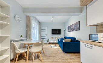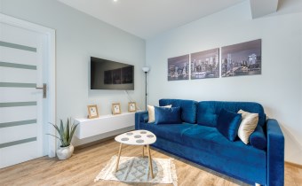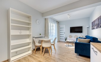 - komfortowy salon z wyjściem na balkon (wyposażony w sofę, TV, stół z 4 krzesłami i regał);