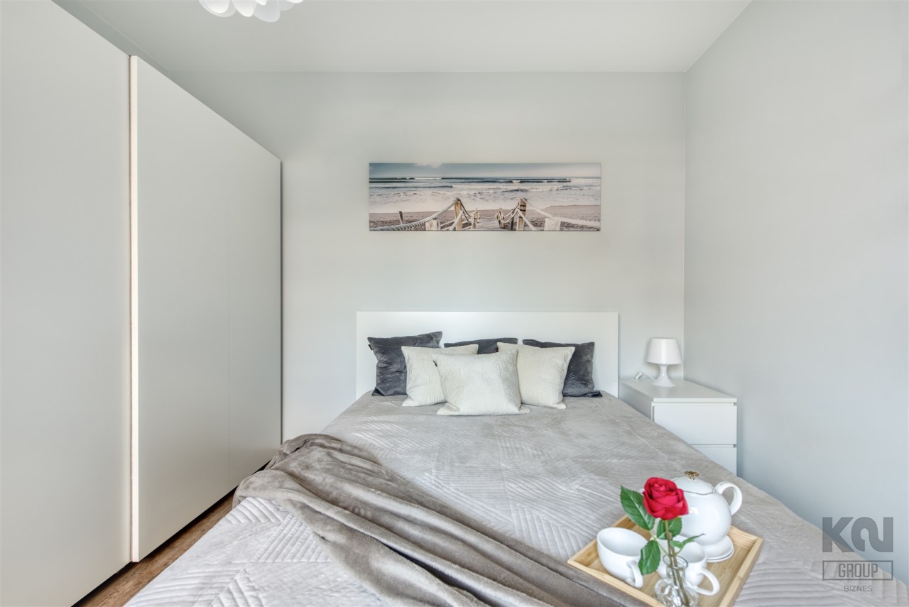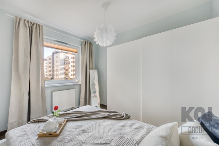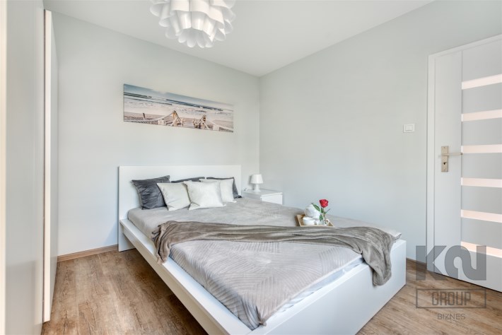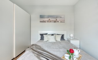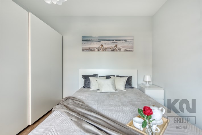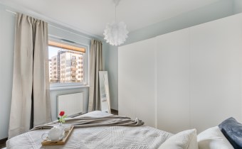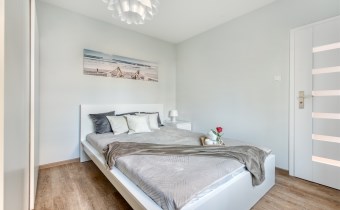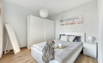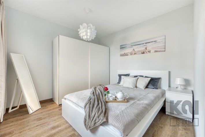 - przytulną sypialnię (wyposażoną w wygodne łóżko z materacem, szafkę nocną, lustro i pojemną szafę);