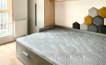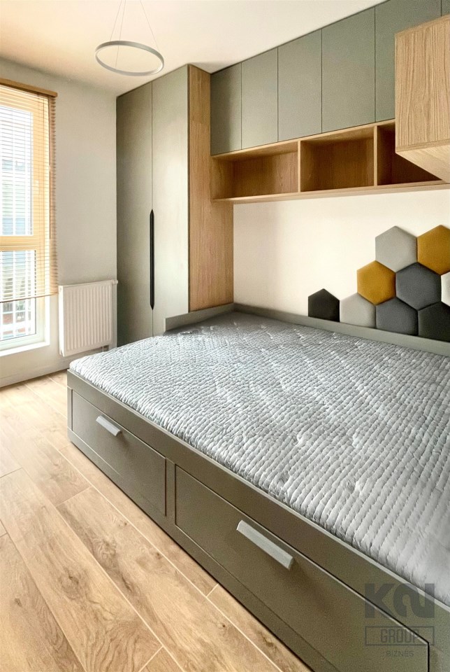 - przytulną sypialnię (wyposażoną w podwójne łóżko, pojemną szafę i komodę);
