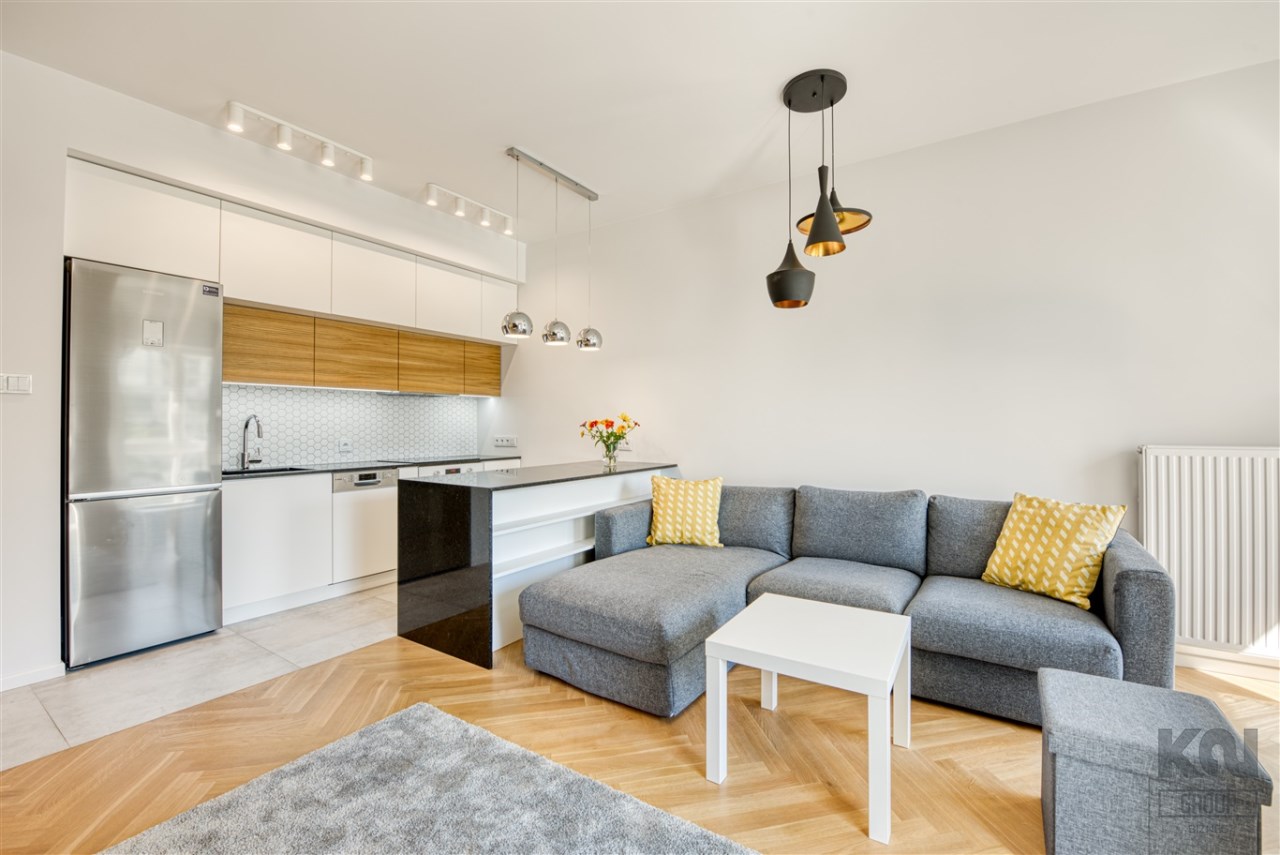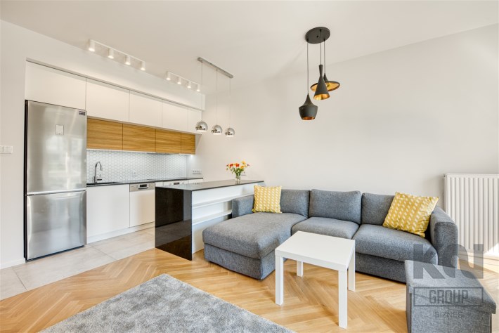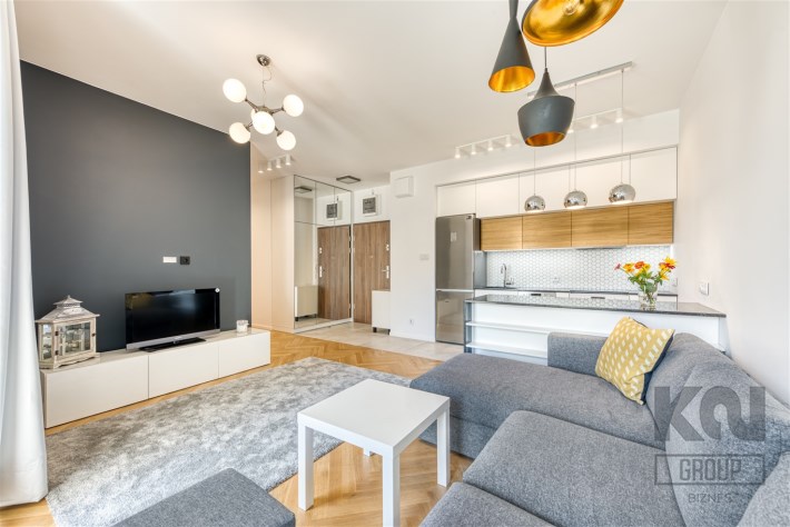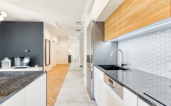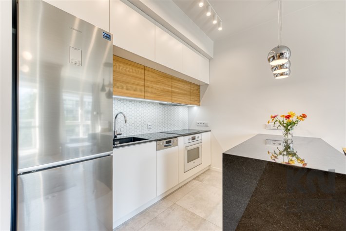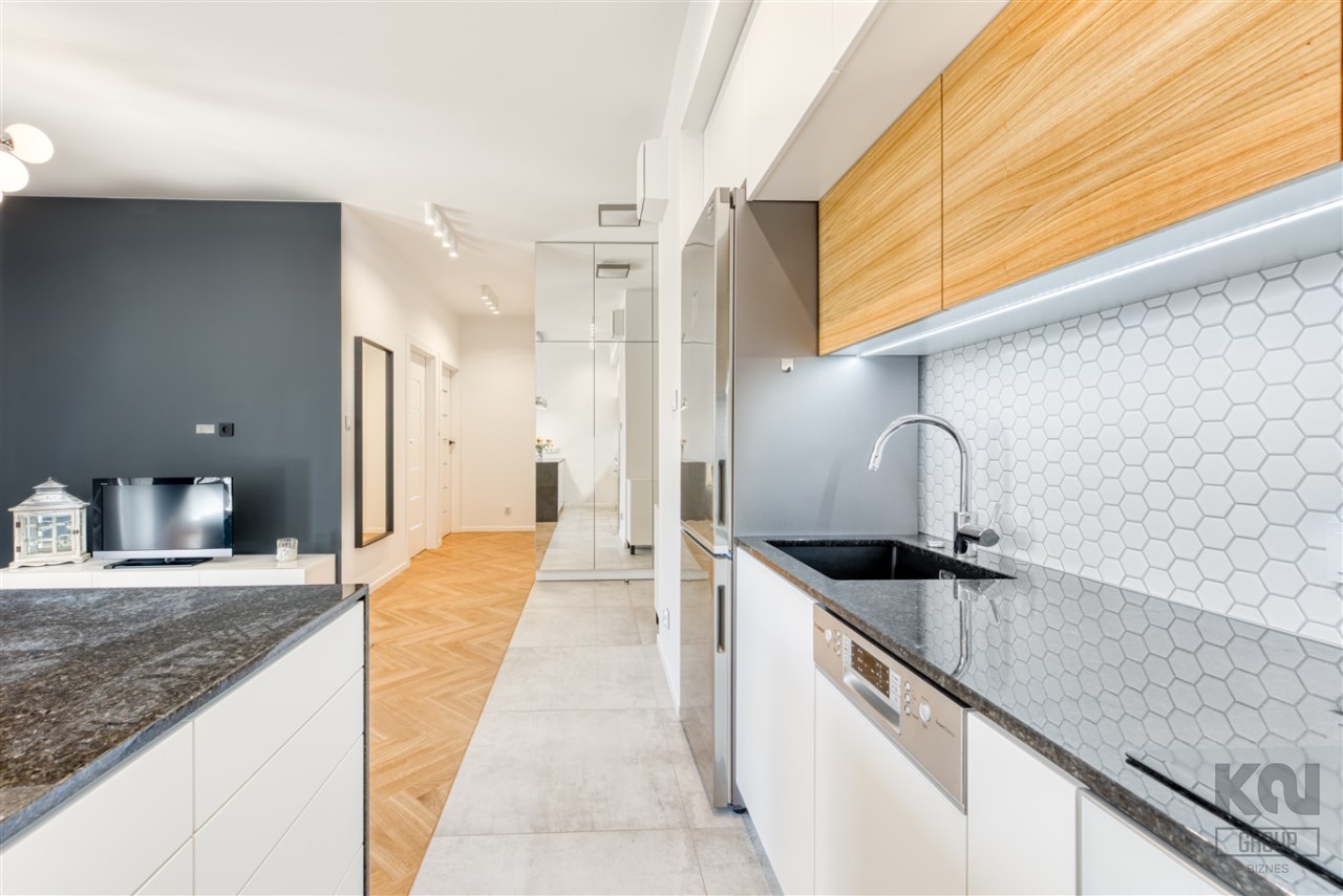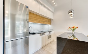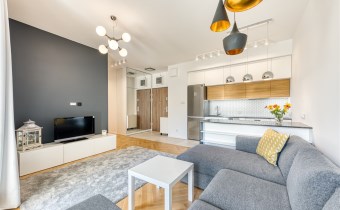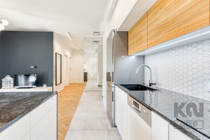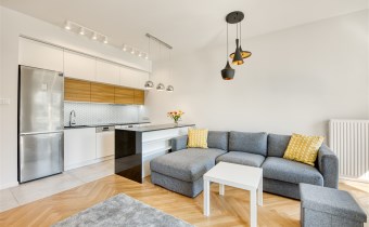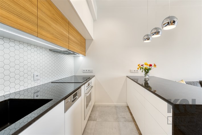 - kompletnie wyposażony aneks kuchenny (płyta indukcyjna, piekarnik, zmywarka, lodówko-zamrażarka);