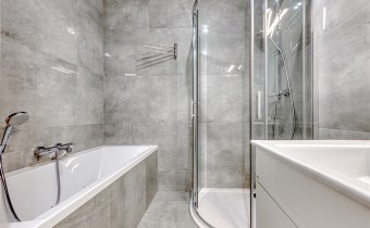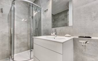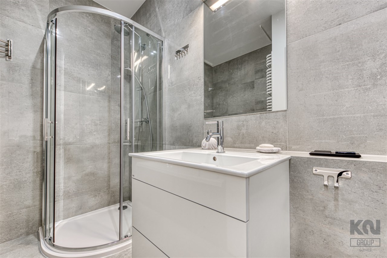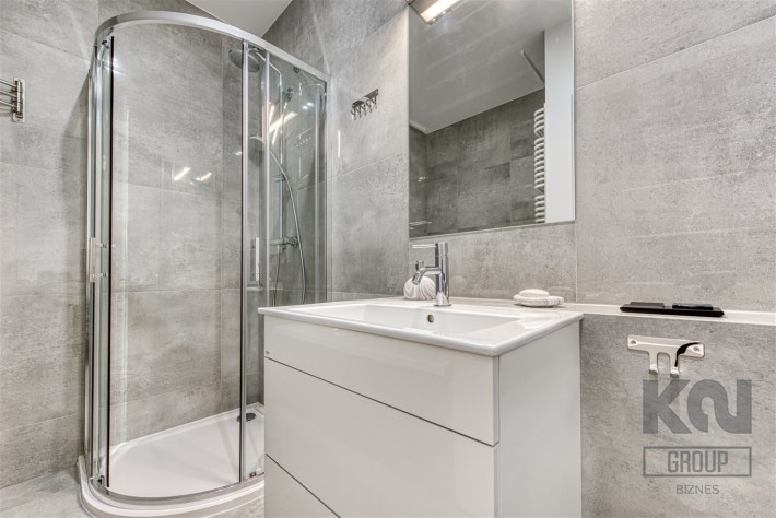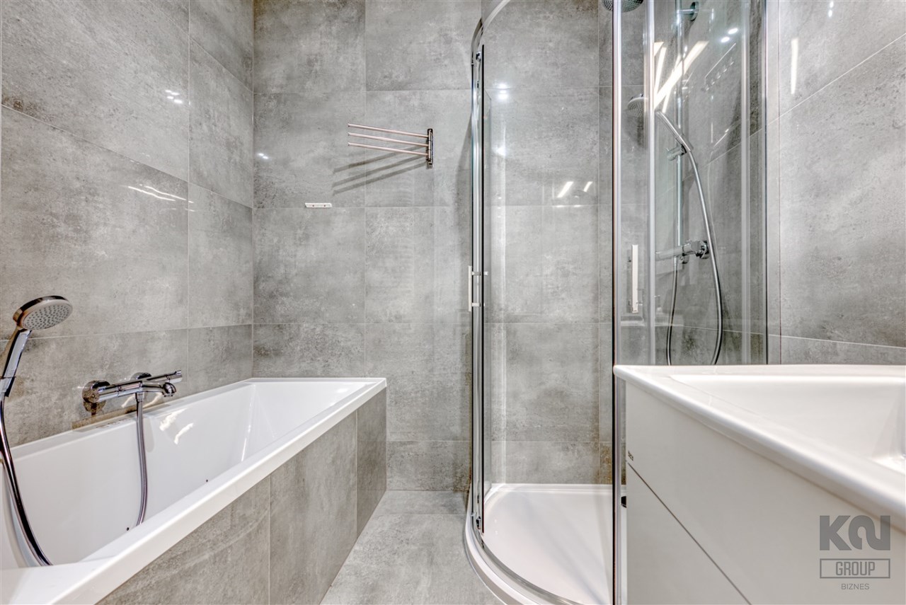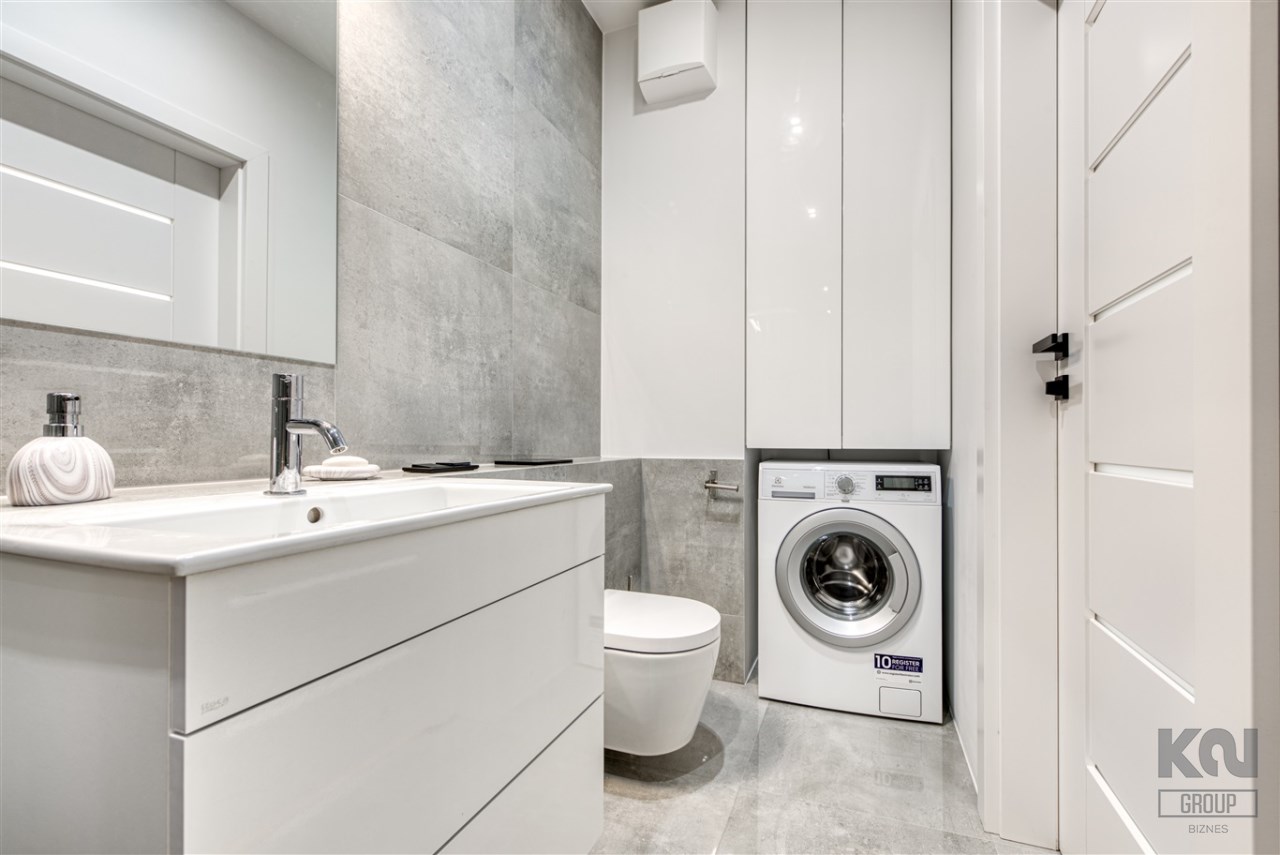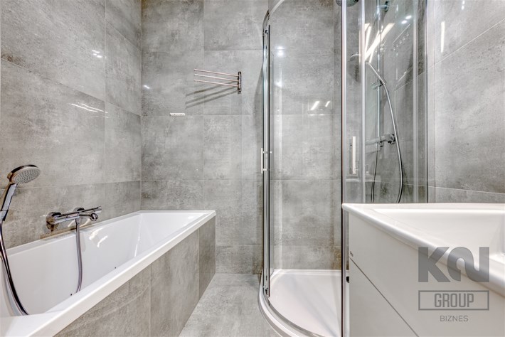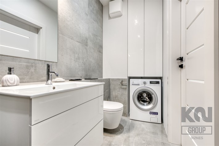 - świetnie zaprojektowaną łazienkę z WC wyposażoną w wannę, kabinę prysznicową i pralkę;