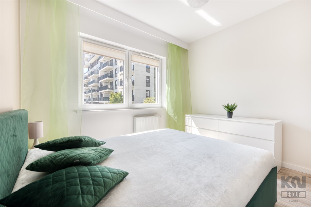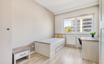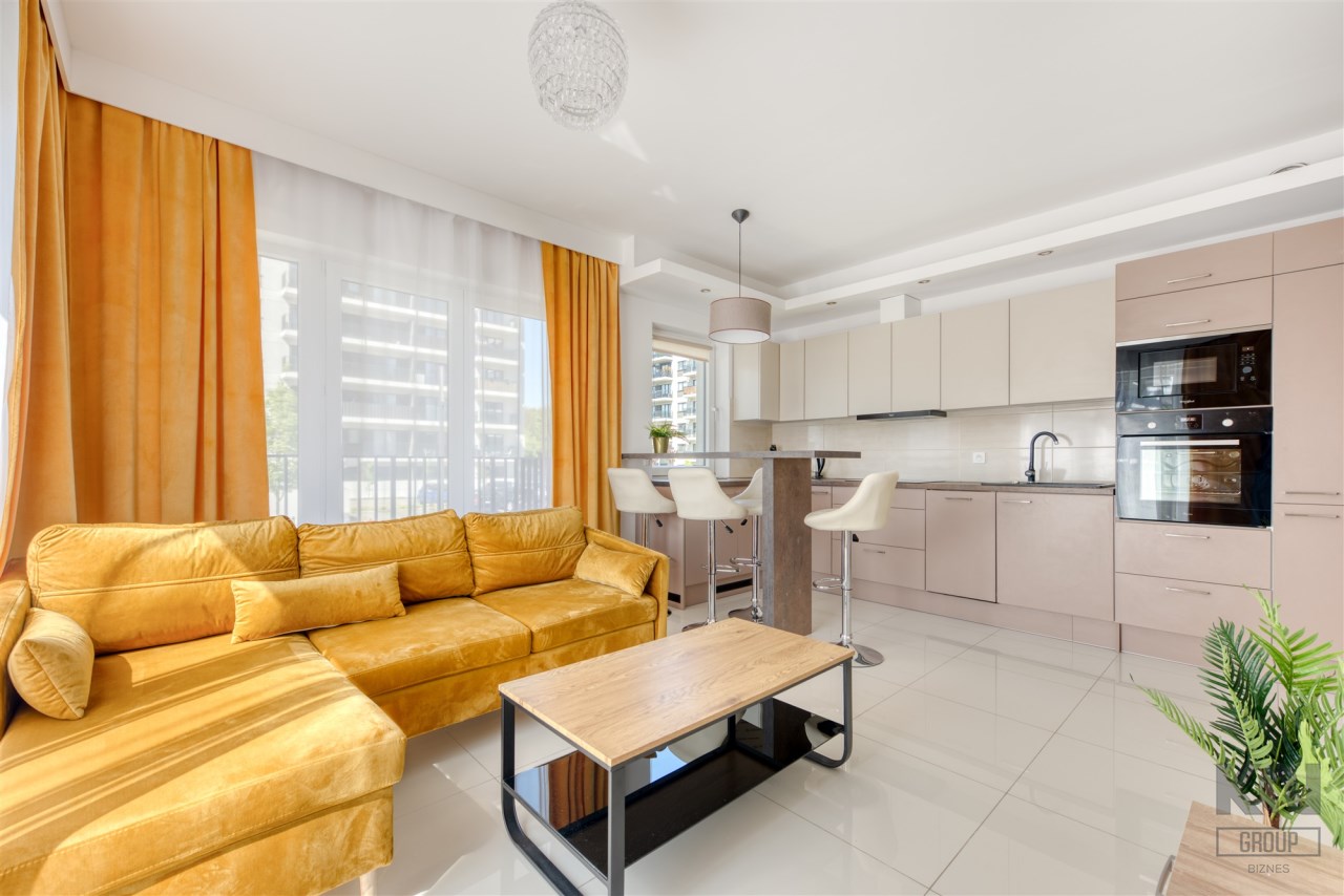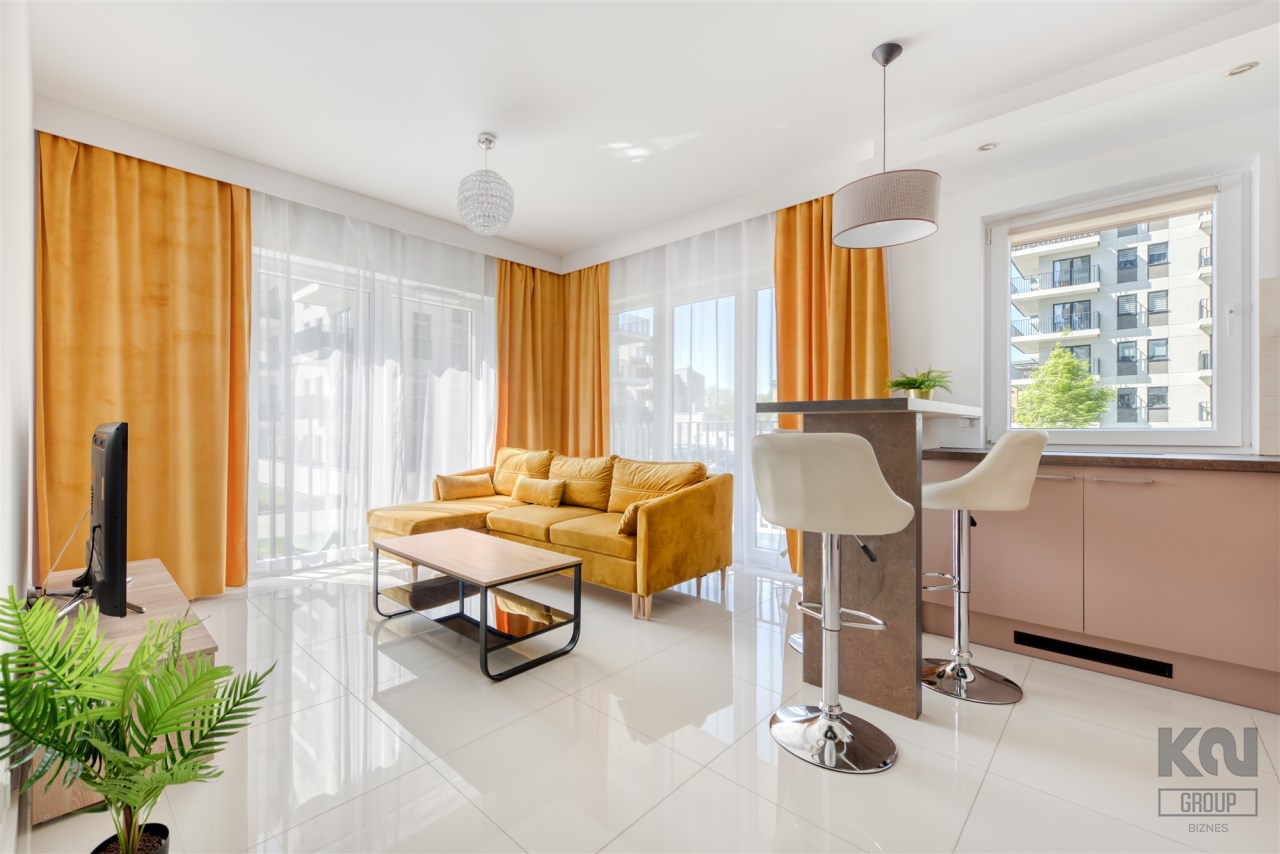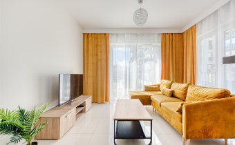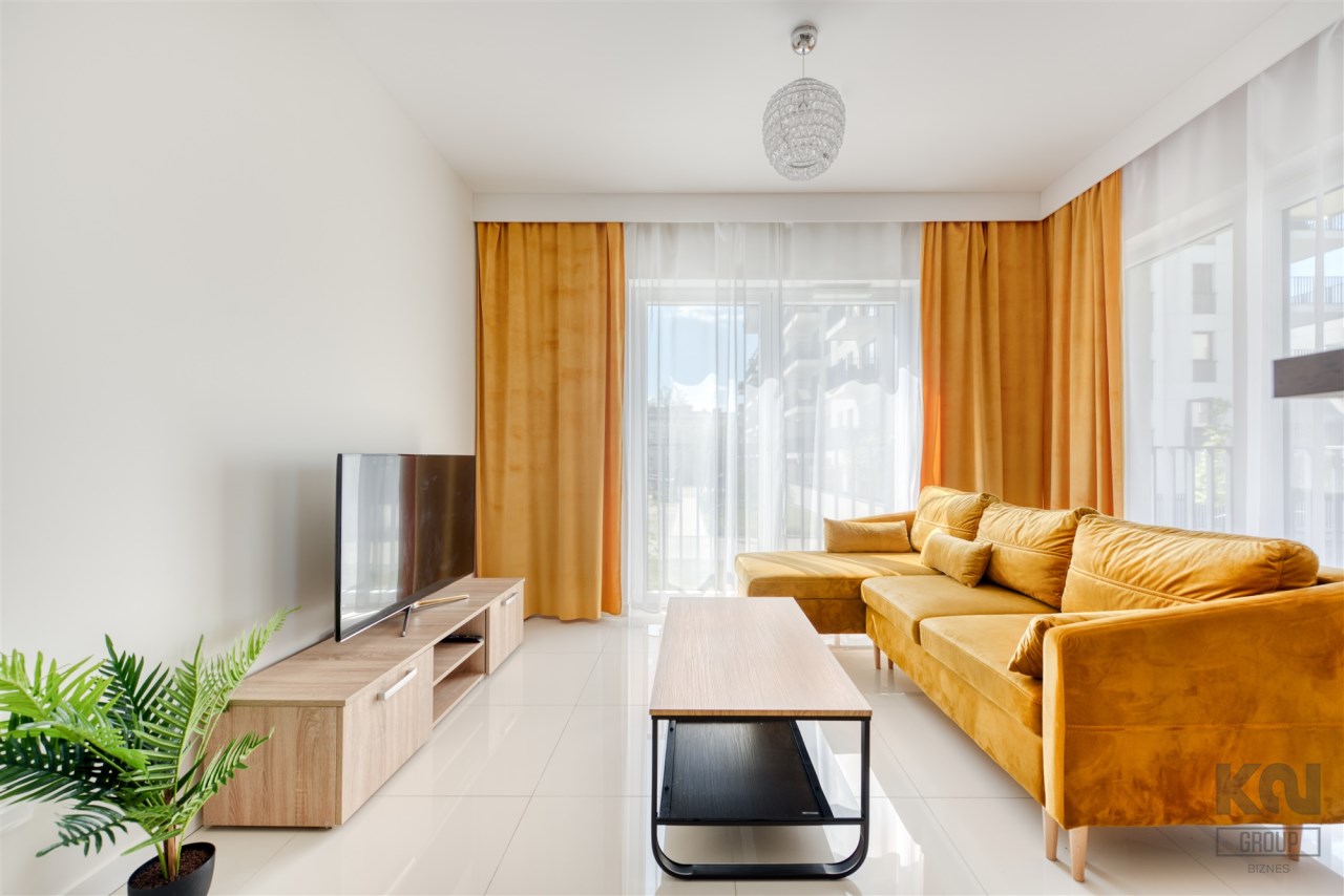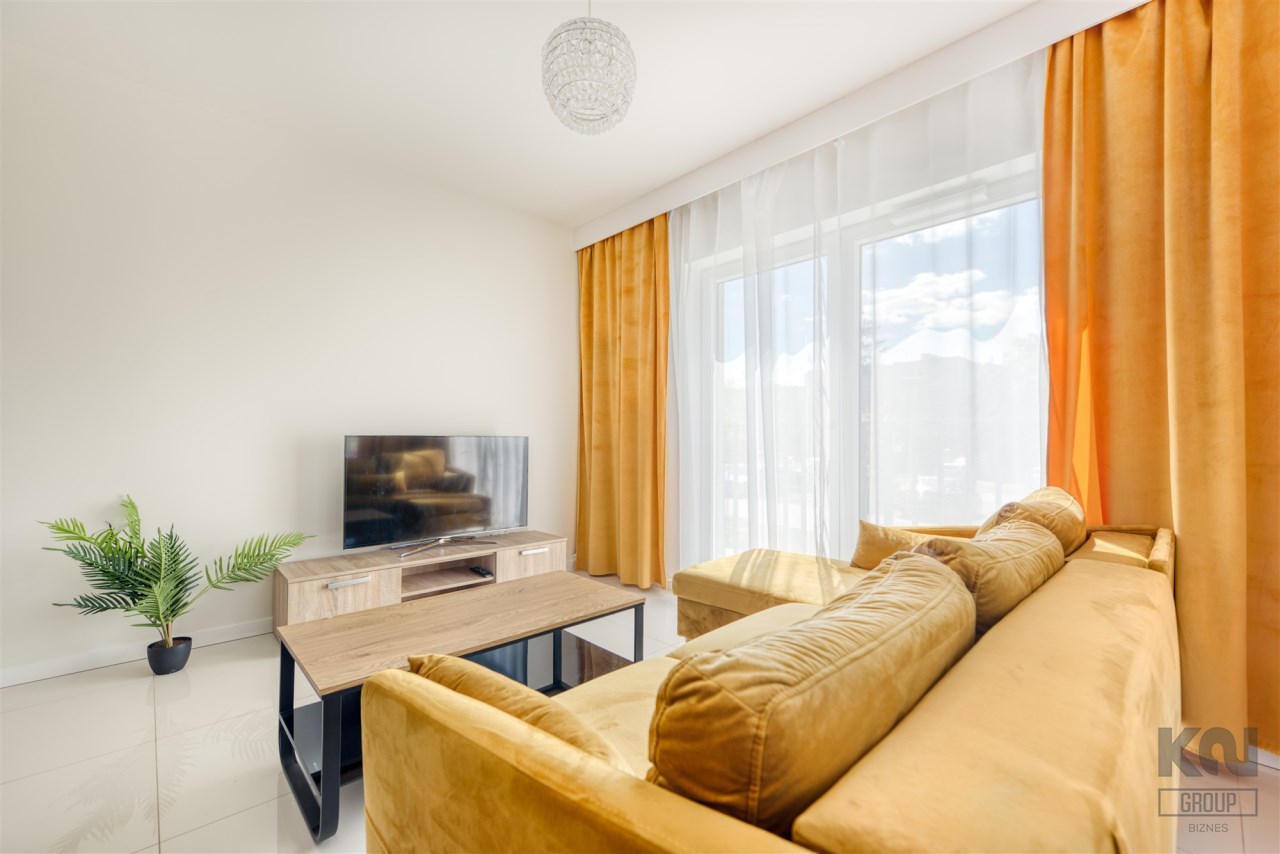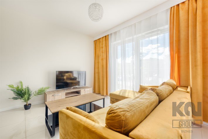 - pokój dzienny z wyjściem na duży, słoneczny balkon (wyposażony w sofę, stoli kawowy i szafkę RTV);