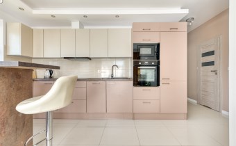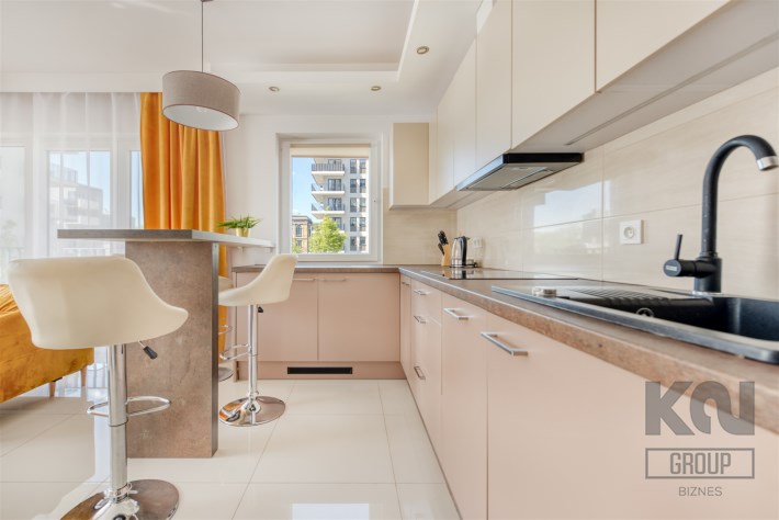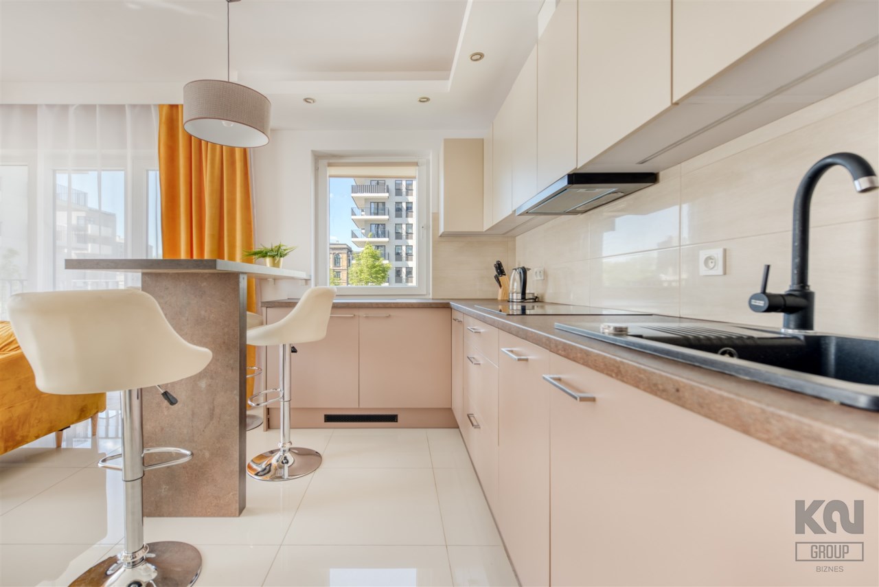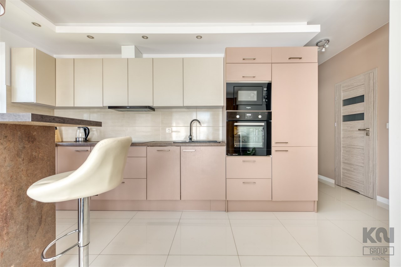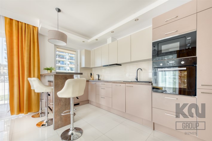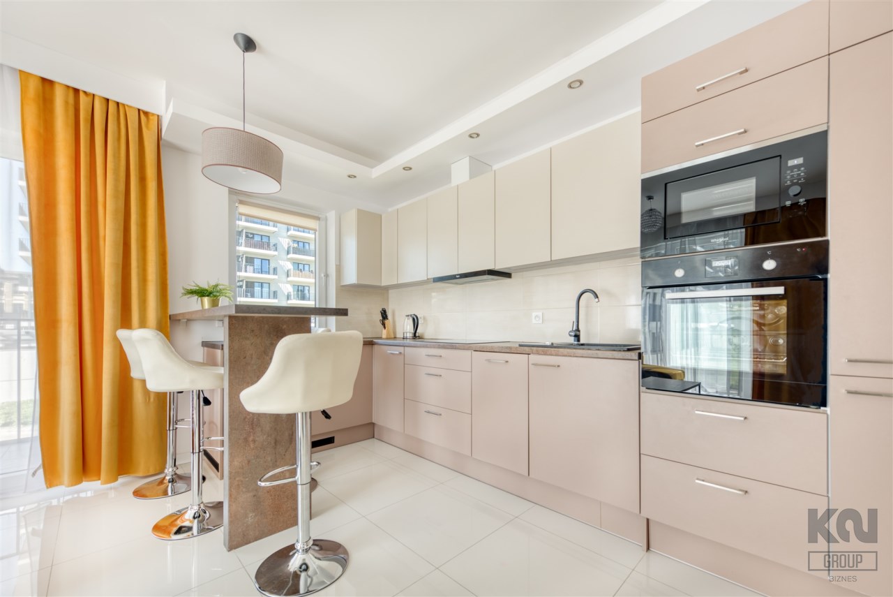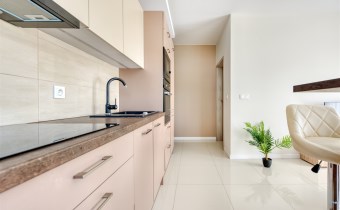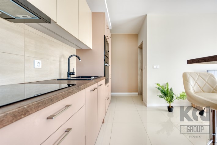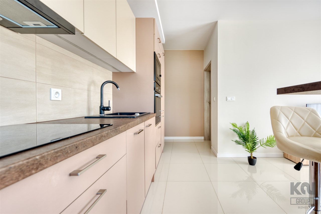 - kompletnie wyposażony aneks kuchenny (płyta indukcyjna, piekarnik, mikrofalówka, zmywarka, lodówko-zamrażarka);