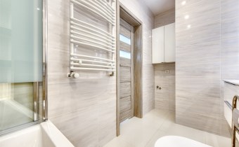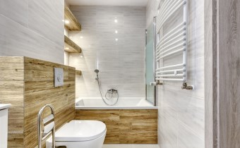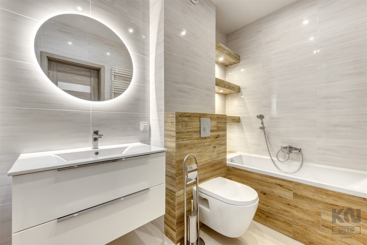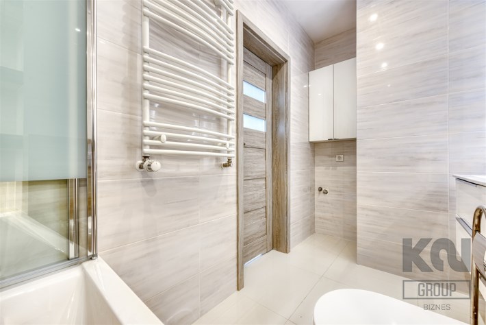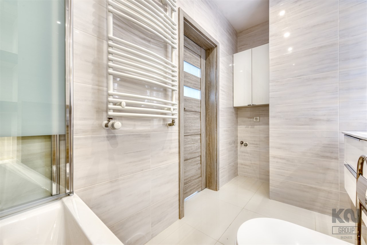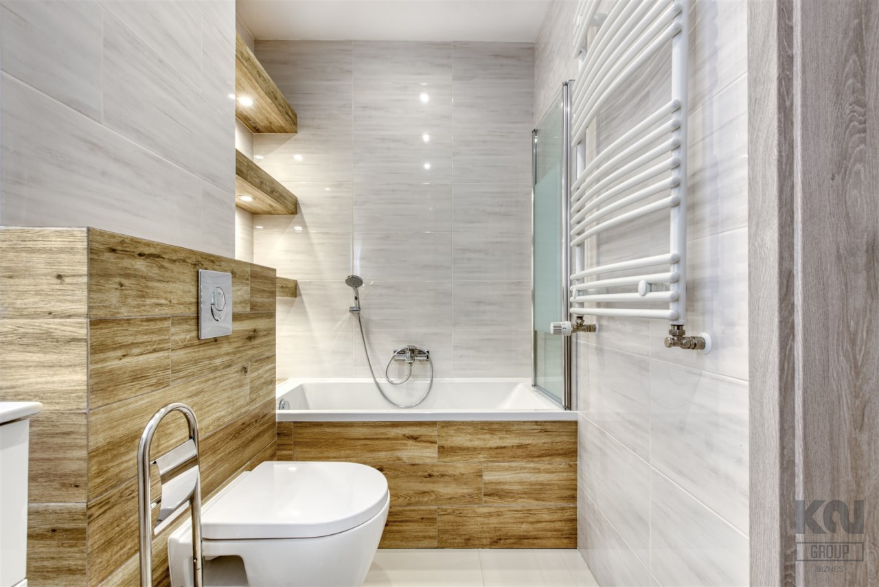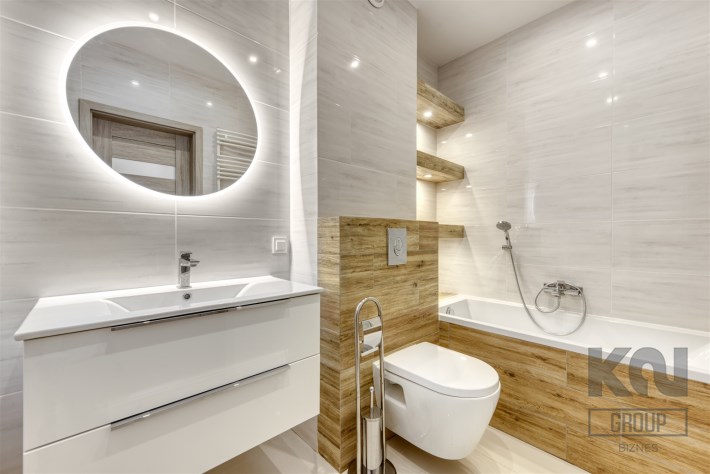 - świetnie zaprojektowaną łazienkę z WC wyposażoną w wannę z funkcją prysznica oraz pralkę;