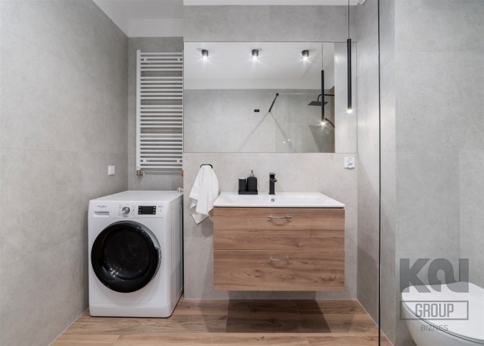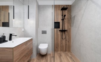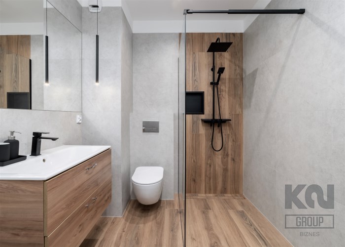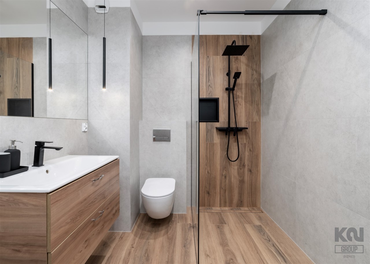 - nowoczesną łazienkę z WC wyposażoną w prysznic oraz