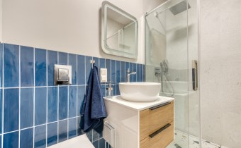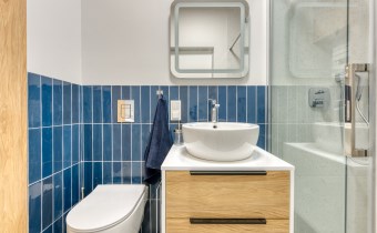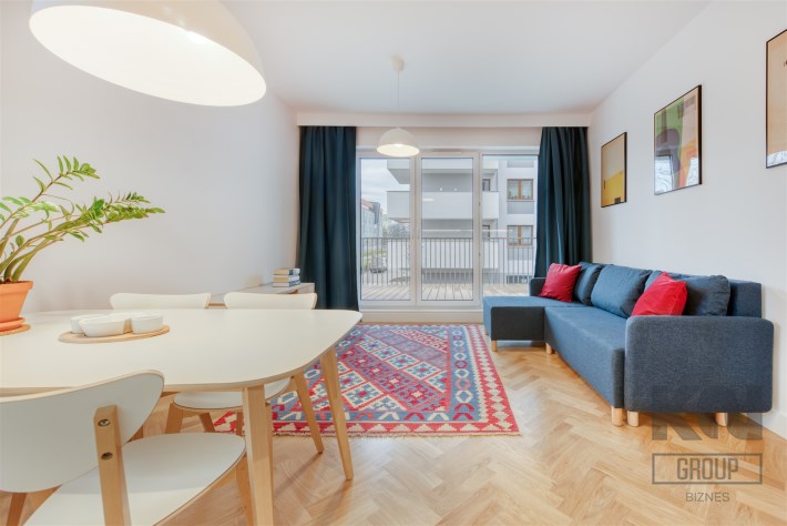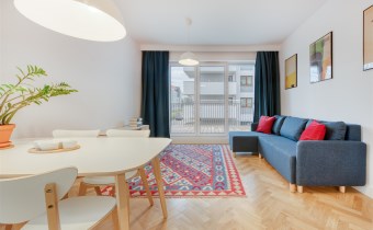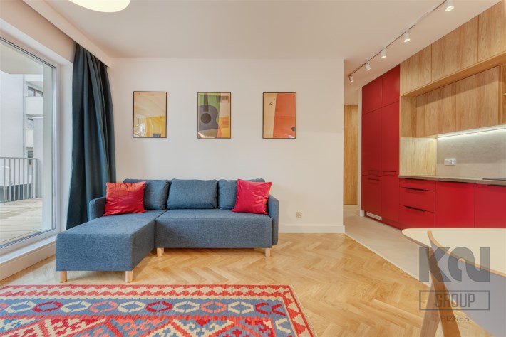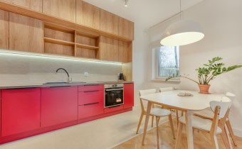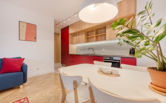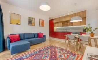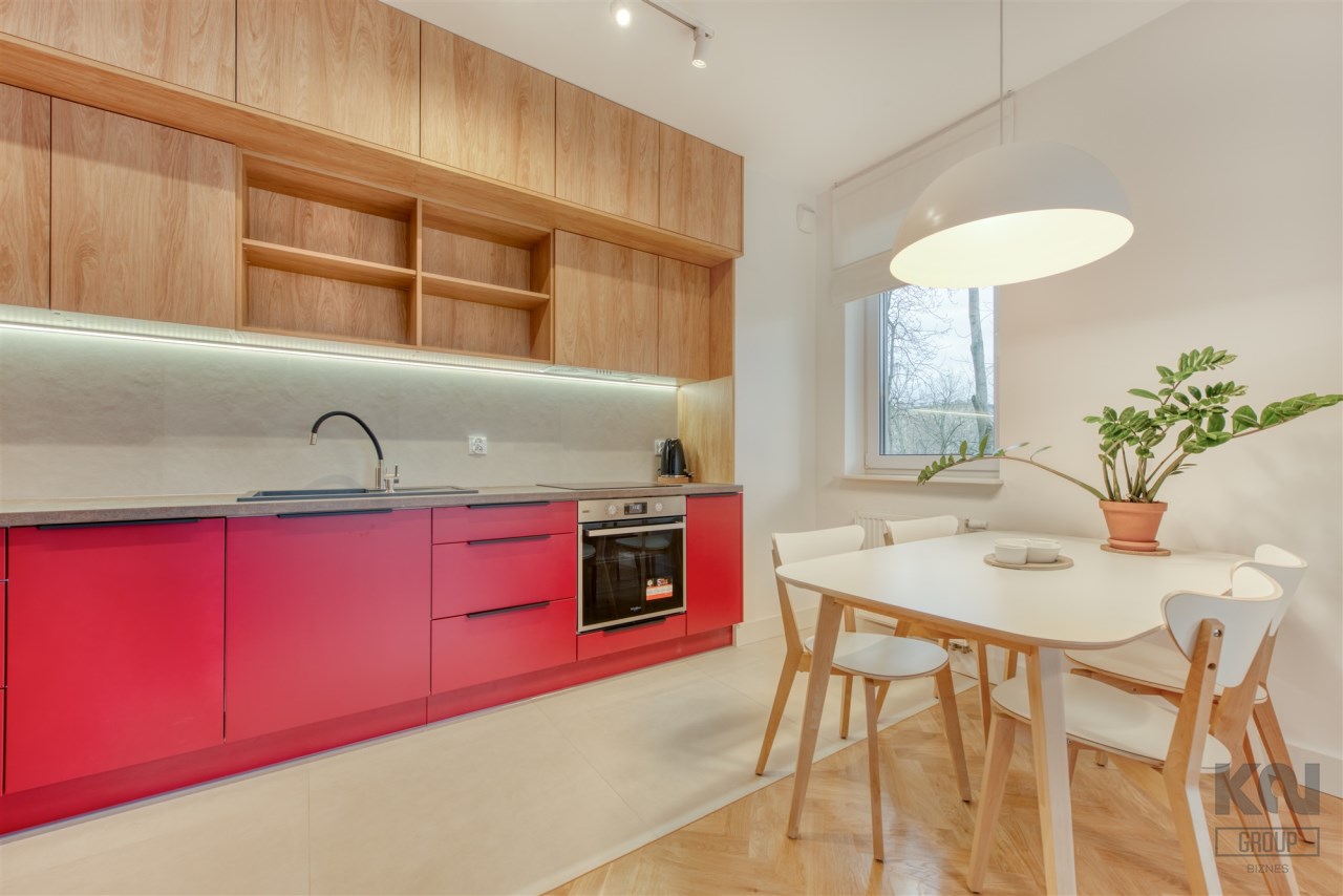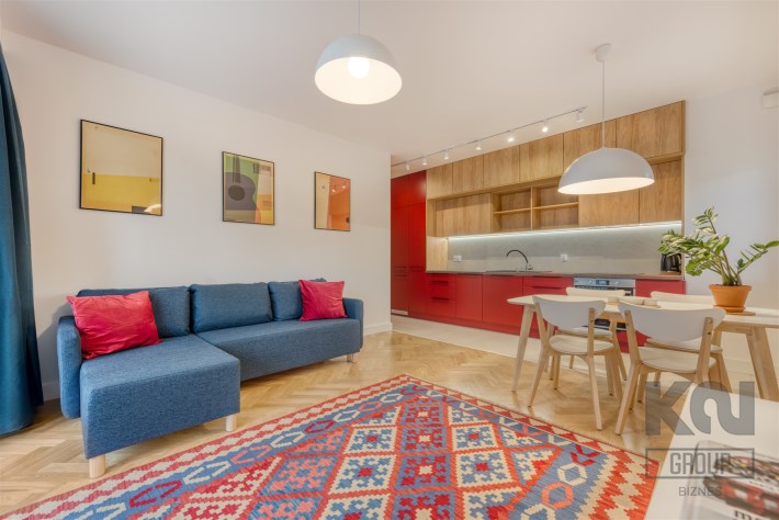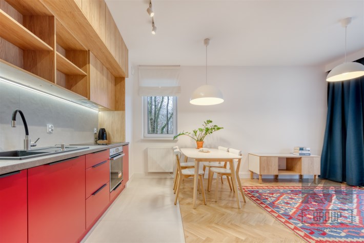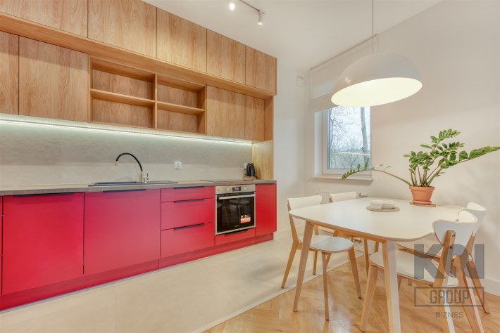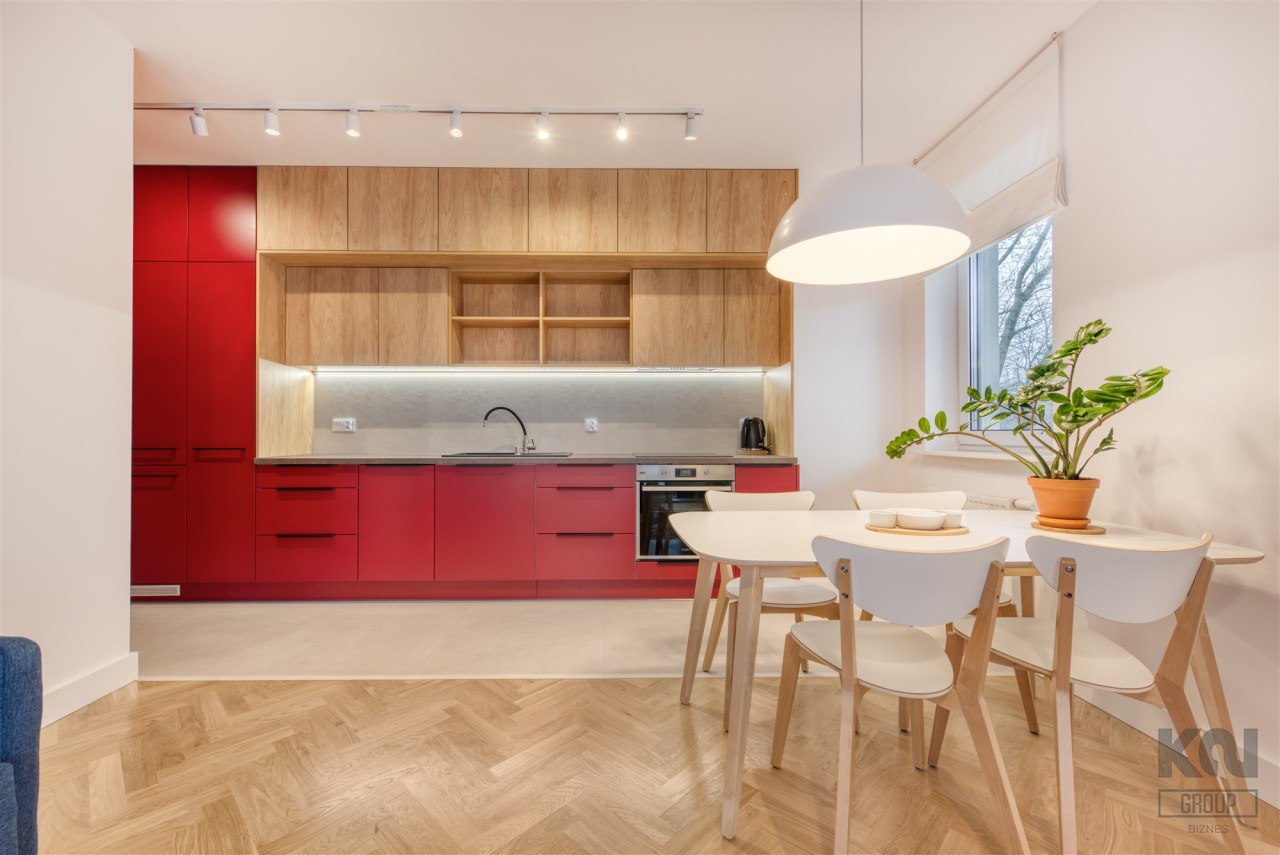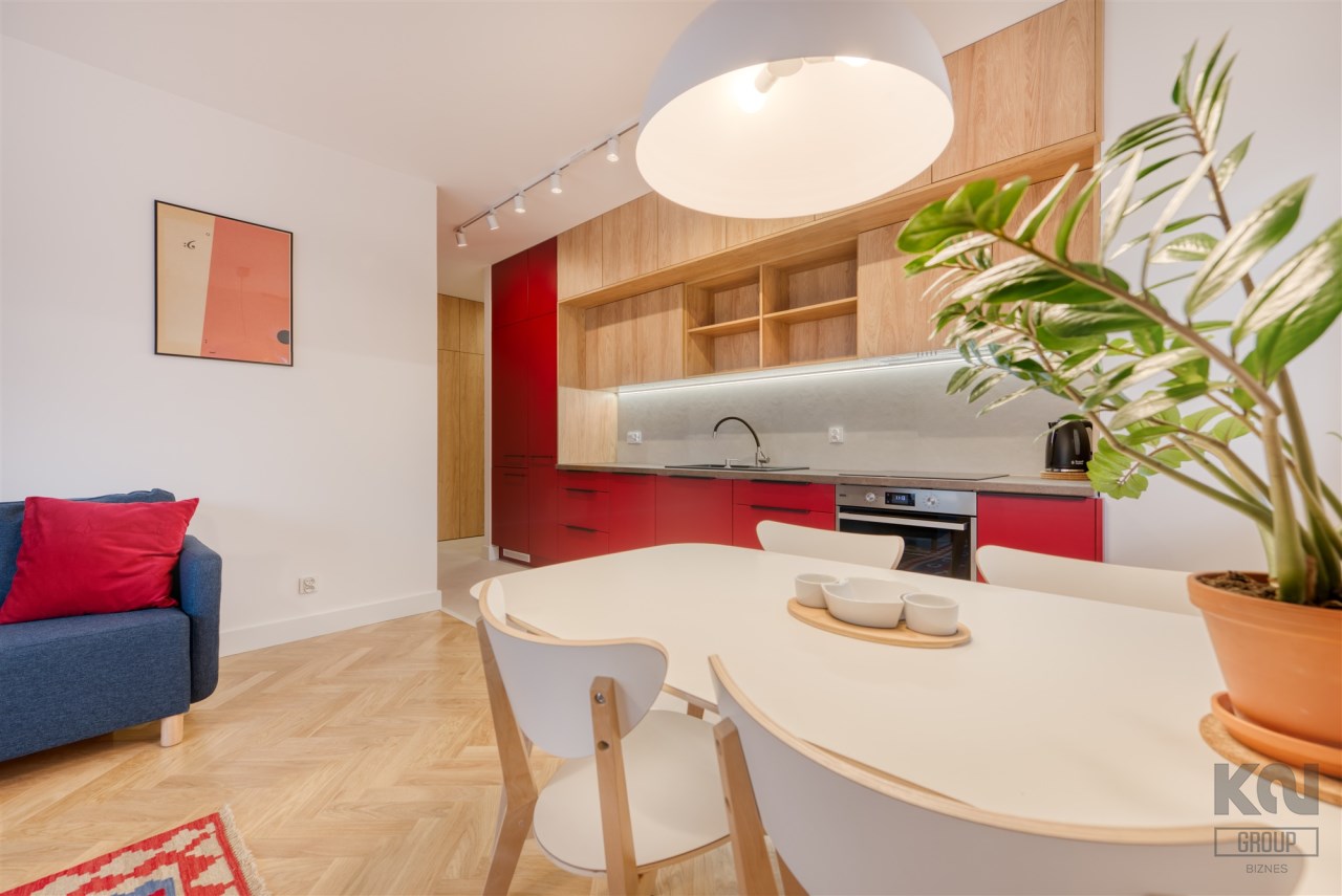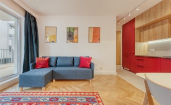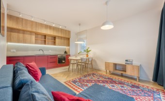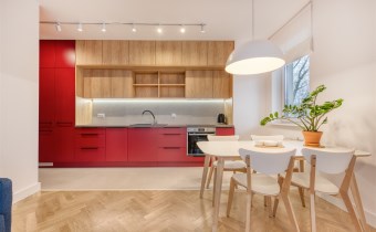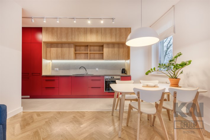 - funkcjonalny aneks kuchenny (wyposażony w płytę indukcyjną, okap, piekarnik, lodówko-zamrażarkę i zmywarkę);
