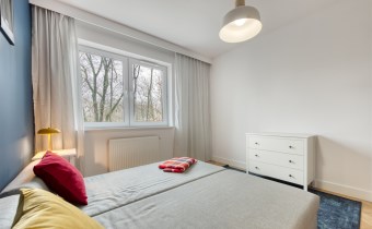 - przytulną sypialnię (wyposażoną w podwójne łóżko, pojemną szafę i komodę);