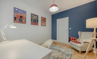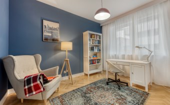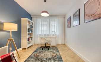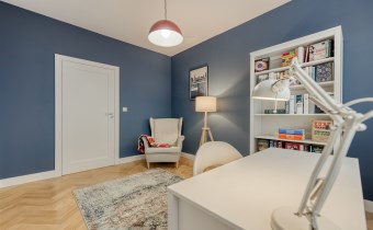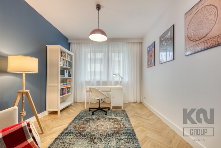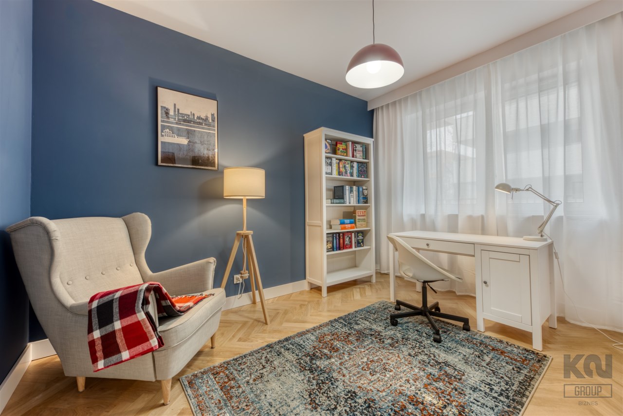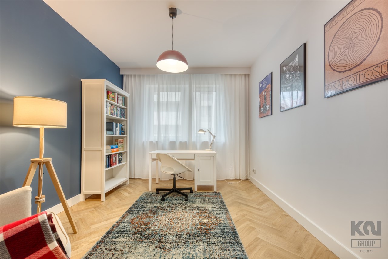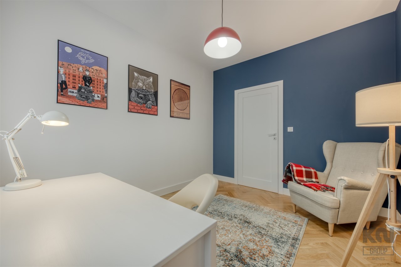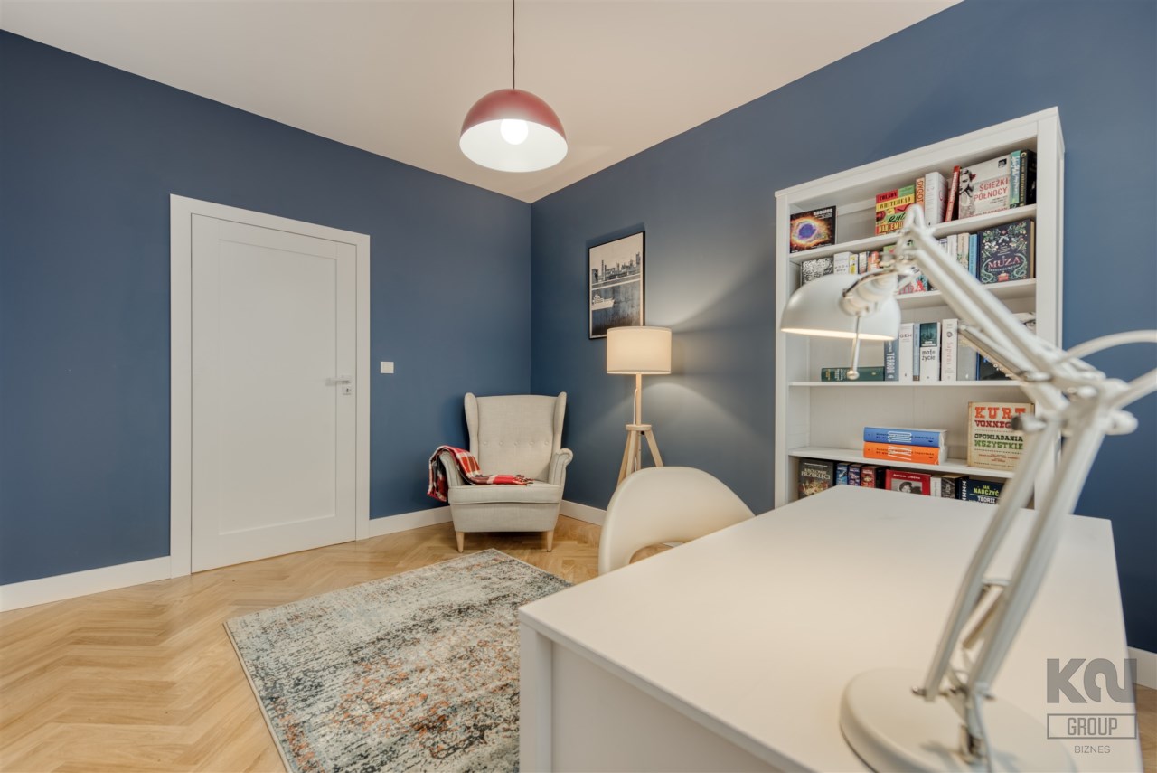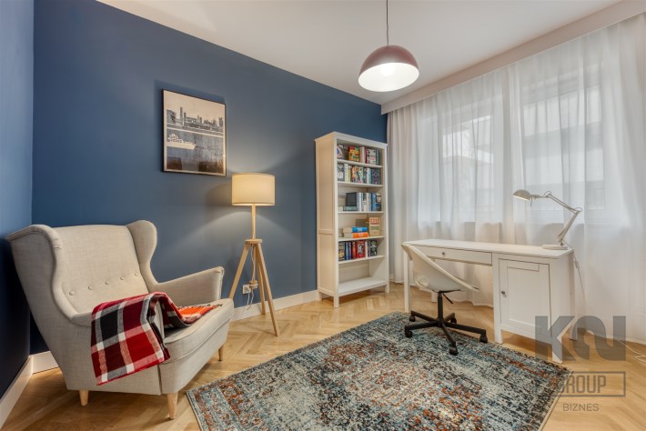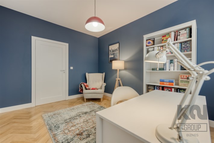 - pokój mogący pełnić funkcję gabinetu, dodatkowej sypialni lub pokoju dla dziecka (wyposażony w biurko z krzesłem, fotel oraz regał);