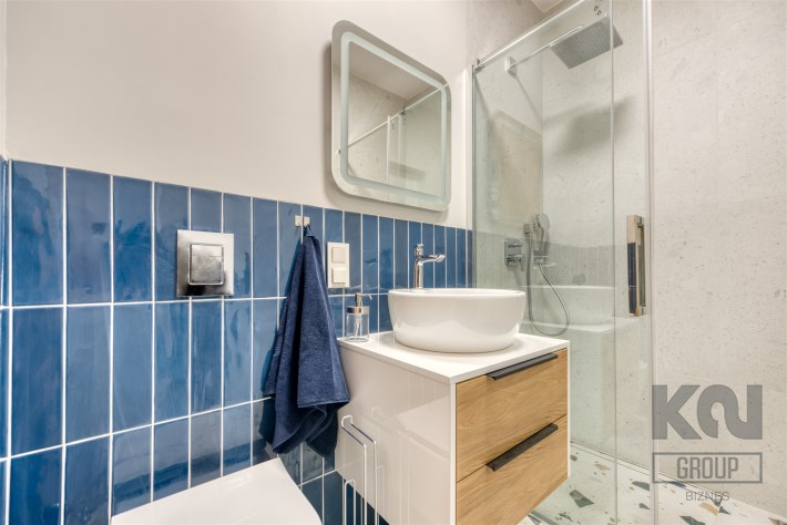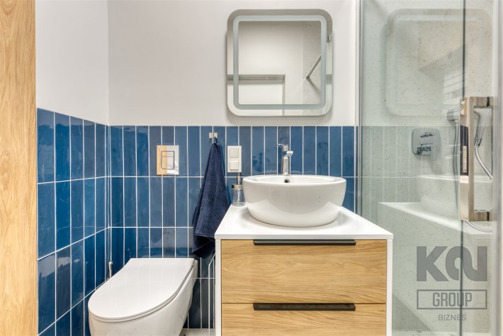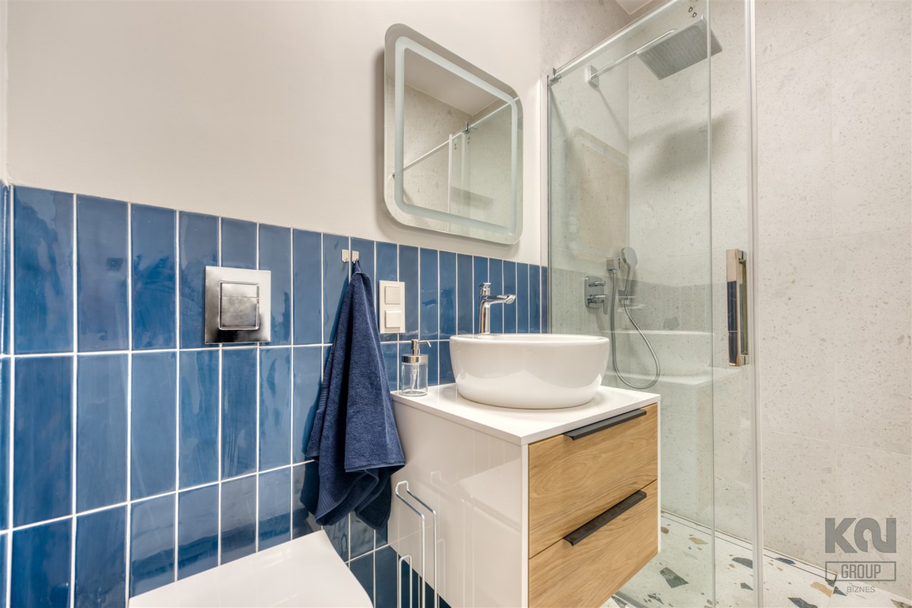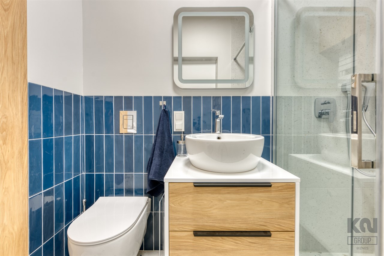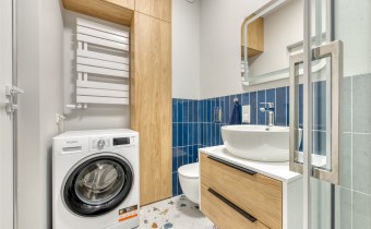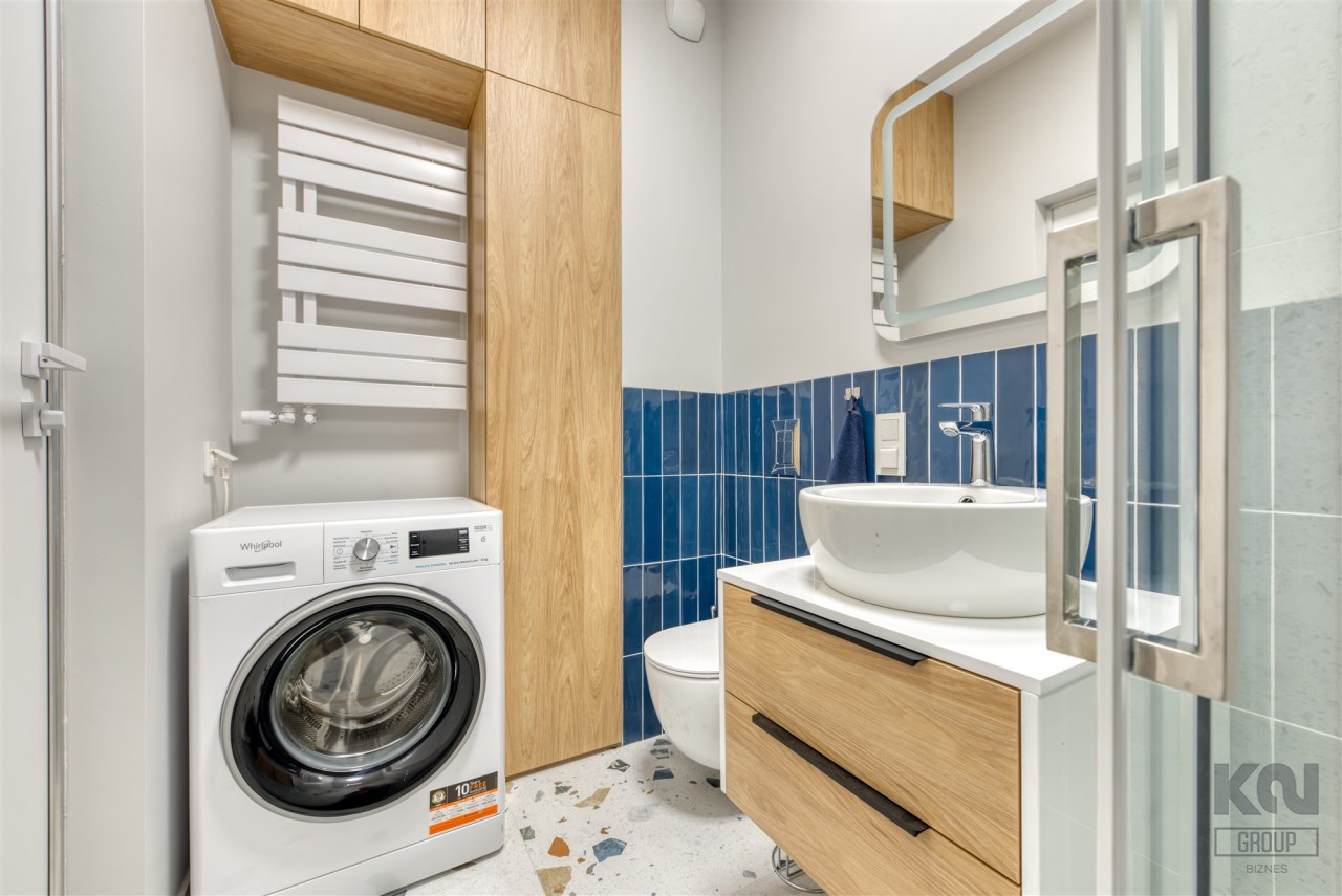 - nowoczesną łazienkę z WC (wyposażoną w natrysk, umywalkę oraz pralkę);