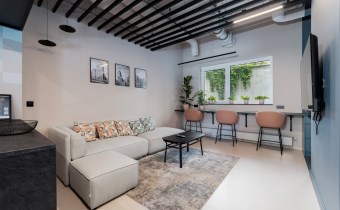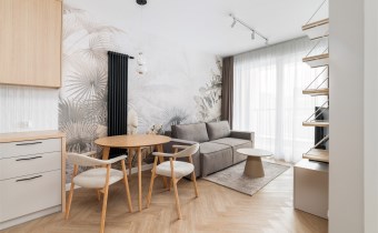 - przytulny salon wyposażony w wygodną kanapę, stół z krzesłami z wyjściem na balkon;