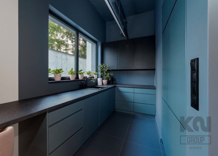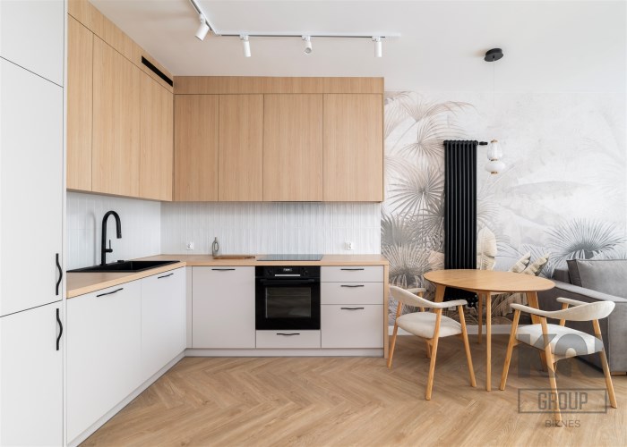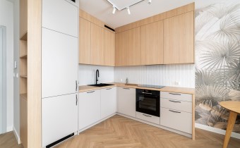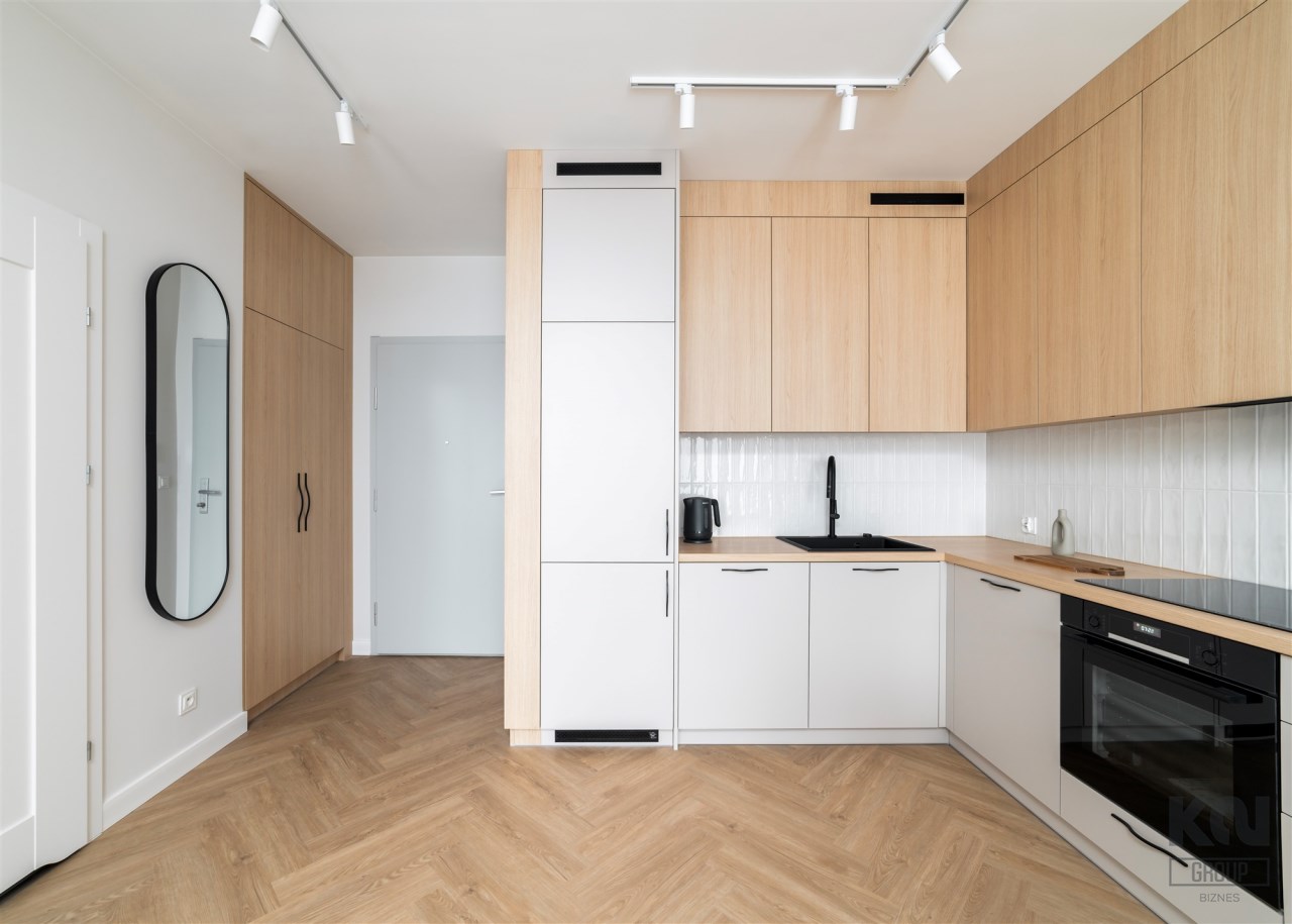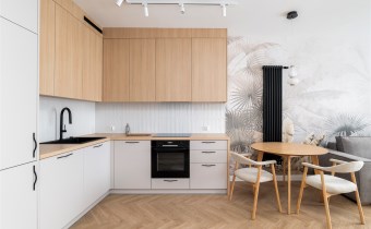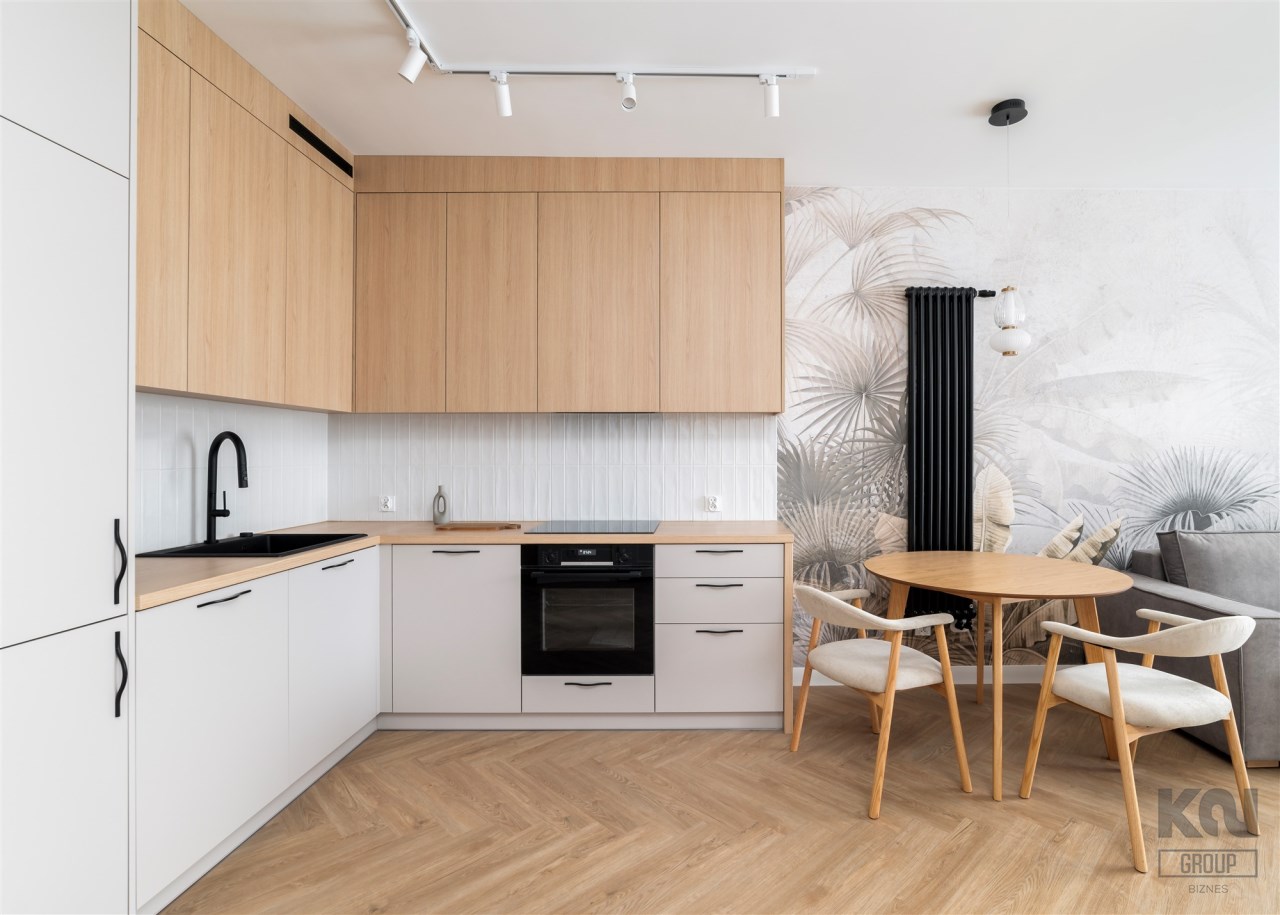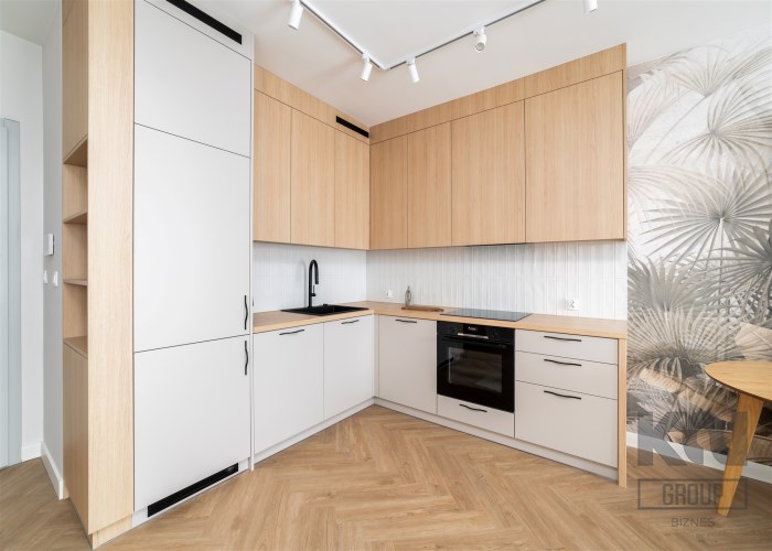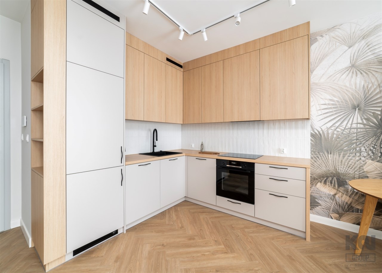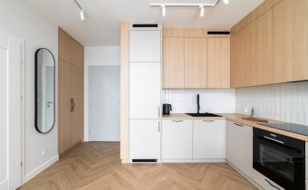 - przestronny aneks kuchenny wyposażony w płytę indukcyjną, okap, piekarnik, lodówkę z zamrażarką oraz zmywarkę;