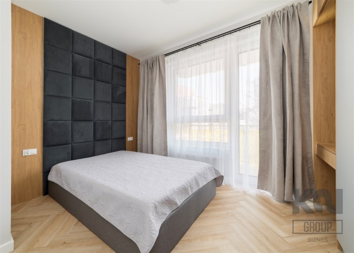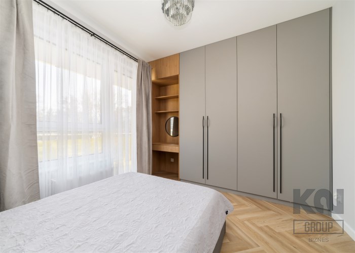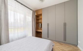 - sypialnię wyposażoną w duże łóżko i pojemną zabudowę;