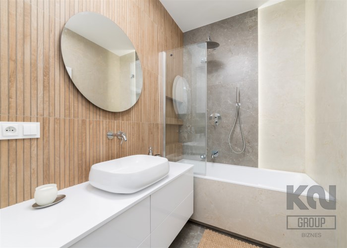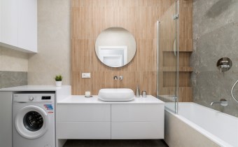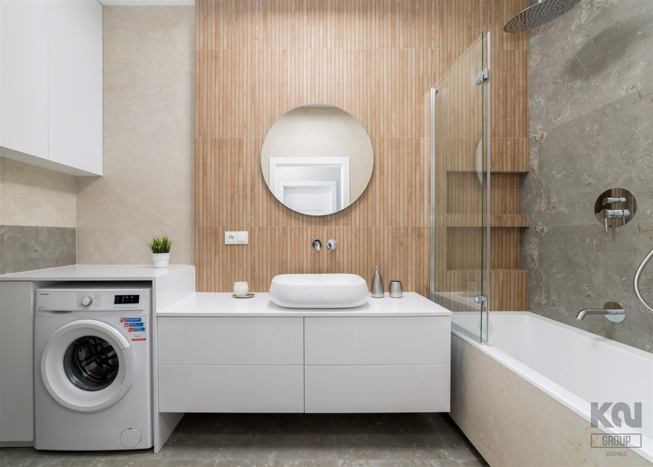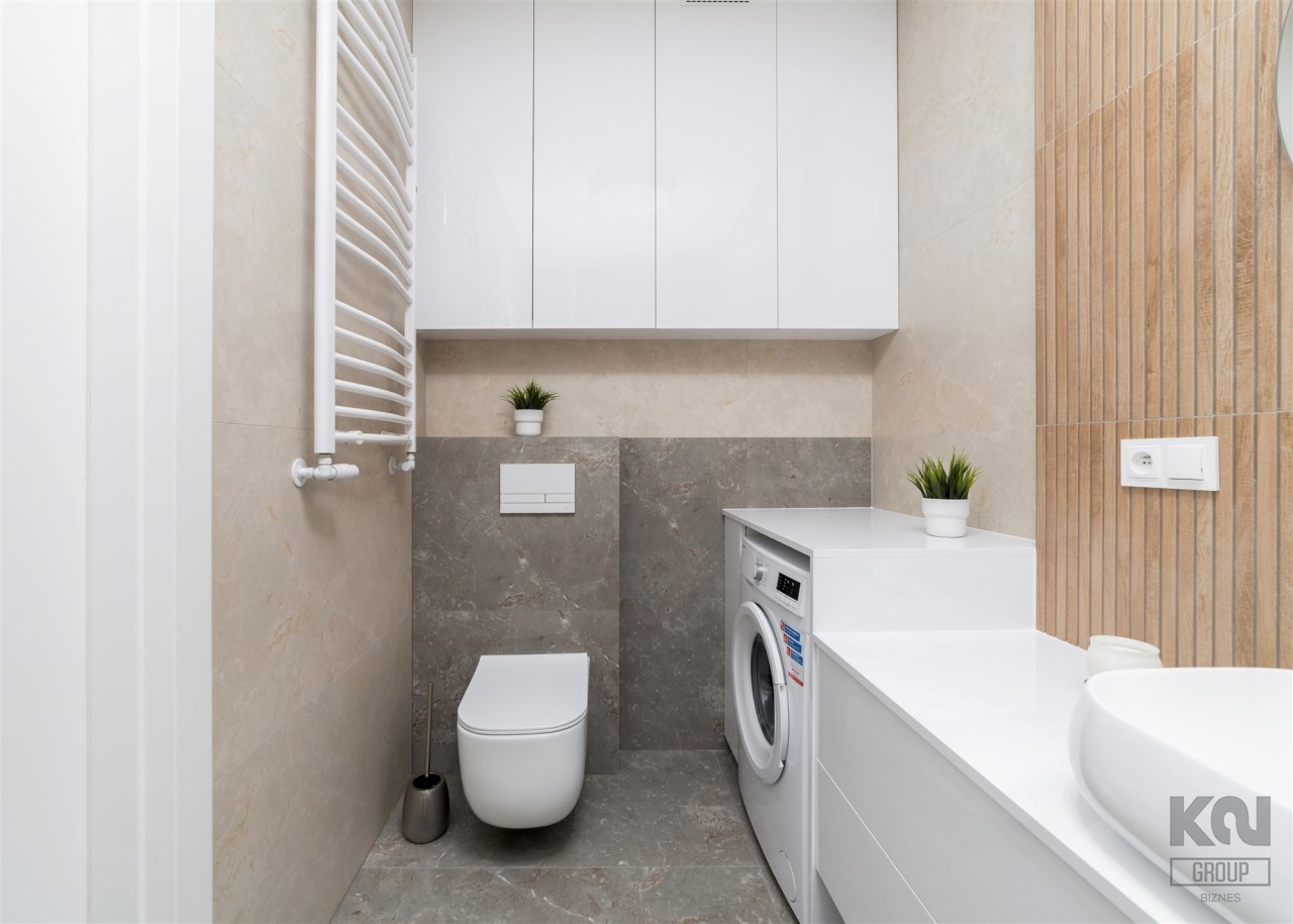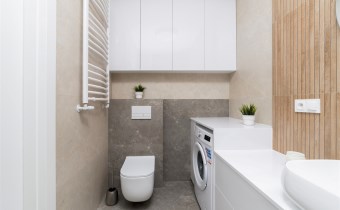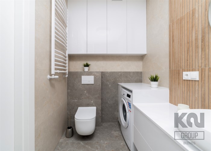 - łazienkę z WC wyposażoną w wannę z funkcją prysznica, umywalkę oraz pralkę;