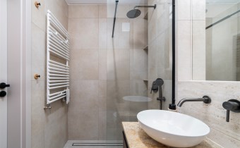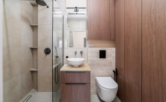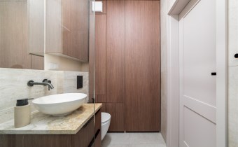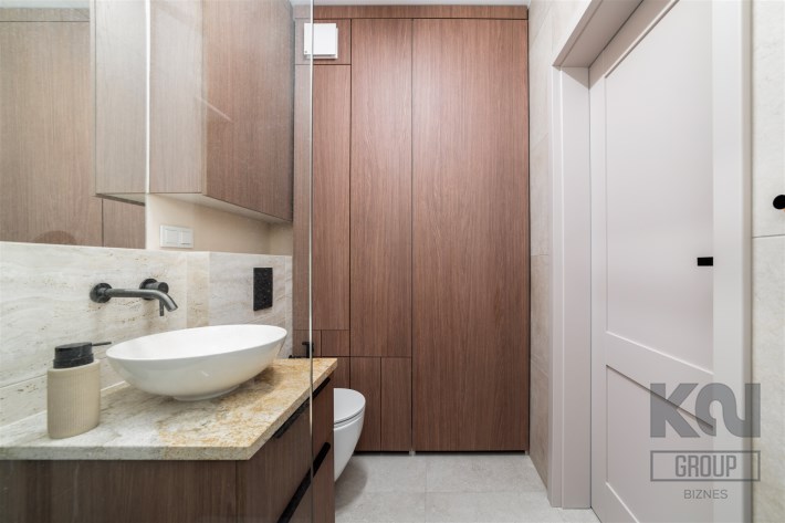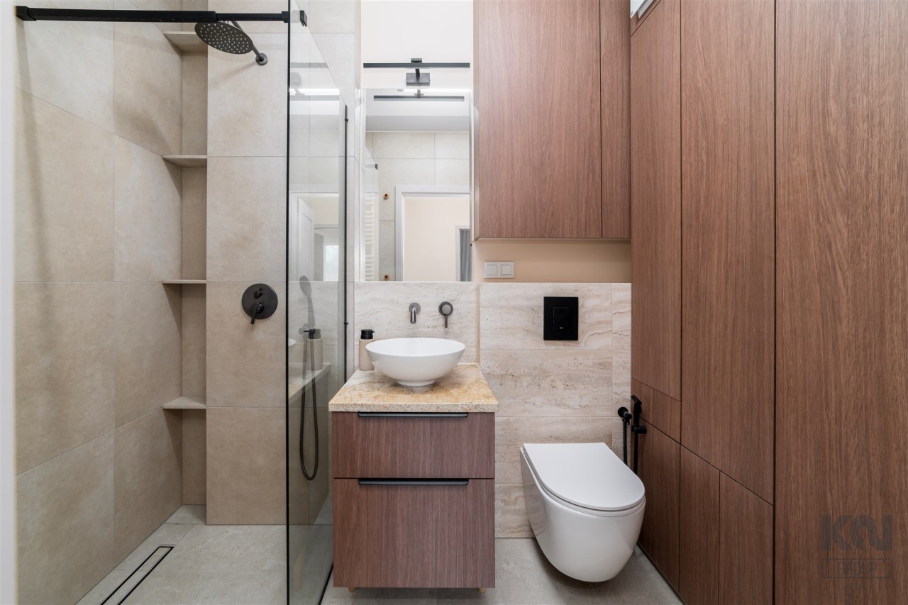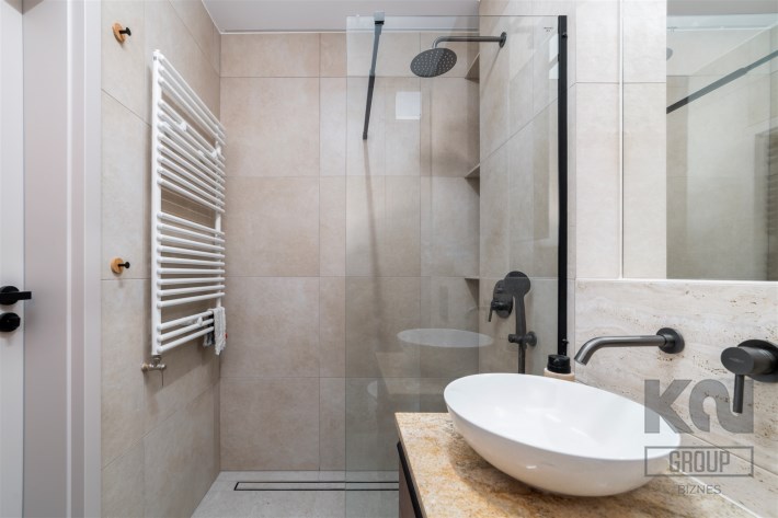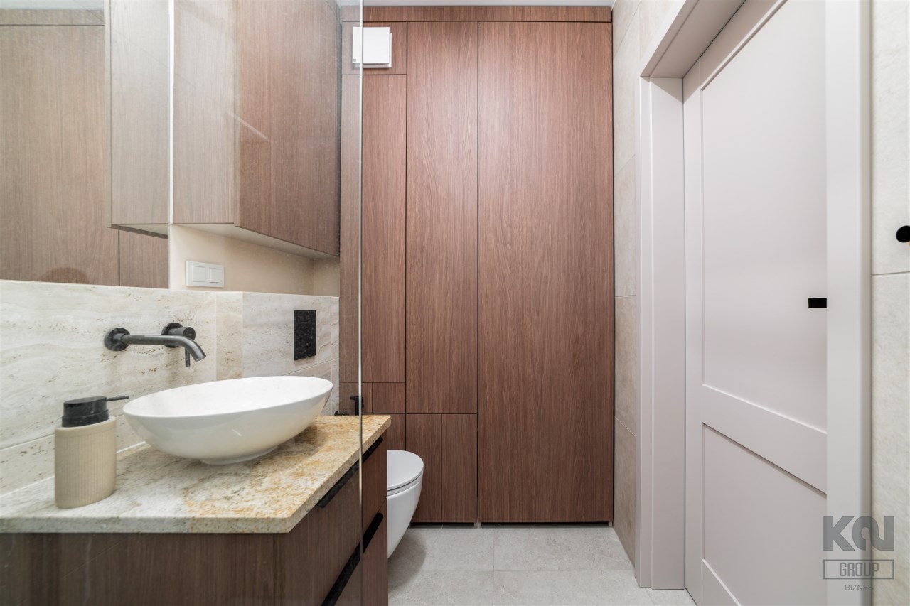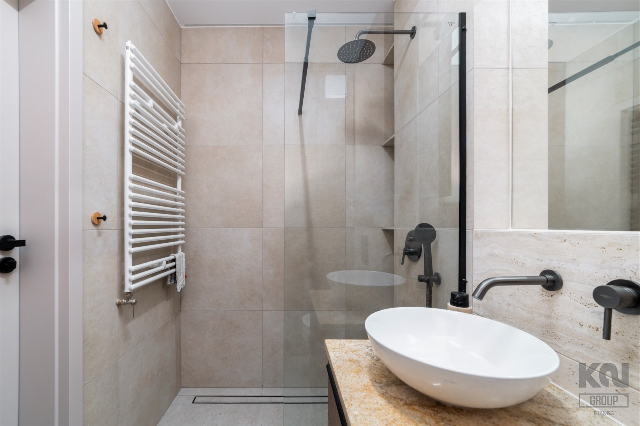 - nowoczesną łazienkę z WC wyposażoną w prysznic oraz zabudowę w której m.in znajduje się pralka;