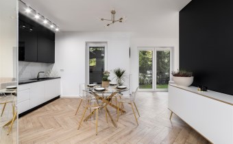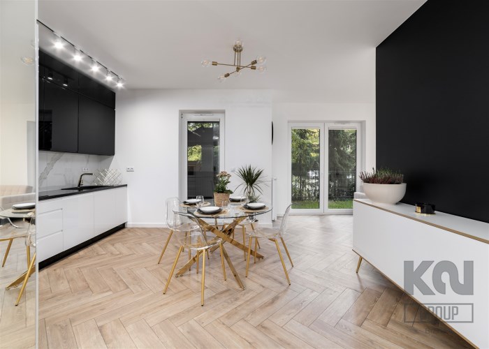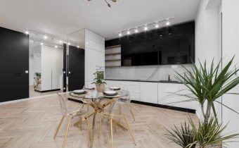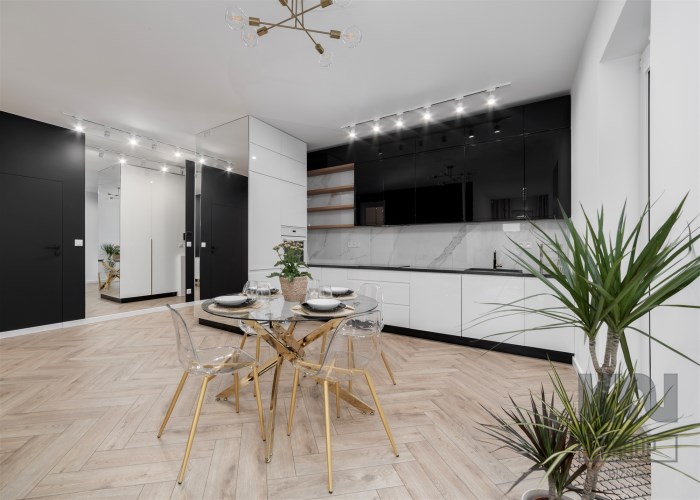 - nowocześnie urządzony salon, podzielony na część wypoczynkową z narożnikiem i jadalnianą ze stołem z 4 krzesłami;