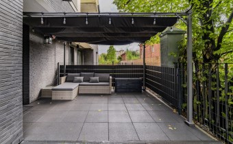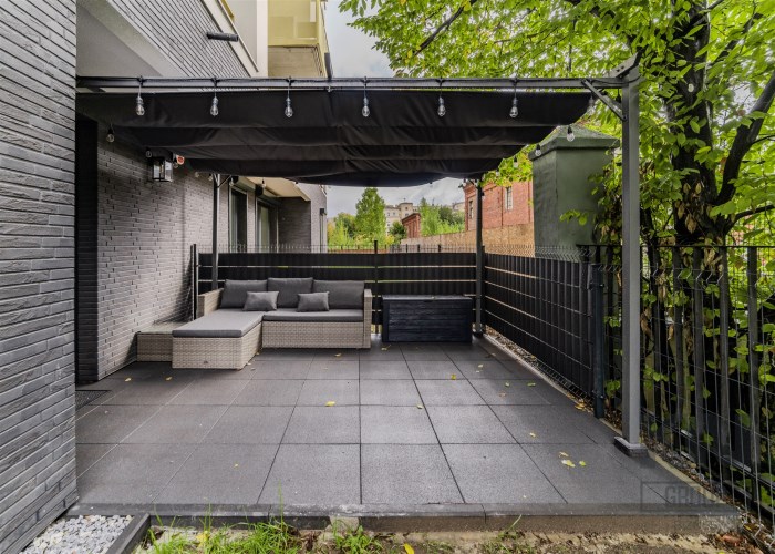 - narożny ogródek o powierzchni 80 m2 z tarasem zabudowanym tarasolą ze składanym dachem i wyposażonym w komplet mebli ogrodowych;