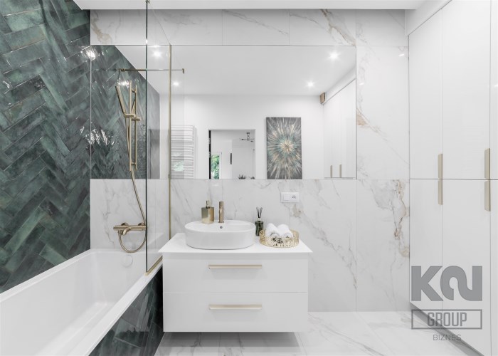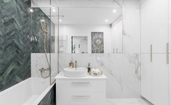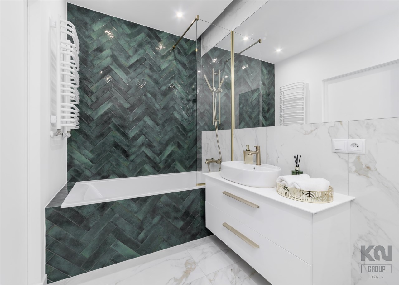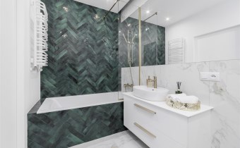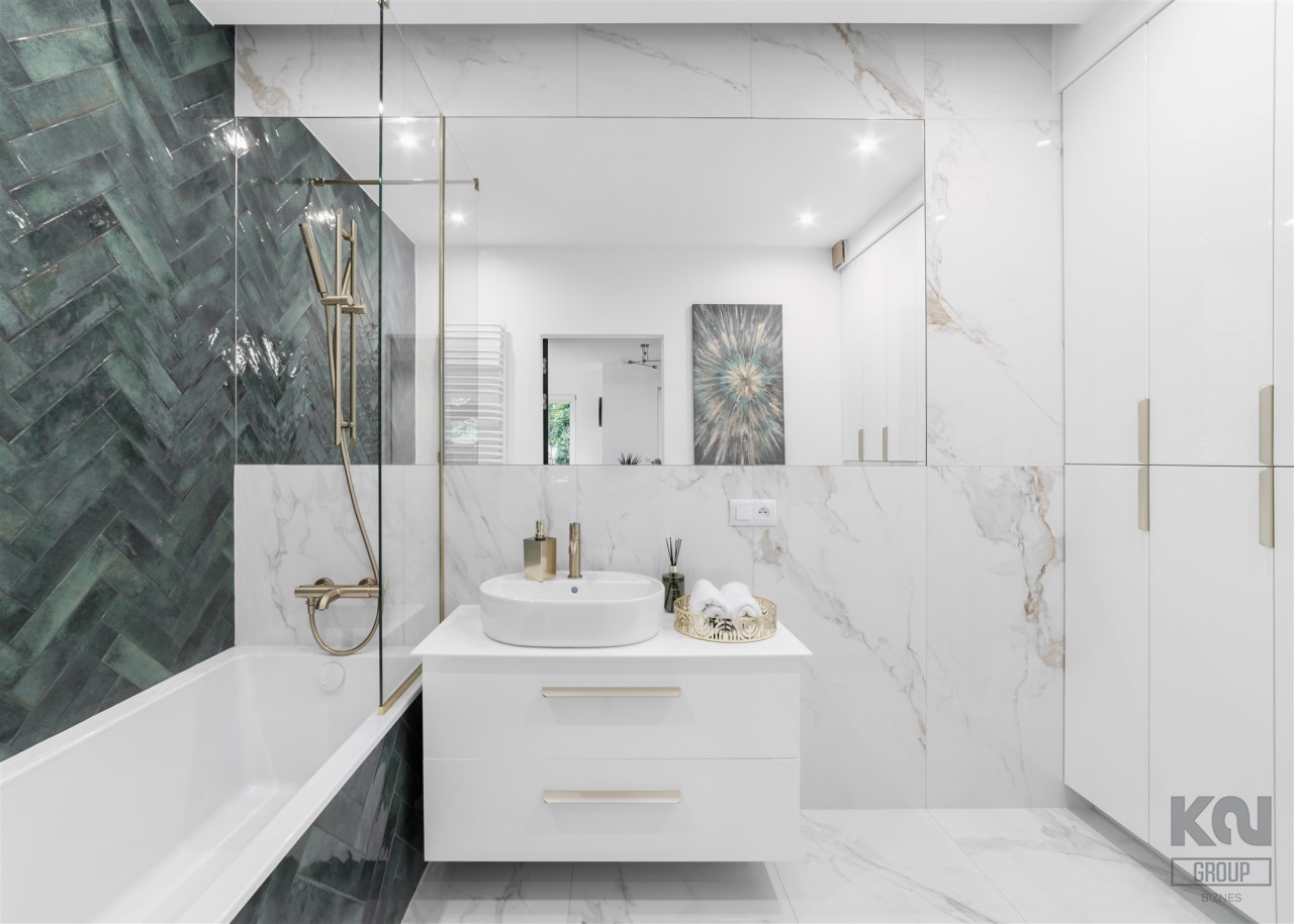 - nowoczesną łazienkę z WC wyposażoną w wannę z funkcją prysznica i umywalkę;