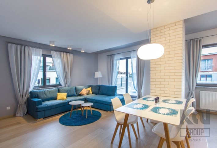 - przestronny i reprezentacyjny salon z wyjściem na duży, słoneczny taras (25,02 m2) został wyposażony w narożnik, stolik kawowy, stół z 4 krzesłami oraz TV 48".