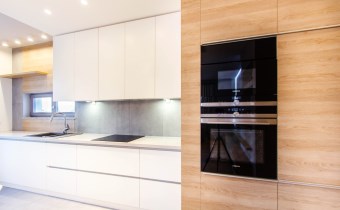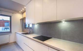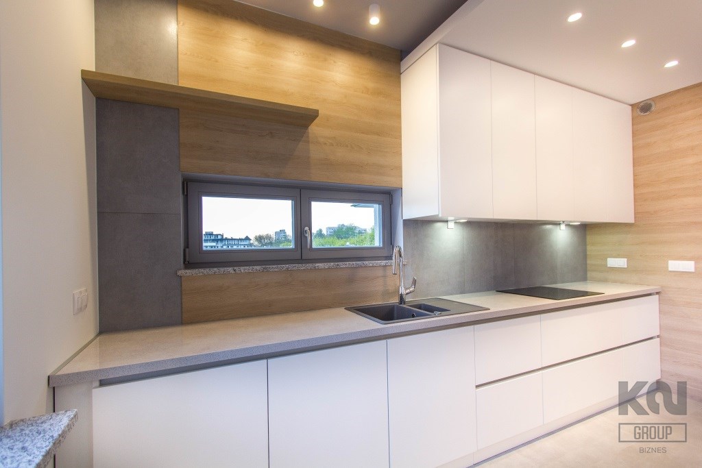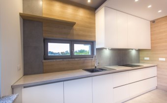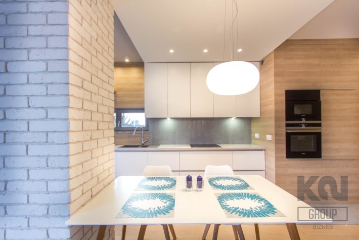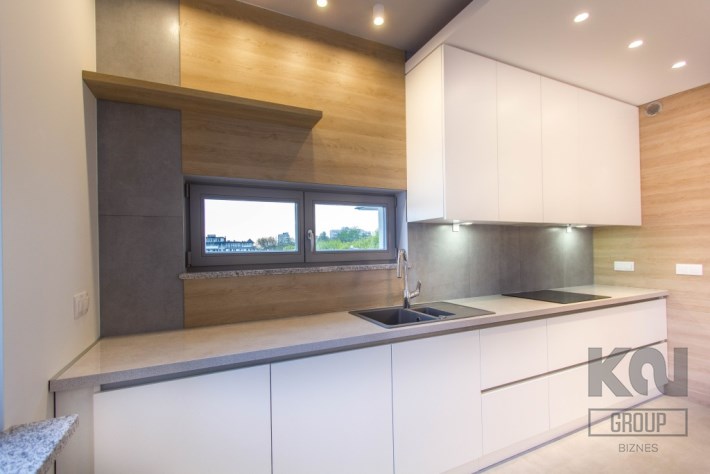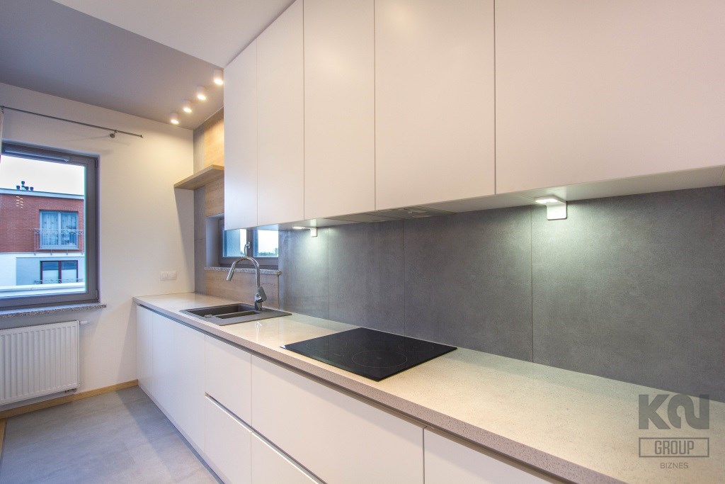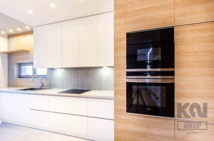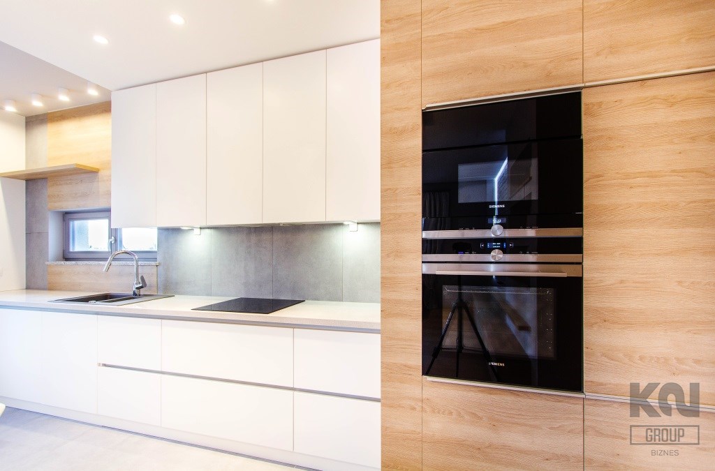 - kuchnia została zaprojektowana i wykonana na zamówienie – fronty biały lakier, wysokiej jakości blaty. Dodatkowo na wyposażeniu znajdują się: płyta indukcyjna, zmywarka, lodówko-zamrażarka, piekarnik oraz okap. Wszystkie sprzęty marki Siemens o bardzo wysokich parametrach użytkowych;