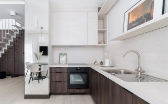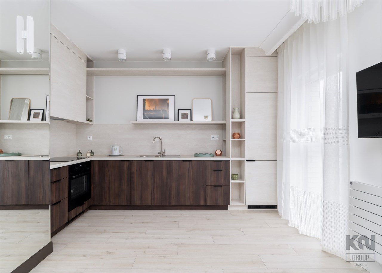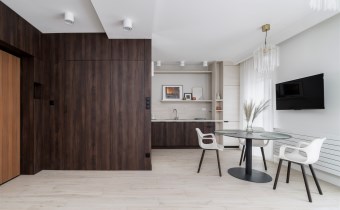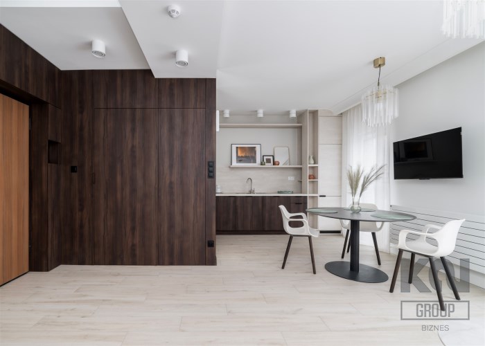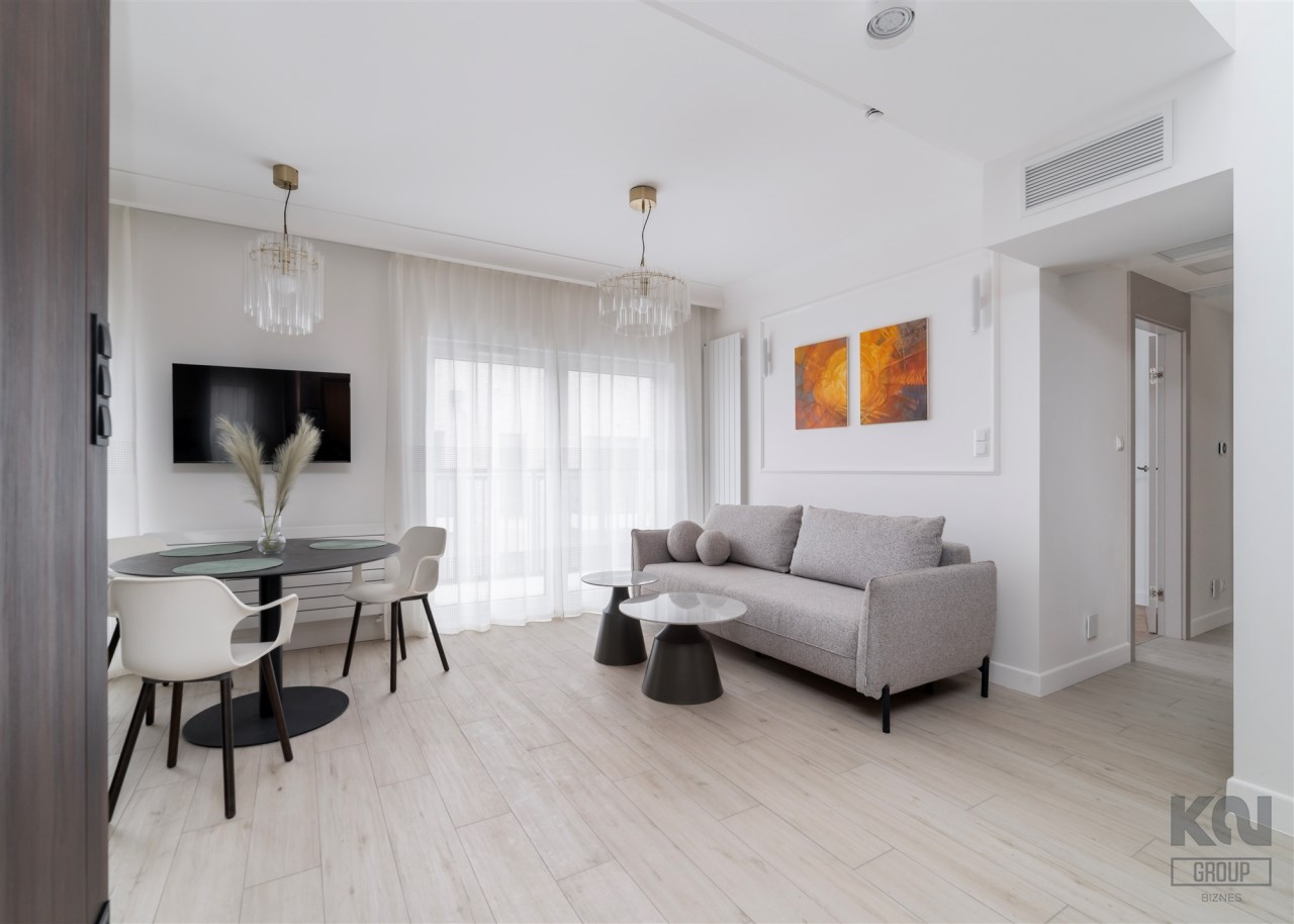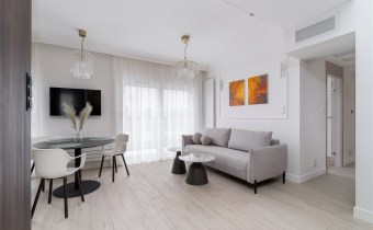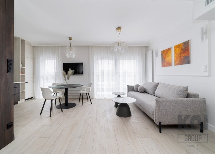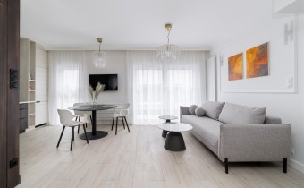 - nowoczesny salon z wygodną kanapą, częścią jadalną i wyjściem na balkon;