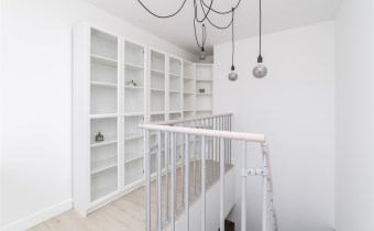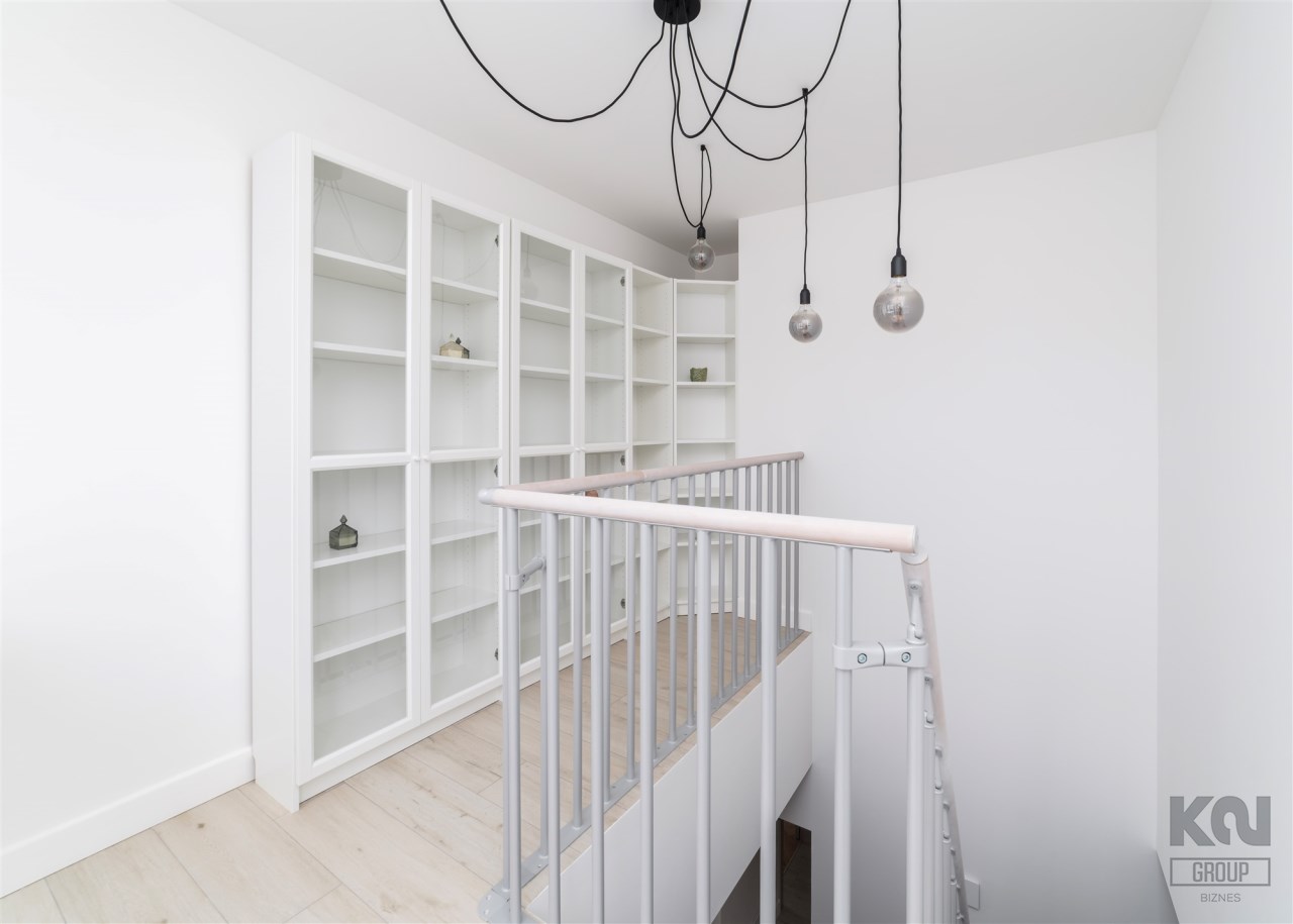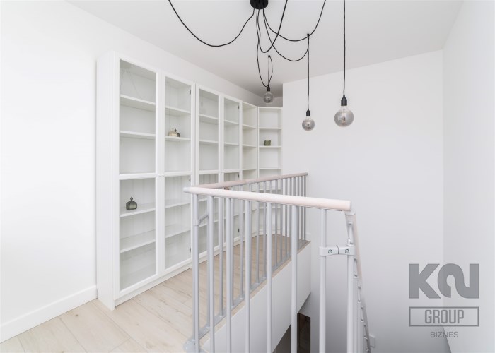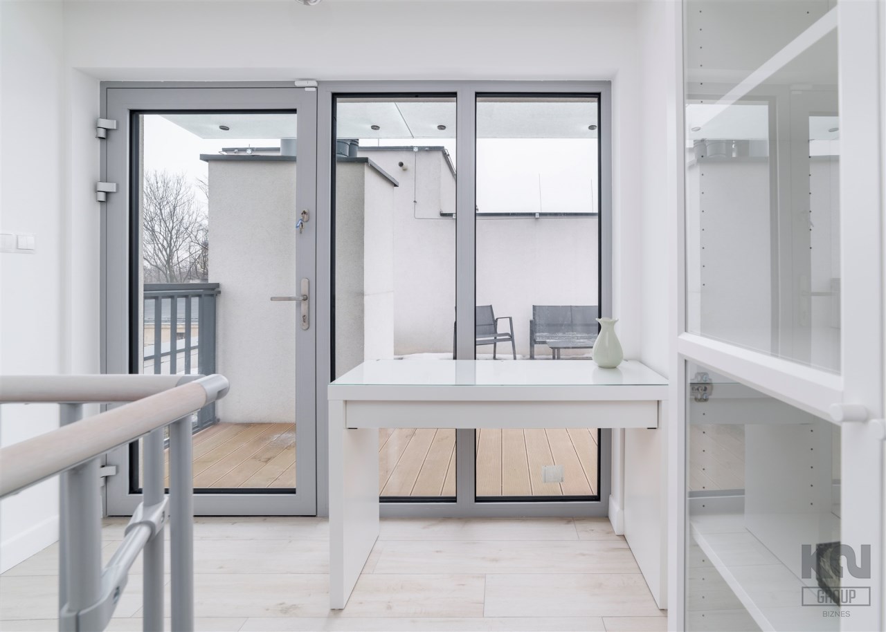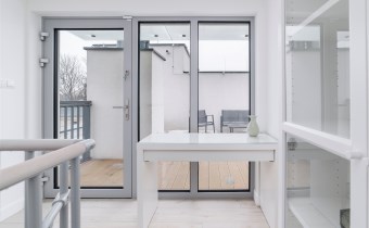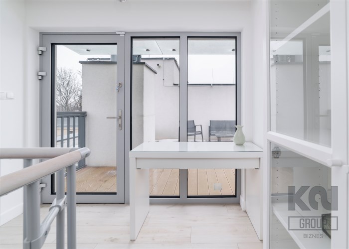 - na drugim poziomie znajduje się przestrzeń do pracy, wyposażona w biurko i witryny do przechowywania dokumentów lub książek, z wyjściem na duży słoneczny taras.