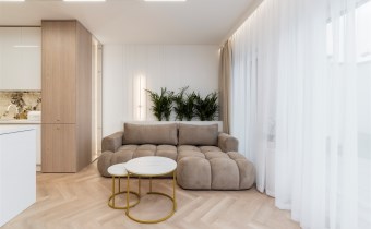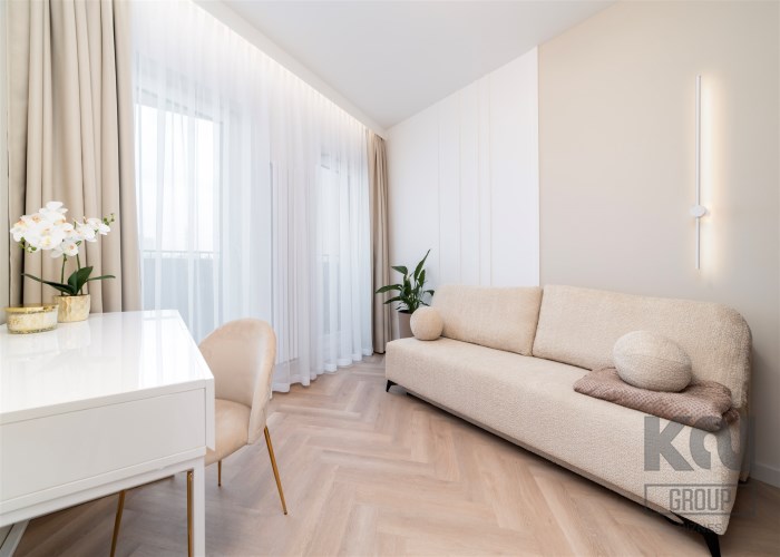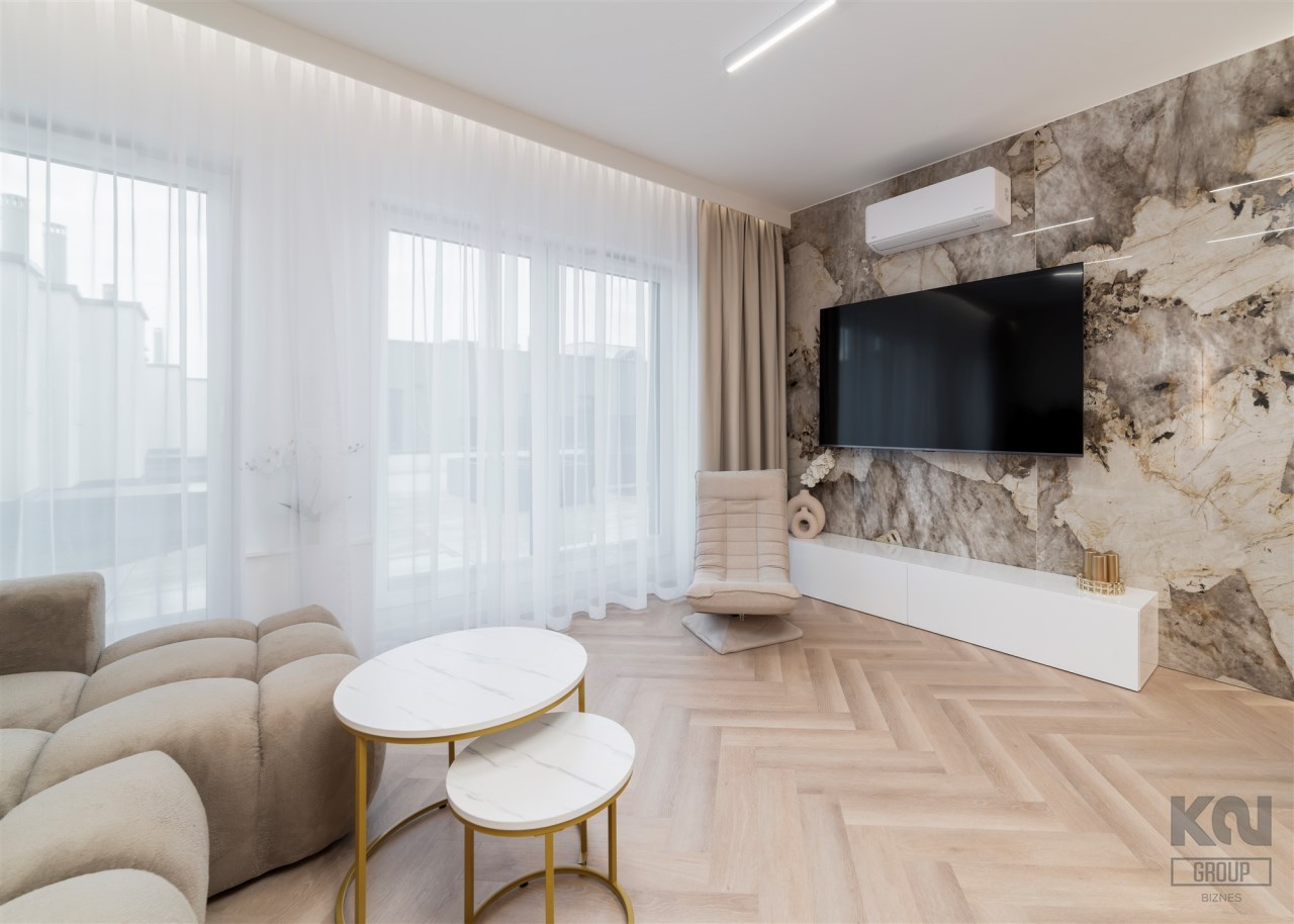 - słoneczny, klimatyzowany salon wyposażony w narożną sofę, fotel, stoliki kawowa, szafkę RTV, TV LED 75", stół i 4 krzesła;