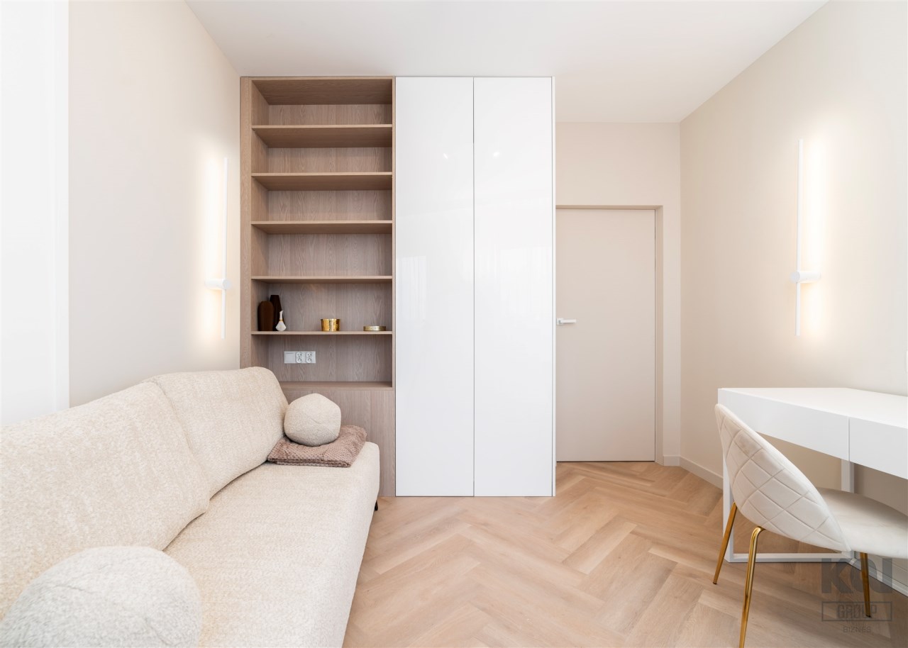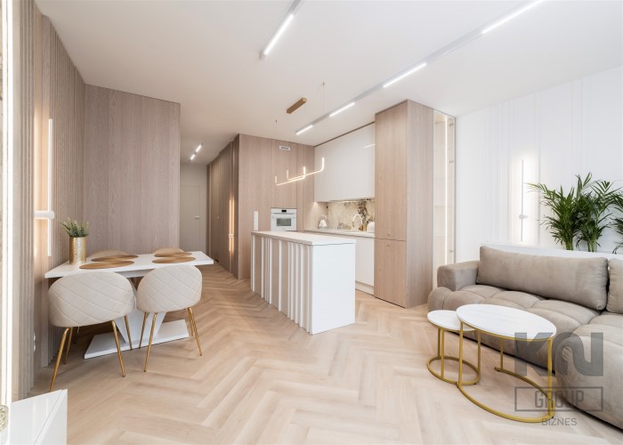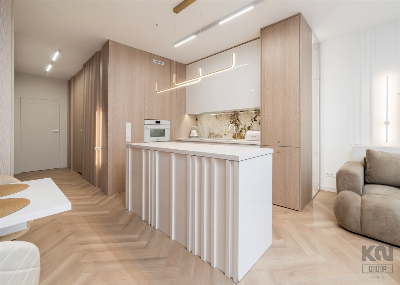 - kompletnie wyposażony aneks kuchenny (płyta indukcyjna, okap, piekarnik z funkcją mikrofali, zmywarka, lodówko-zamrażarka);