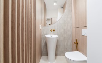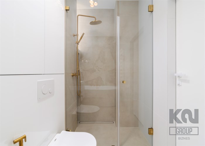 - łazienkę z WC wyposażoną w wannę, kabinę prysznicową i umywalkę;