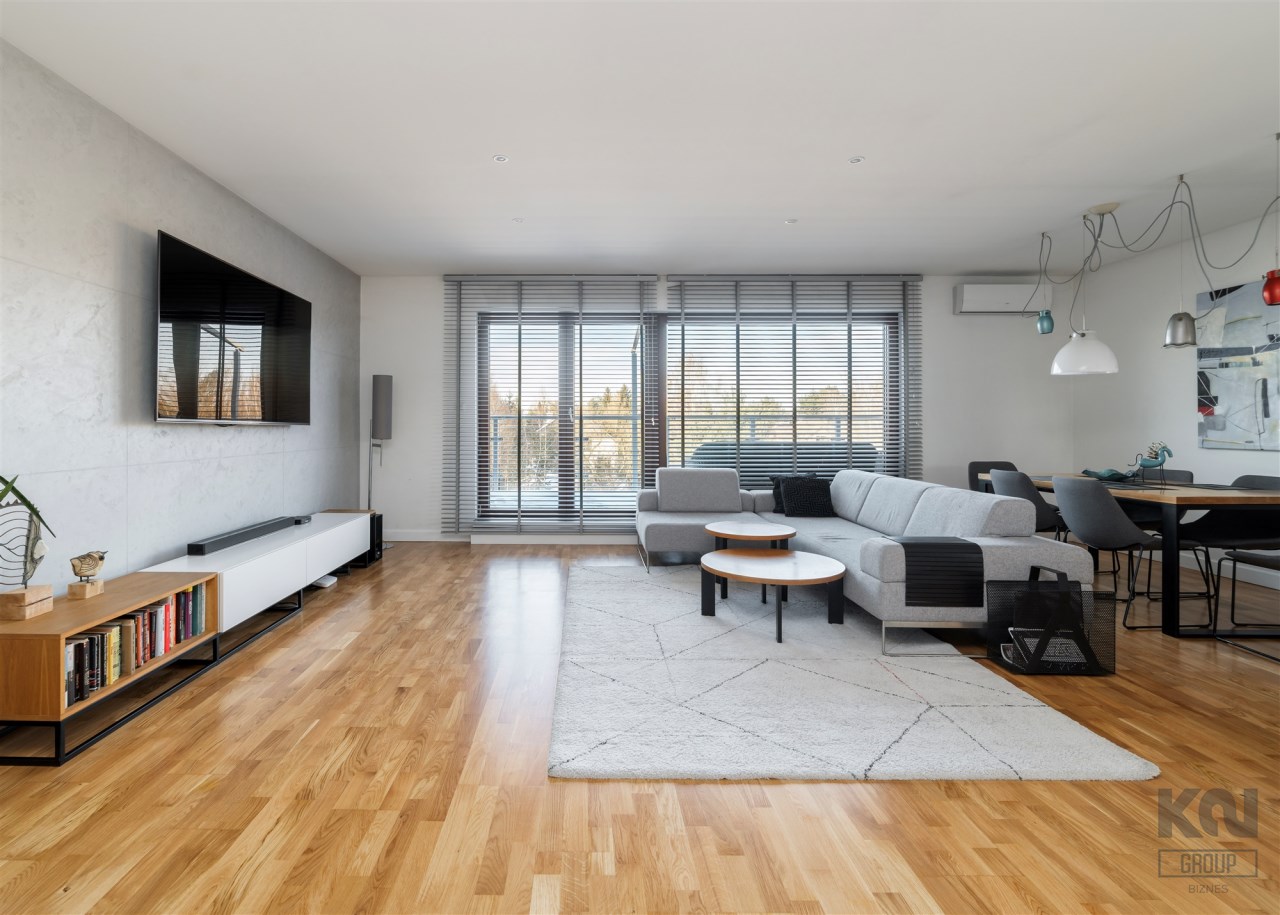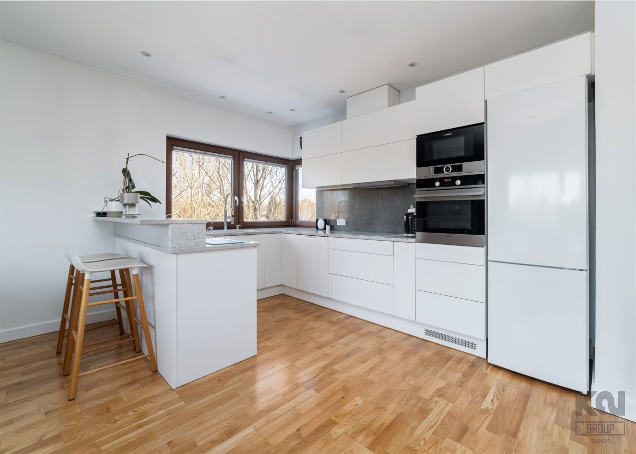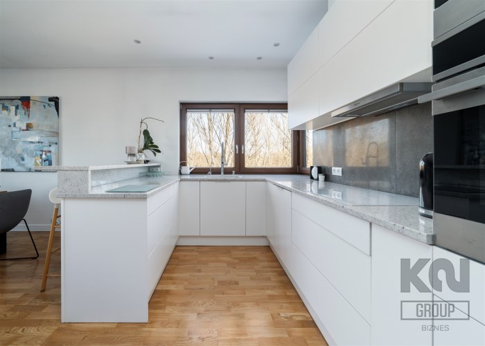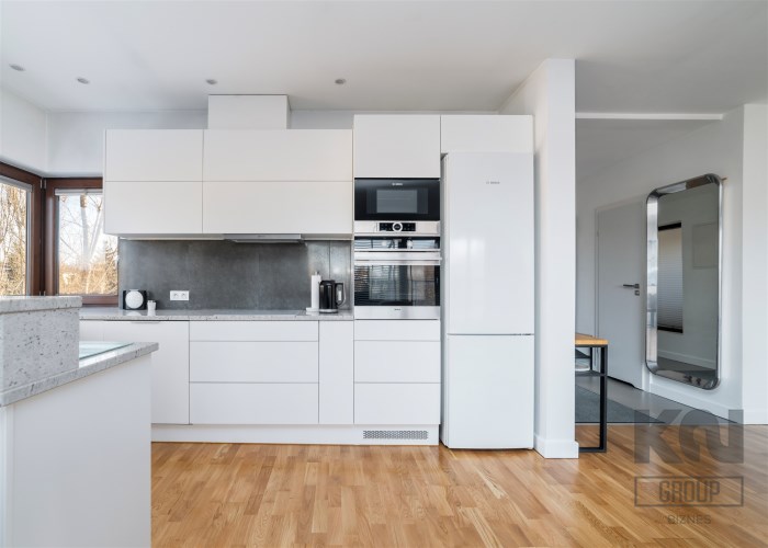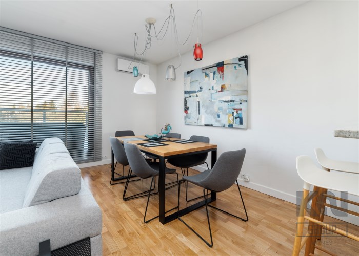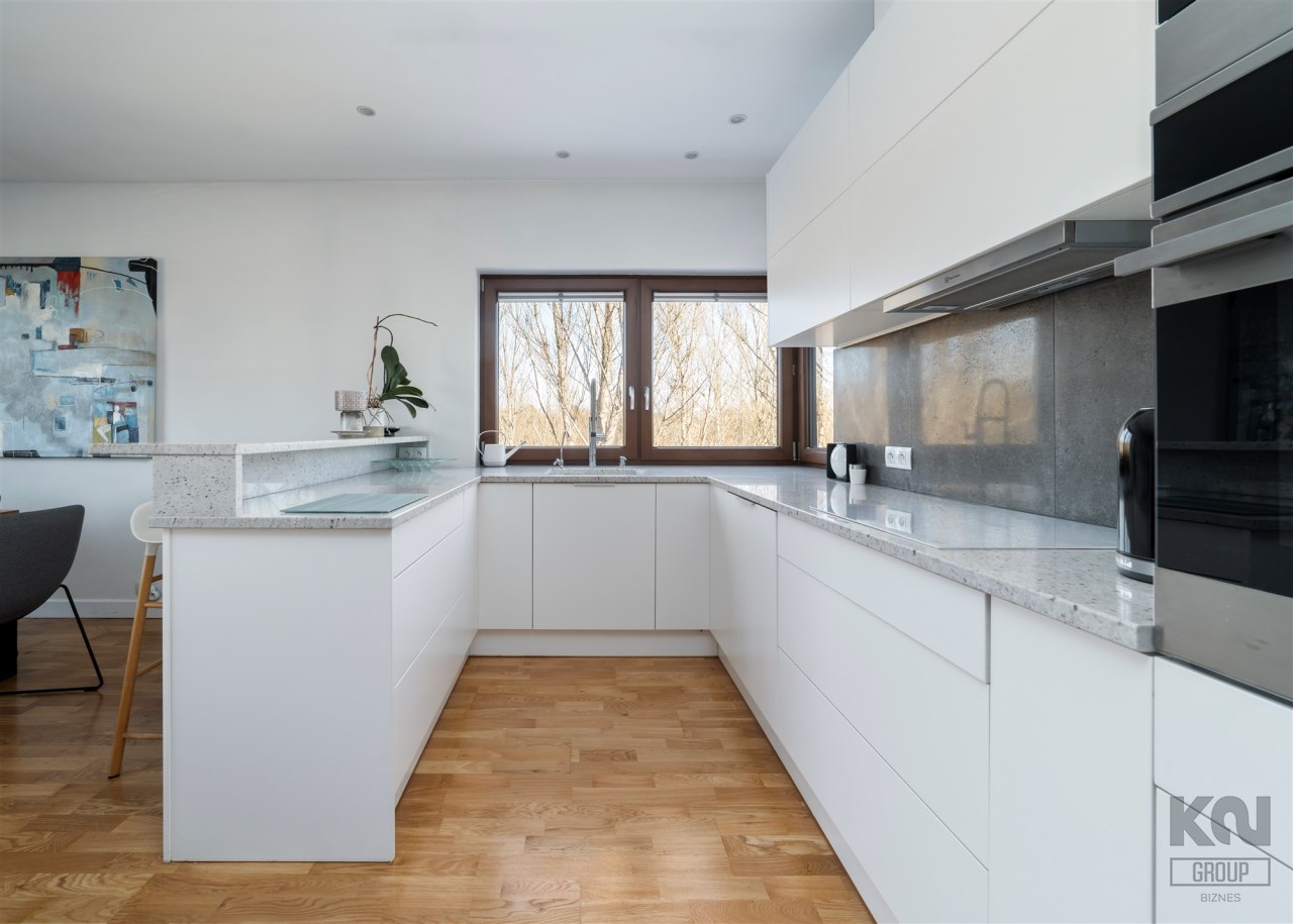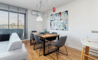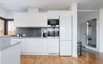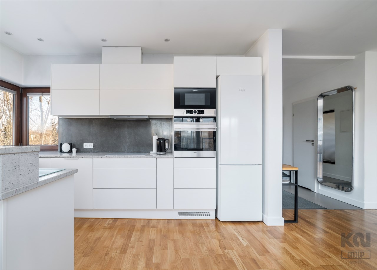 - kompletnie wyposażony aneks kuchenny (płyta indukcyjna, okap, piekarnik, mikrofala, zmywarka, lodówko-zamrażarka);